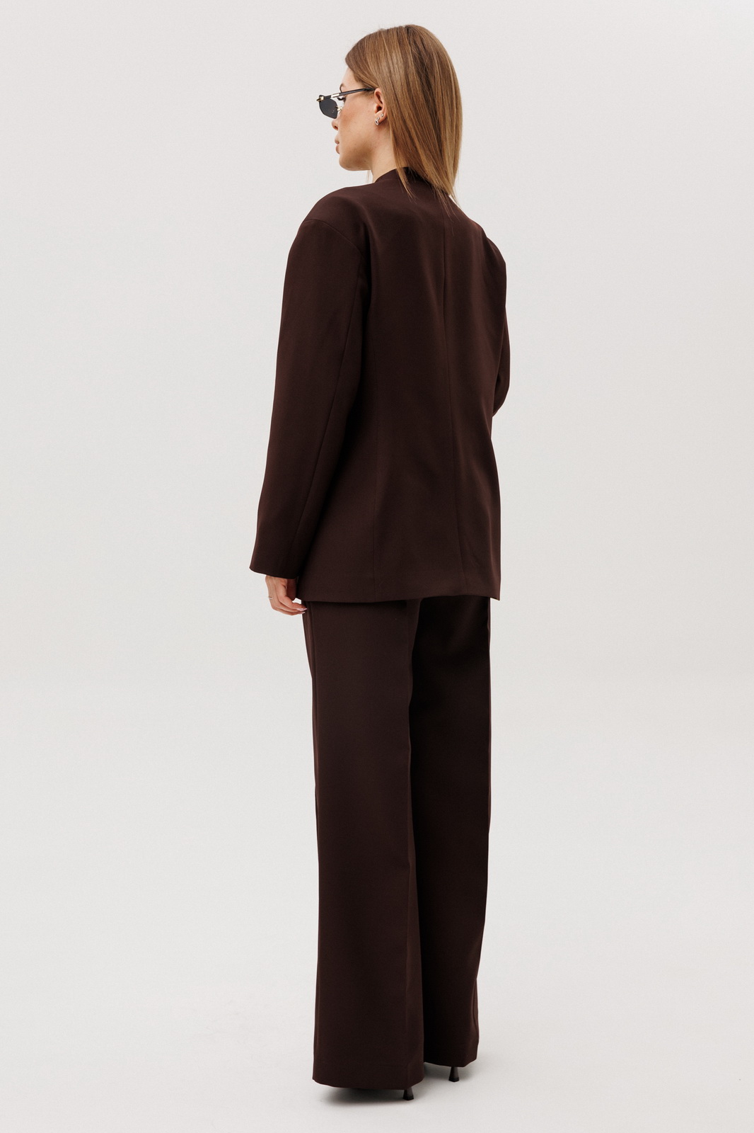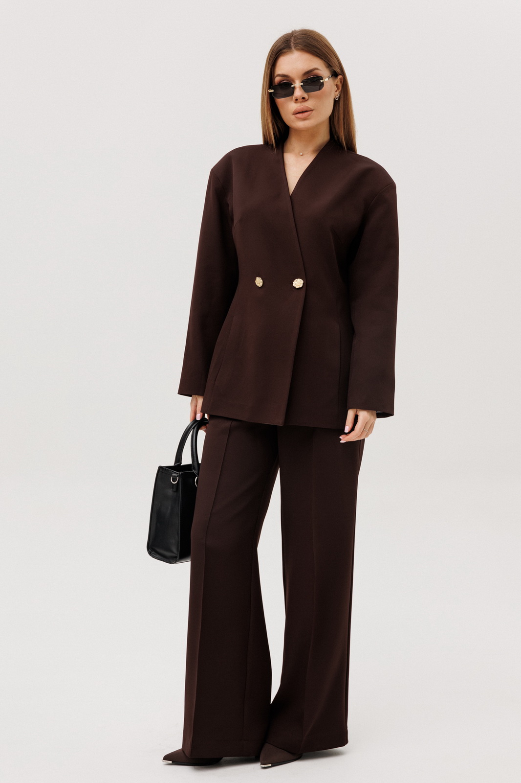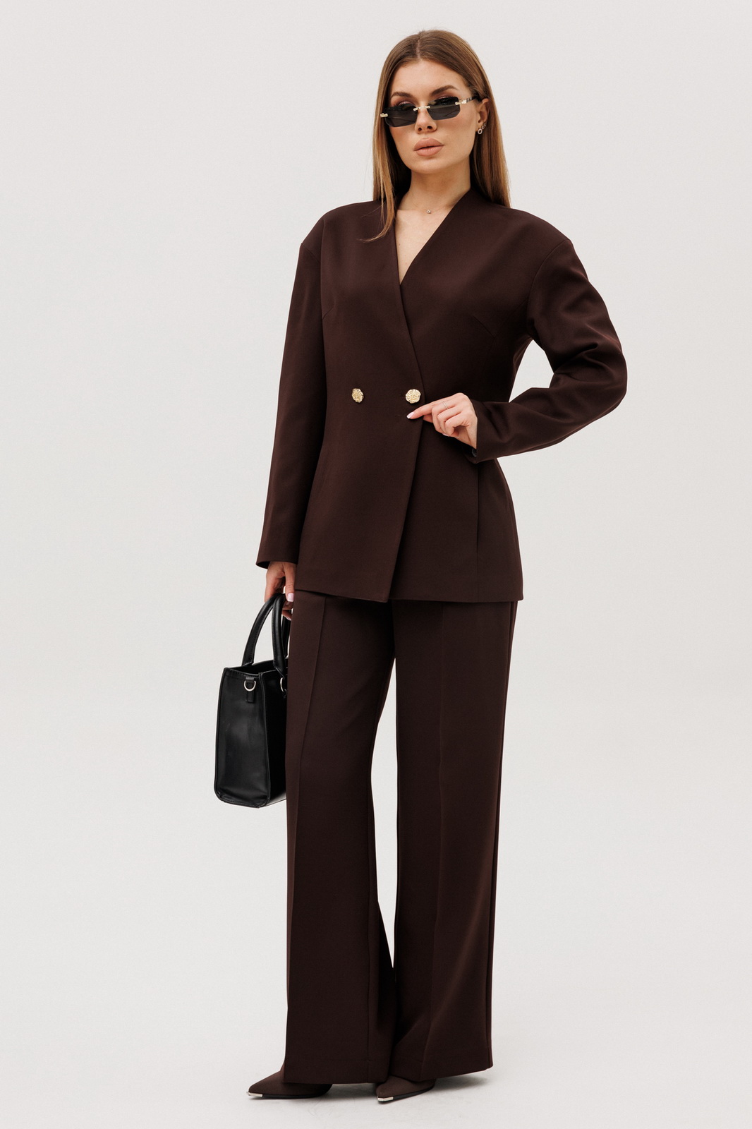 Описание: Элегантный женский костюм насыщенного шоколадного цвета, создающий строгий, но выразительный образ. Костюм состоит из жакета и брюк, выполненных из качественной ткани. Жакет полуприлегающего силуэта обладает спущенными плечами и V-образным вырезом, что добавляет образу изысканности. Функциональные детали включают подкладку, втачные длинные рукава и действующие карманы в рельефах по переду. Застежка на пуговицы . Спинка жакета оформлена средним швом и рельефами для идеальной посадки. Брюки прямого силуэта дополняют ансамбль, предлагая комфорт и свободу движений. Они оснащены притачным поясом и удобной застежкой на тесьму-молнию спереди. Боковые карманы подчёркивают функциональность брюк. Этот костюм идеально подходит как для деловых встреч, так и для выходов в свет, сочетая в себе классику и современные тенденции в женской моде.