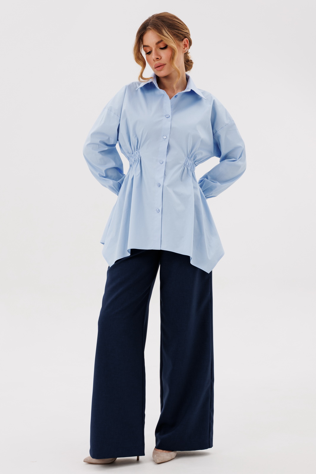 Описание: Рубашка женская А силуэта приталенная за счет резинки на кулисе. Рукав длинный на манжете. Низ фигурный. Брюки прямого силуэта на притачном поясе.По переду застежка на тесьму-молнию.По боковым действующие карманы