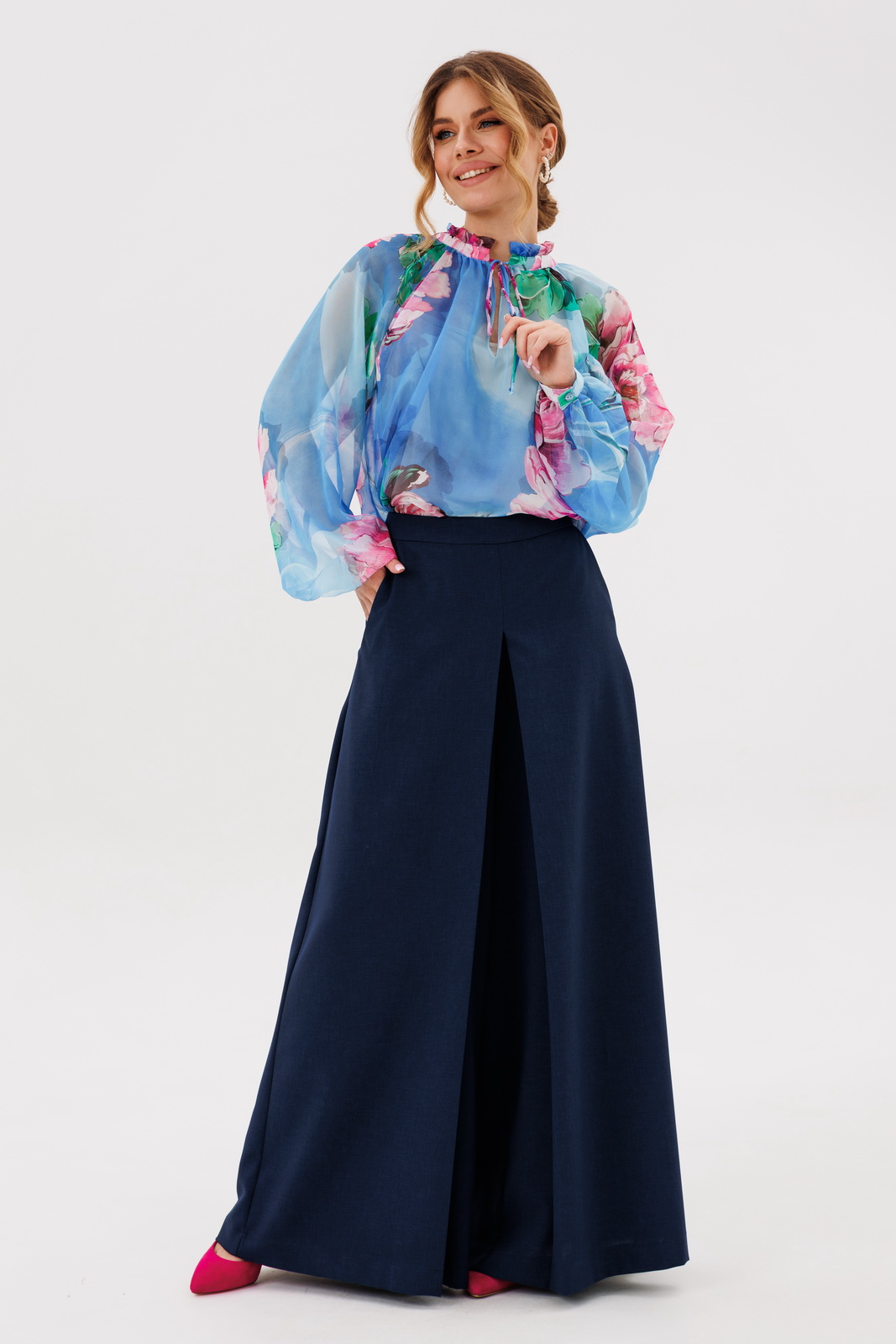 Описание: Блузка свободного силуэта (стиль оверсайз) с рукавом реглан. Горловина с разрезом спереди и притачной планкой с рюшей. Рукав на манжете..Юбка-брюки А-СИЛУЭТА С ЗАСТЕЖКОЙ НА ПОТАЙНУЮ ТЕСЬМУ МОЛНИЮ С ПРИТАЧНЫМ ПОЯСОМ И КАРМАНАМИ СПЕРЕДИ. ПО ПЕРЕДУ ВСТРЕЧНАЯ СКЛАДКА.
