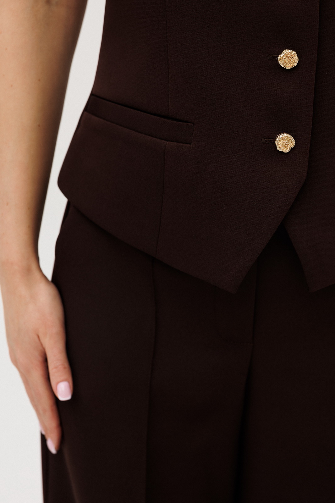 Описание: Костюм двухпредметный состоящий из жилета и брюк .Жилет прилегающего силуэта,с V- образным вырезом, на подкладке. По переду рельефа карманы “листочки”, застёжка на петли-пуговицы. По спинке вытачки.Элегантные женские брюки прямого кроя ,по переду на брючинах стрелки. Модель с высокой посадкой на притачном поясе обеспечивает идеальное прилегание. Спереди расположена практичная застежка на тесьму-молнию, добавляющая удобства при носке. Брюки укомплектованы функциональными боковыми карманами, что придает модели дополнительную практичность и удобство. Эта модель идеально подойдет как для офиса, так и для создания повседневных стильных образов.