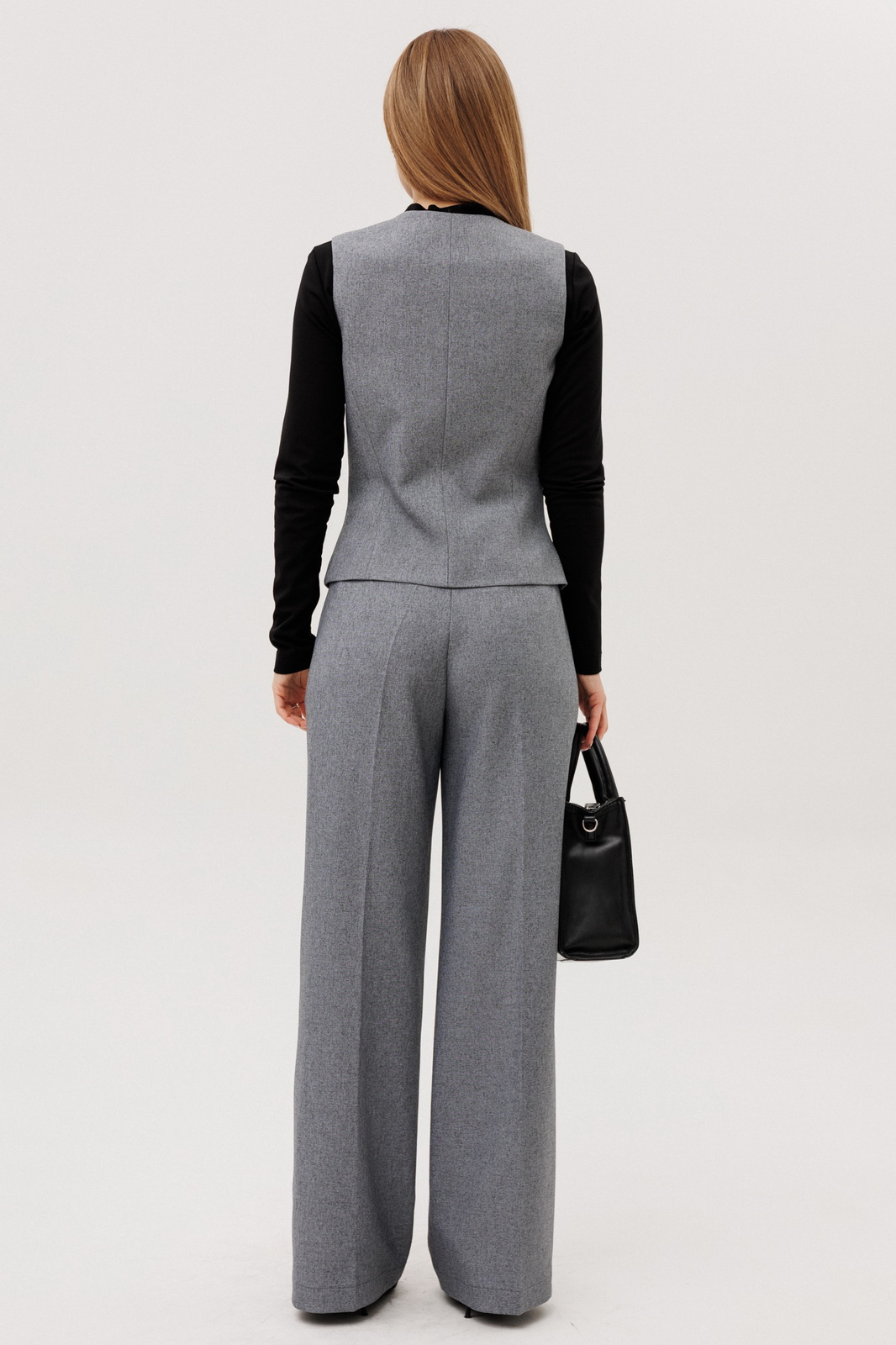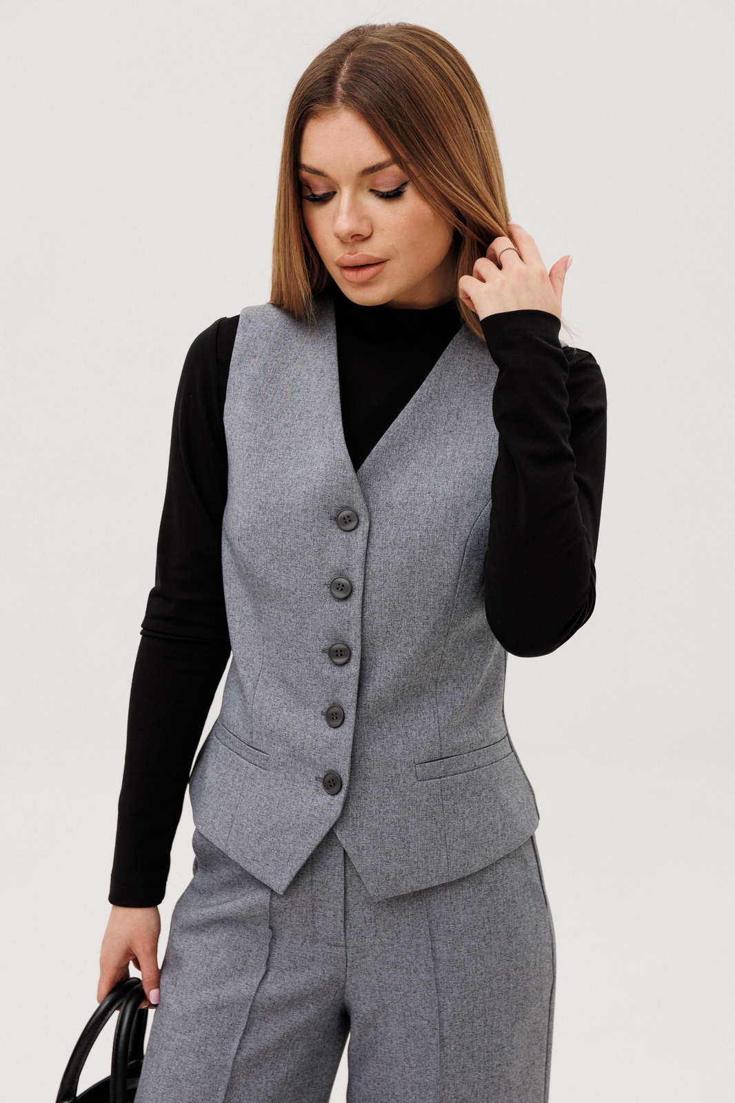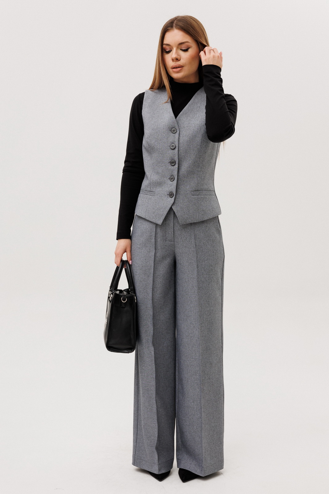 Описание: Костюм трехпредметный состоящий из жилета,гольфа, брюк .Жилет прилегающего силуэта,с V- образным вырезом, на подкладке. По переду рельефа карманы “листочки”, застёжка на петли-пуговицы. По спинке вытачки.Джемпер женский прилегающего силуэта с втачным одношовным рукавом с воротником-стойкой.Элегантные женские брюки прямого кроя ,по переду на брючинах стрелки. Модель с высокой посадкой на притачном поясе обеспечивает идеальное прилегание. Спереди расположена практичная застежка на тесьму-молнию, добавляющая удобства при носке. Брюки укомплектованы функциональными боковыми карманами, что придает модели дополнительную практичность и удобство. Эта модель идеально подойдет как для офиса, так и для создания повседневных стильных образов.
