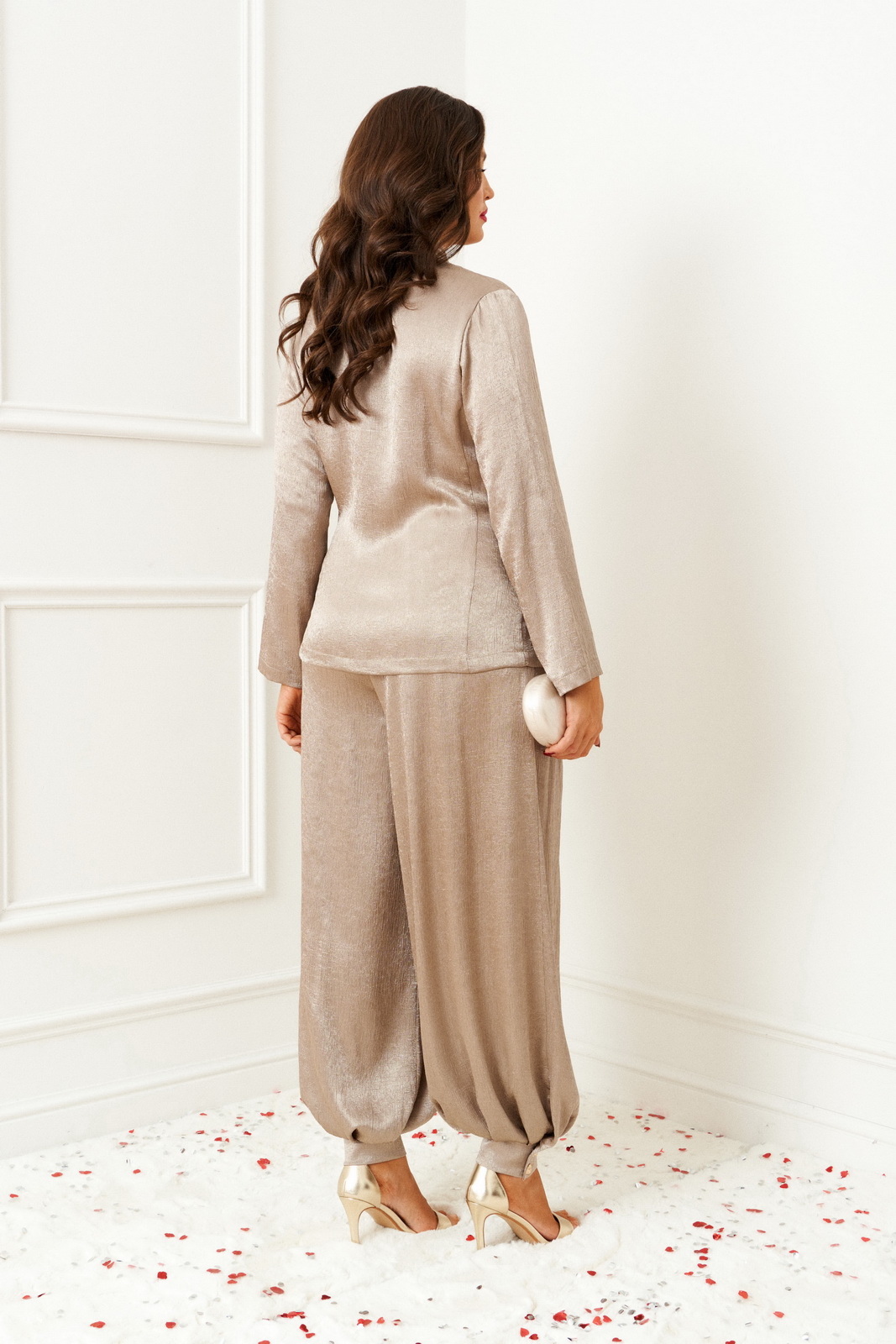 Костюм состоит из 2-х предметов одежды: жакета и брюк. Выполнен из атласной ткани стильного дизайна крэш.