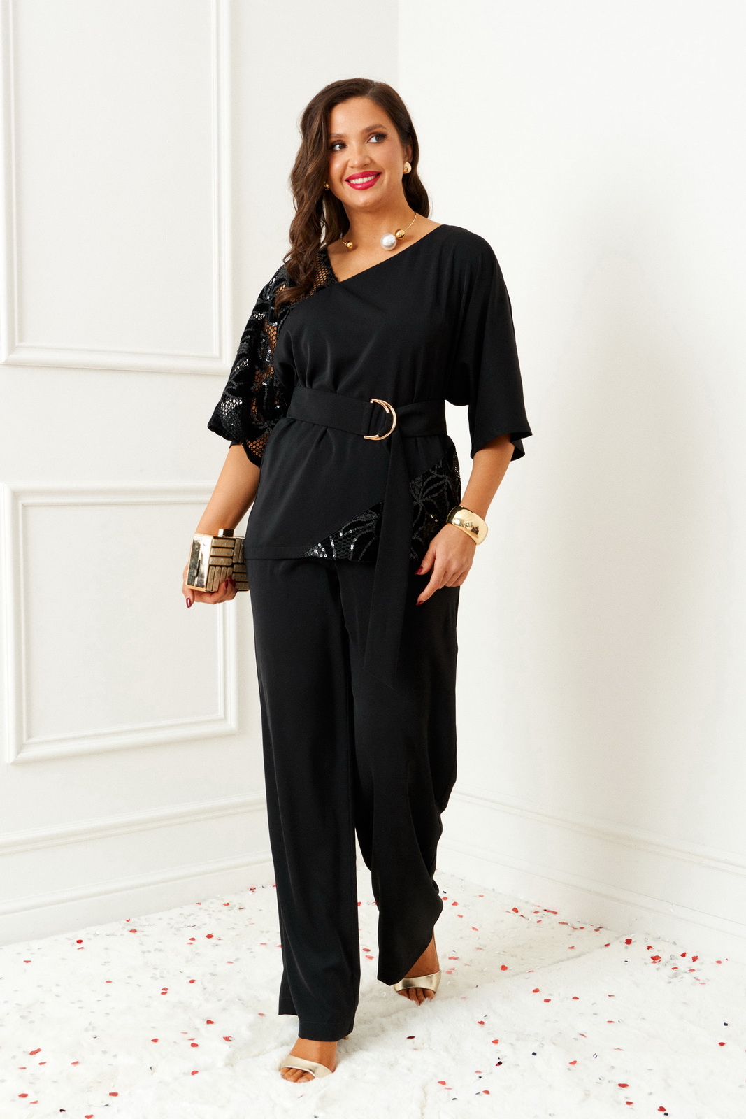 Изысканный костюм состоит из 2-ух предметов: блузки и брюк. Выполнен из эластичного полотна в сочетании с кружевом. Основная ткань нежная, гладко-бархатистой фактуры, приятная на ощупь, она легко драпируется и очень выгодно и дорого подчёркивает образ; отделочная ткань придает праздничный шарм.