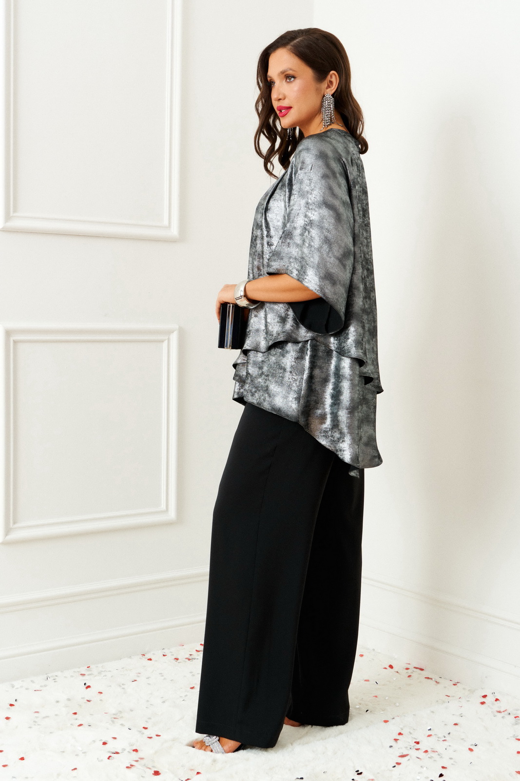 Описание: Готовимся к главной ночи года! Брючный костюм из мягкого крепа в сочетании с авторским ворсовым шифоном идеально подходит для торжественных выходов и не только!