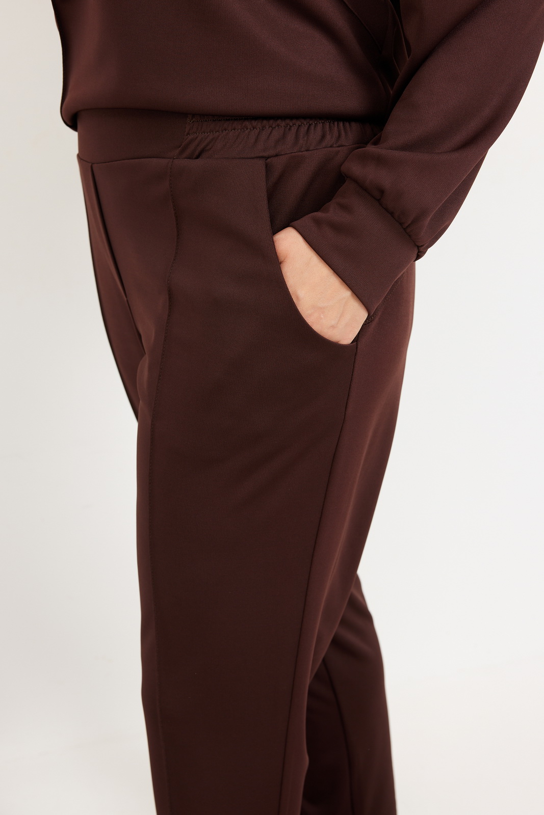 Брюки полуприлегающего силуэта, с застроченной стрелкой по линии переда. Пояс на резинке с островком для Вашего удобства. В боковых швах карманы «Хулиганы». Низ обработан классическим способом вподгибку.