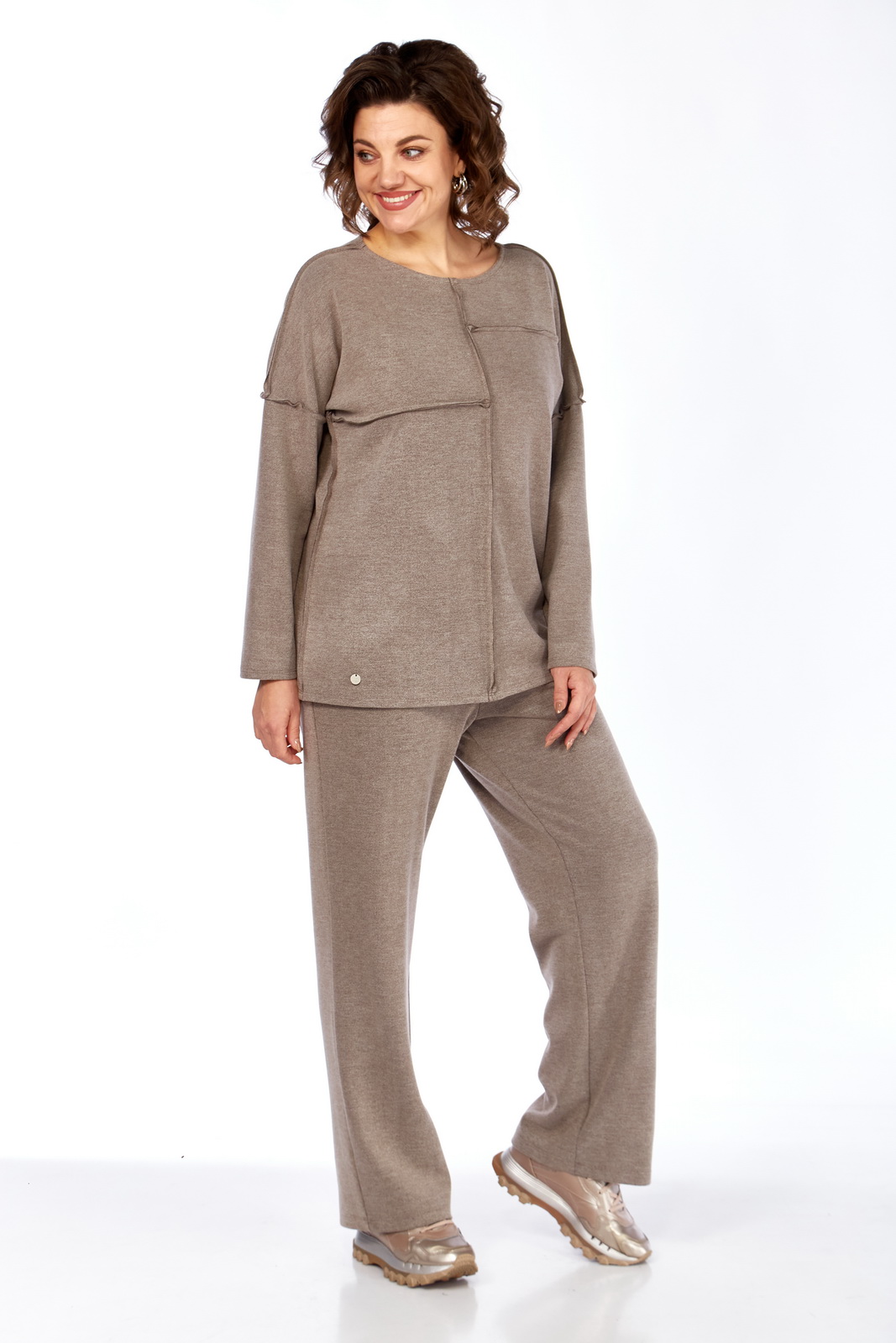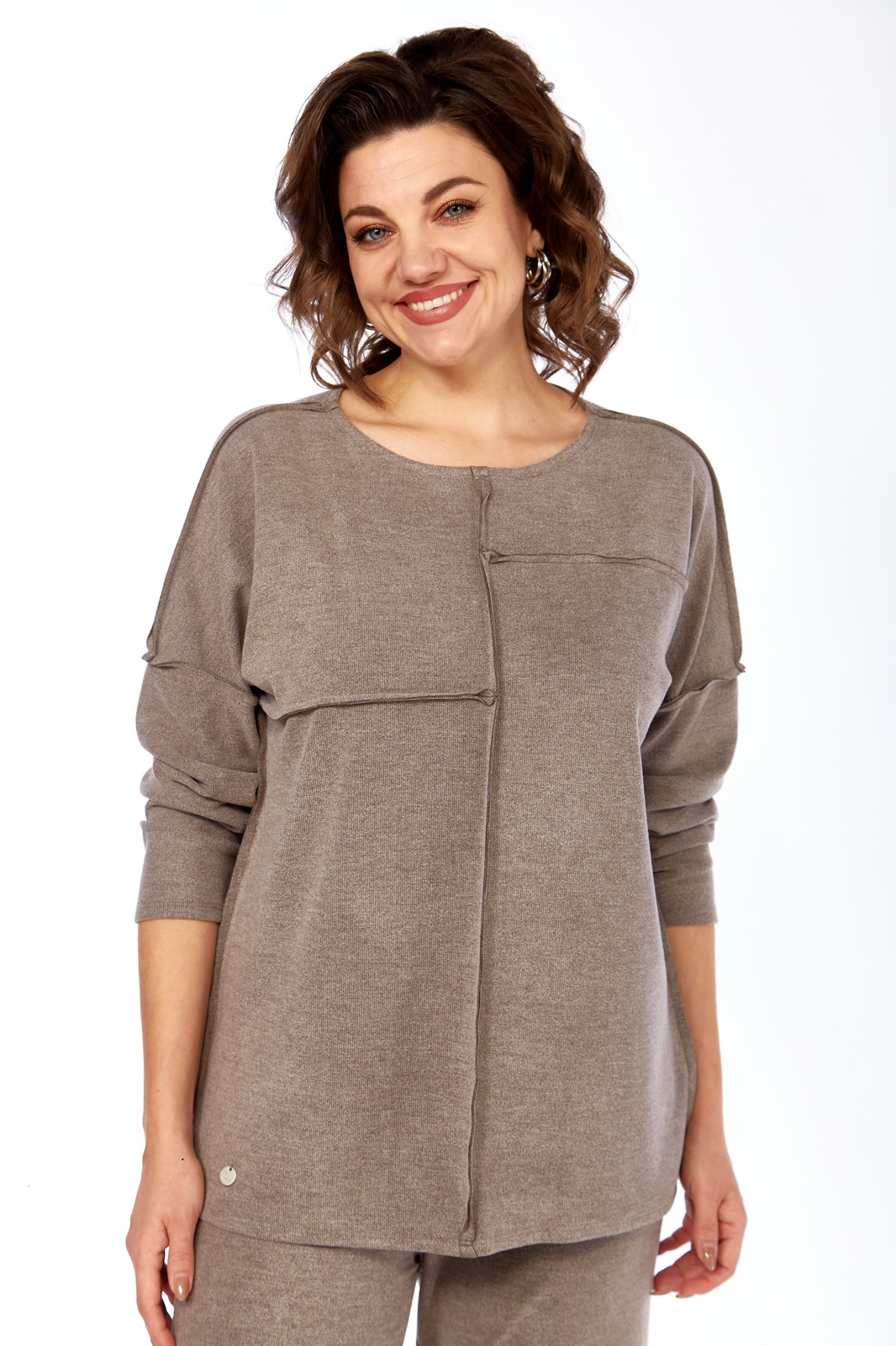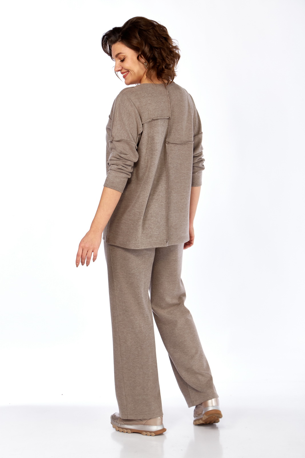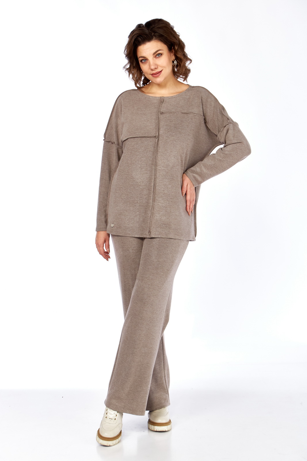 Описание: Комплект брючный : джемпер и брюки из трикотажного полотна. Джемпер с разрезными на 4 части передом и спинкой,швы обработаны припусками на лицо. Горловина округллой формы обработана распошивочным швом. Низ рукава и изделия тоже обработаны распошивочным швом. Брюки прямые. Цельнокроенный пояс на резинке.