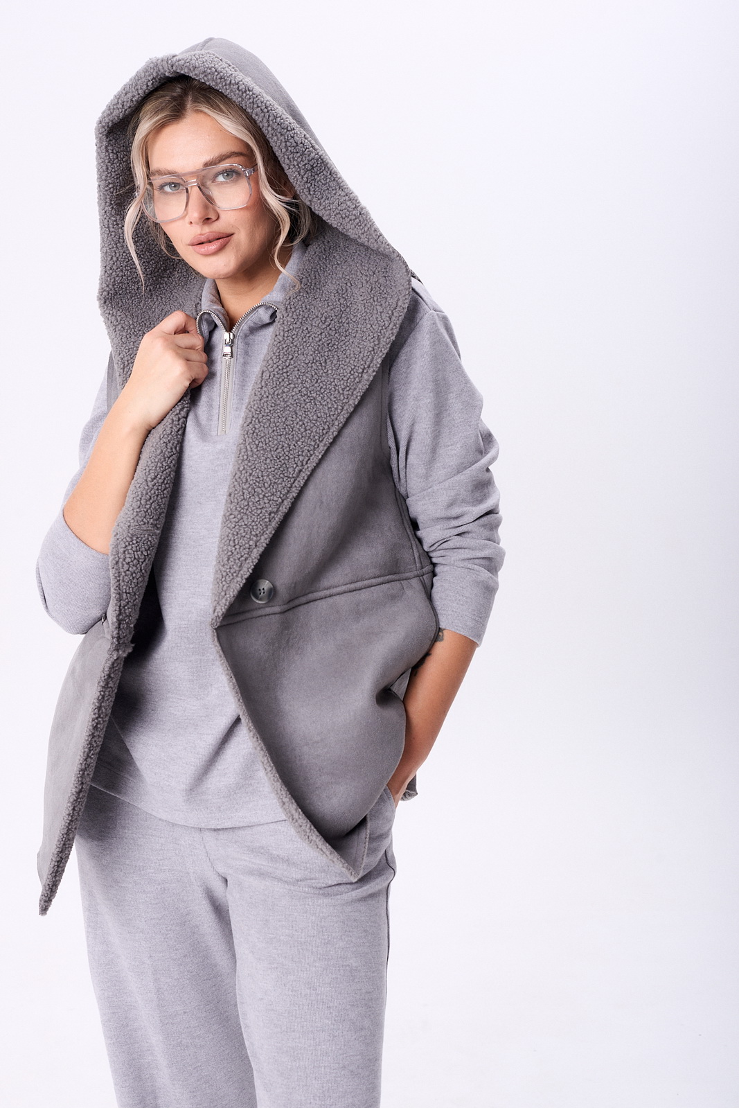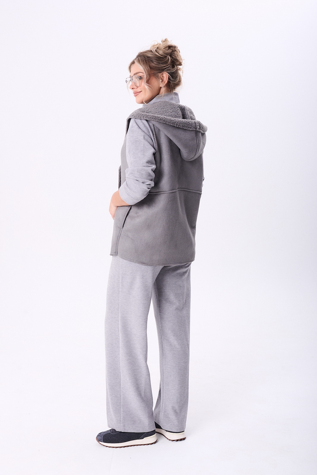 Описание: Комплект брючный состоит из кофты, жилетки и брюк. Кофта полуприлегающего силуэта со спущенным плечом, рукав втачной, одношовный. Воротник стойка с застежкой на тесьму-молнию. По боковым швам разрезы. Брюки расширенные книзу, верхний срез обработан поясом с резинкой. В боковых швах карманы. Жилетка свободного кроя со смещенной застежкой на петлю и пуговицу. По спинке горизонтальный рельефный шов на перед, в котором обработаны карманы. Цельнокроенный капюшон с центральной частью. В качестве отделки используется фурнитура.
