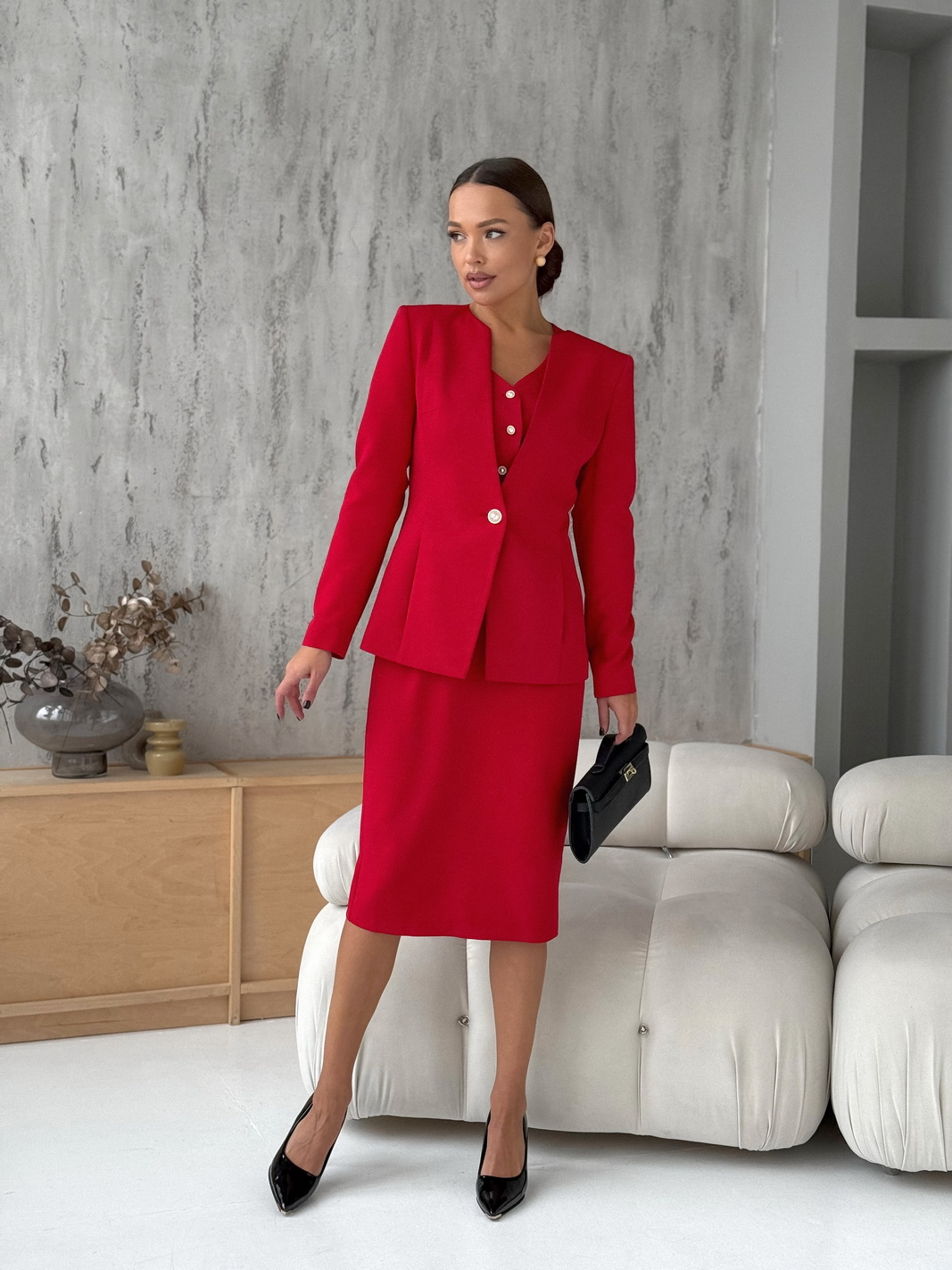 Описание: Костюм женский двух-предметный, состоящий из платья и жакета.