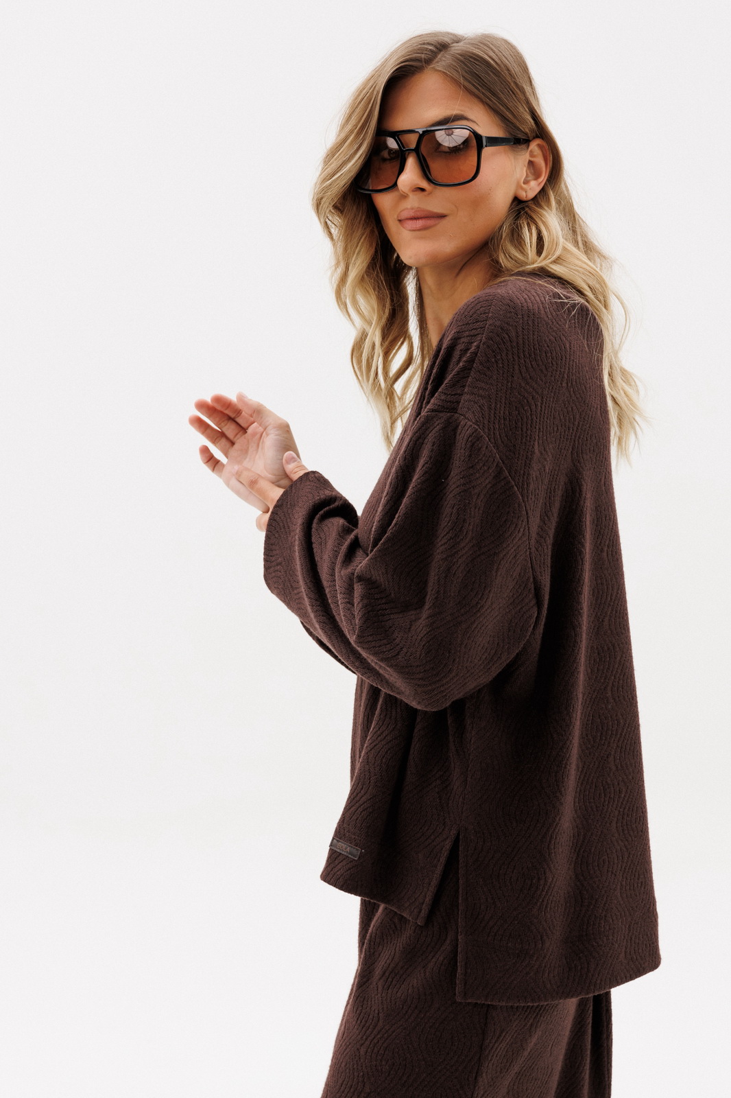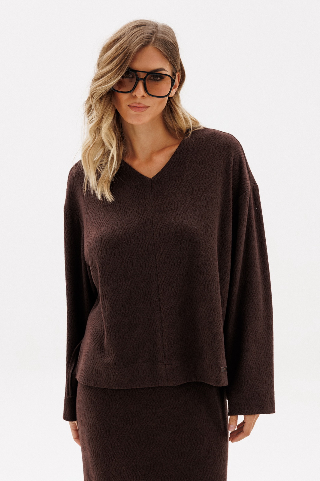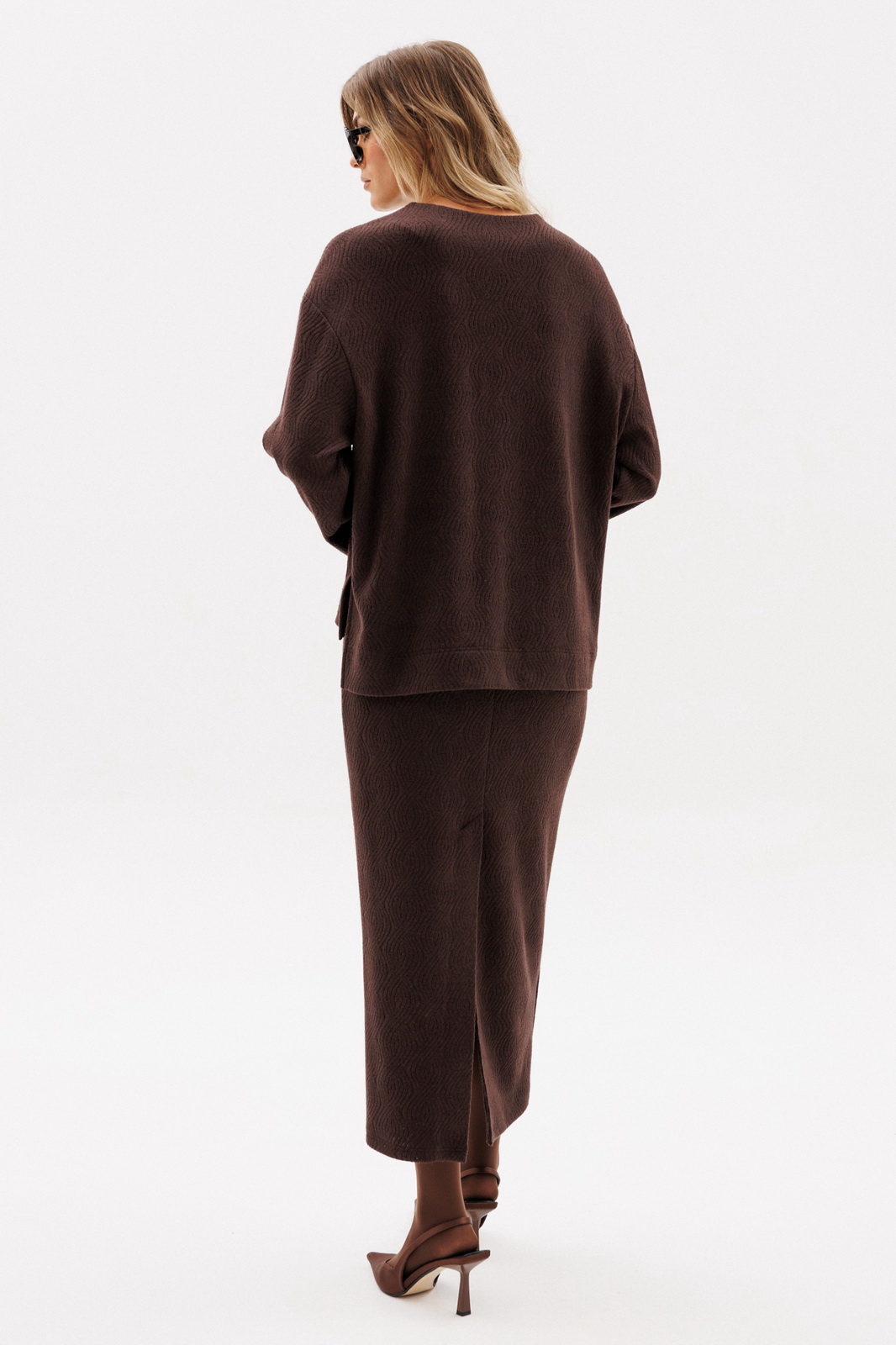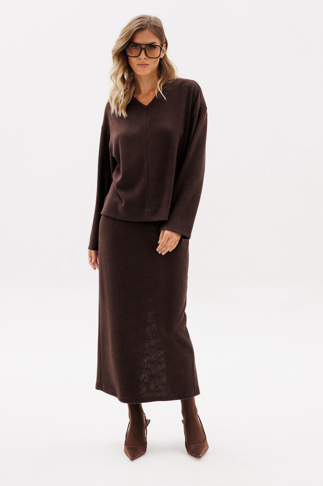 Описание: Комплект: джемпер + юбка. Комплект выполнен из трикотажного полотна с рисунком. Джемпер прямого силуэта, длиной до линии бедра. Перед со средним швом. Спинка цельная. Горловина V-образной формы. Плечевой шов спущен. Рукав рубашечного покроя, одношовный. В боковых швах разрезы. Спинка длиннее переда. Юбка слегка заужена к низу, на цельнокроенном поясе с эластичной тесьмой, длиной миди. Юбка без подкладки, сзади шлица в среднем шве.