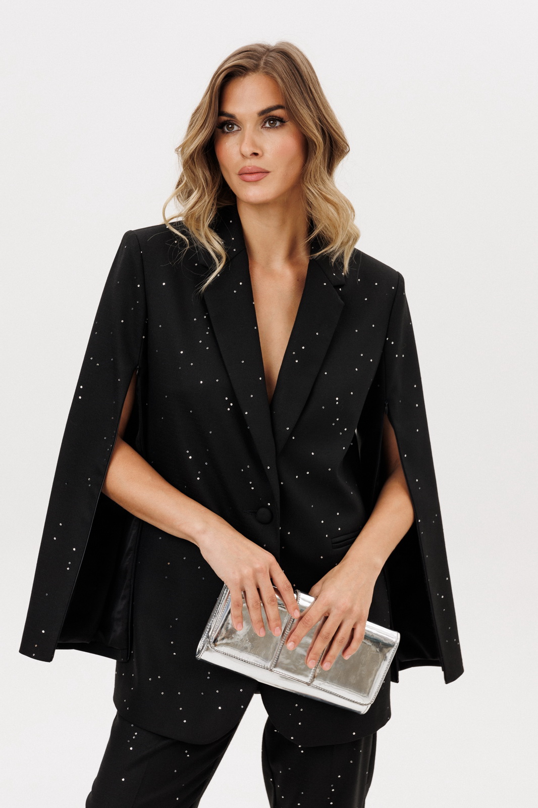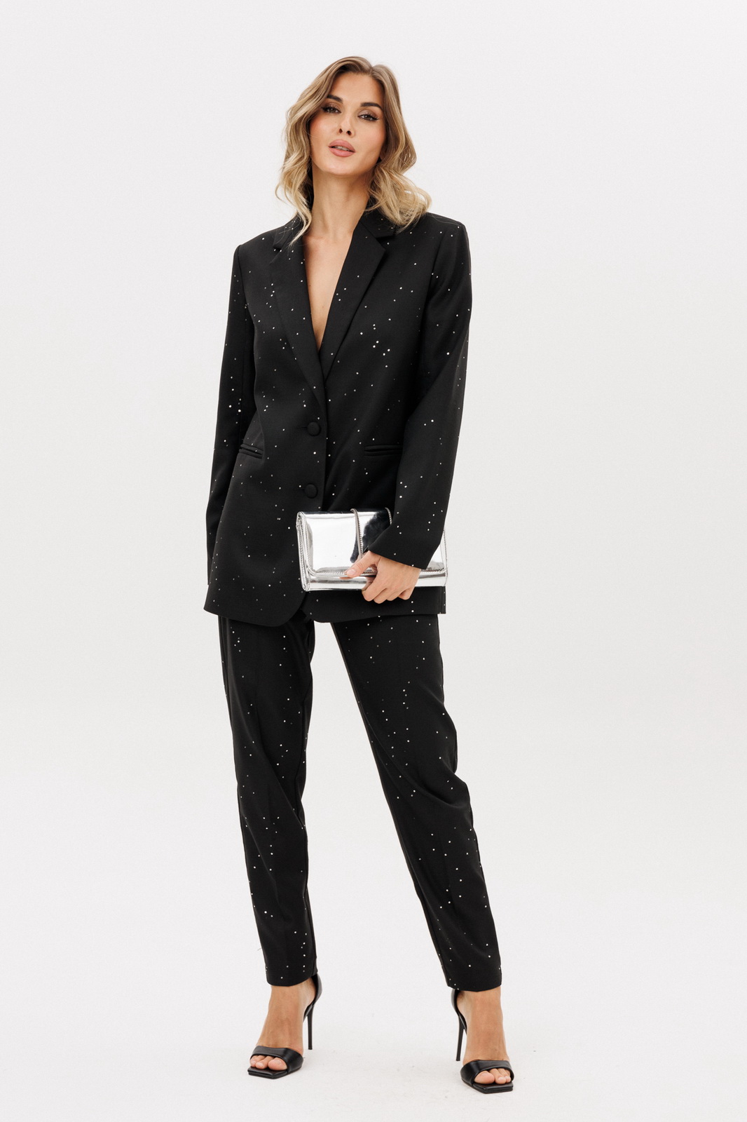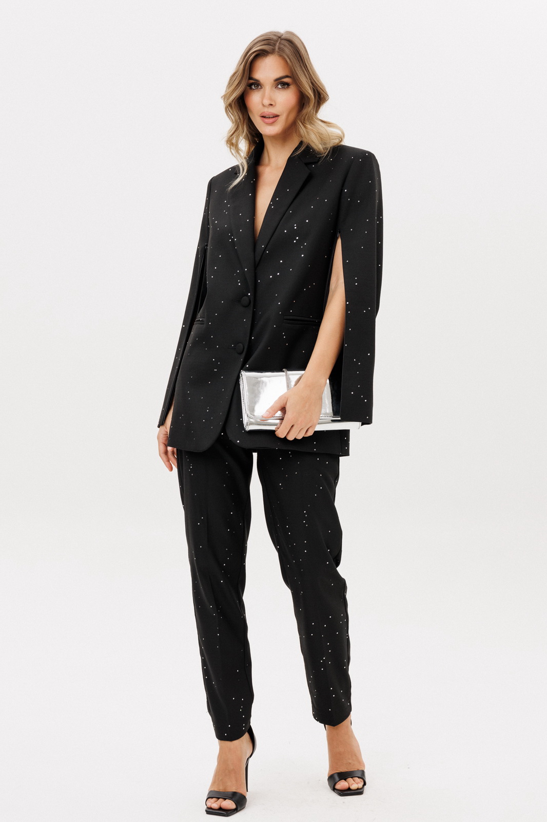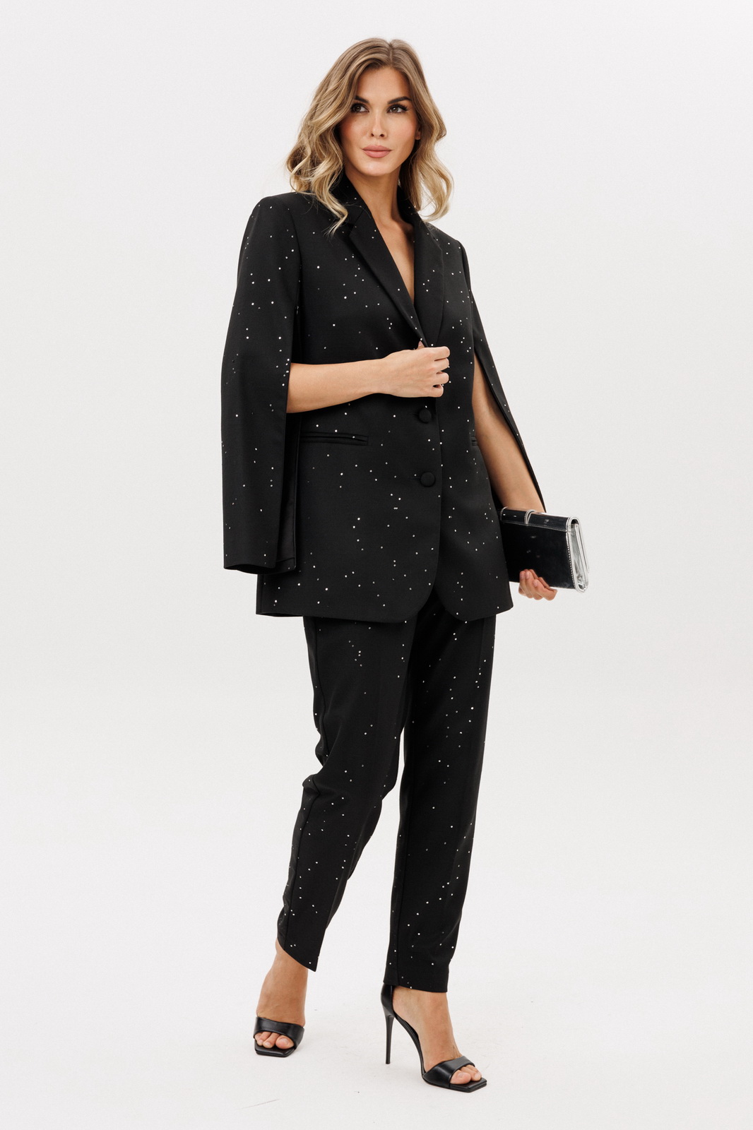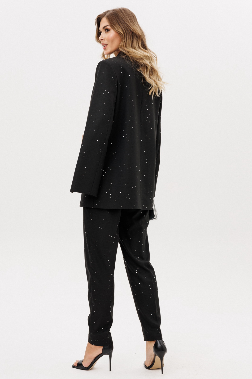Описание: Комплект: жакет + брюки. Комплект выполнен из костюмной ткани с пайетками. Жакет прямого силуэта, длиной до линии бедер. Спереди застежка на пуговицы и прорезные карманы. Жакет по низу закругленной формы. На спинке средний шов. Воротник пиджачного типа. Рукав втачной, двухшовный, декорирован потайной молнией. Жакет на притачной по низу подкладке. Брюки зауженные к низу, длиной 7/8, на притачном поясе. Спереди боковые карманы с наклонным входом и застежка на молнию. Сзади декоративные карманы с листочкой.