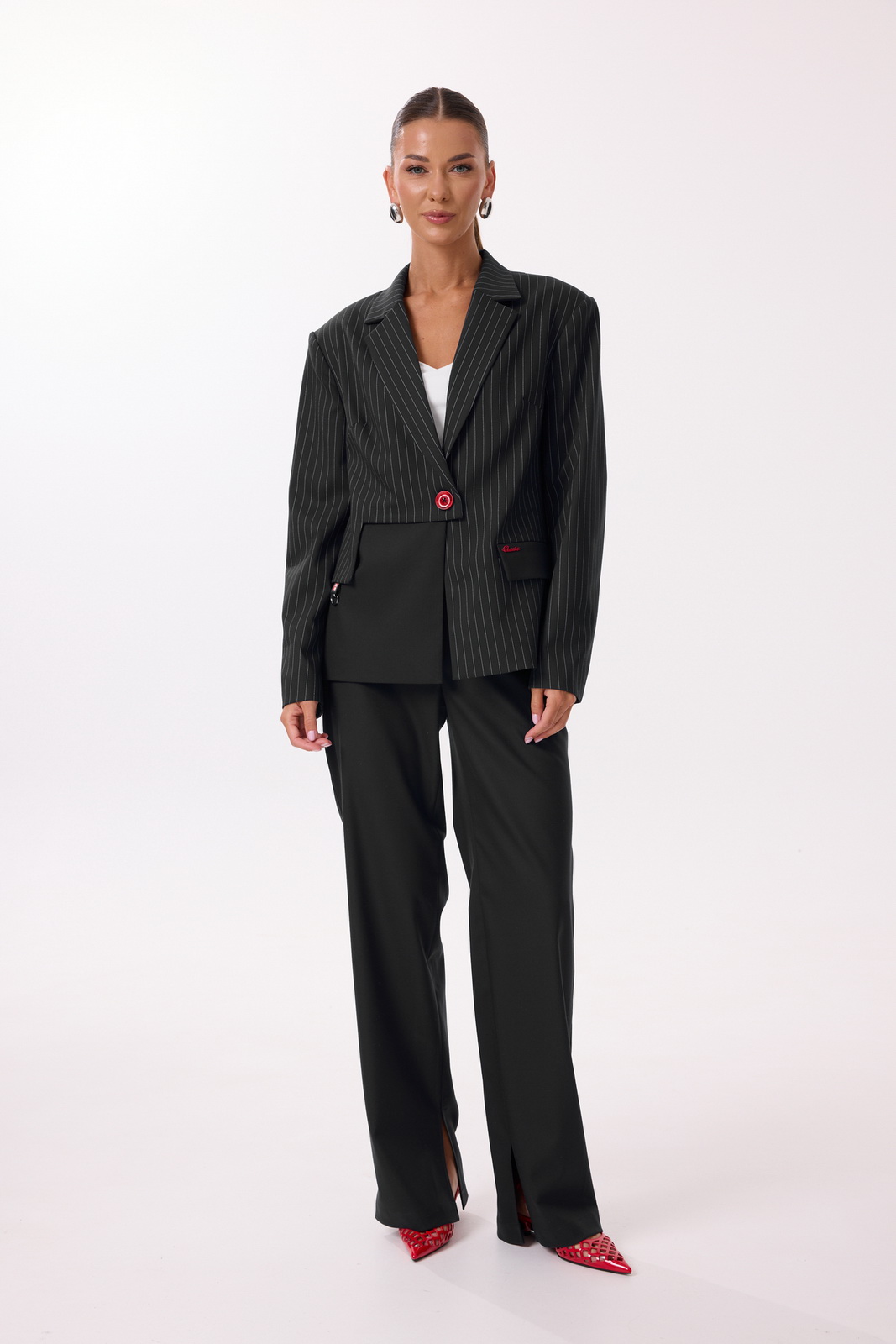Описание: Костюм женский, состоящий из жакета на подкладке и брюк. Жакет прямой с центральной бортовой застежкой на петлю и пуговицу. Правая и левая часть переда асимметричны. Правая верхняя часть переда с отлетной асимметричной кокеткой выполнена из основной ткани . Нижняя часть выполнена из ткани-компаньона. Левая часть переда выполнена из основной ткани, прорезной карман с клапаном (декорирован металлическим украшением) и листочкой выполнен из ткани-компаньона. Спинка цельнокроеная. Плечо слегка спущено. Рукав длинный двухшовный. По горловине воротник пиджачного типа. Брюки прямые, выполнены из ткани-компаньона. По переду обработаны карманы с наклонным входом с листочкой, застежка на молнию. По задним половинкам застрочены вытачки. По шаговым срезам брюк расположены разрезы. Верх обработан притачным поясом(частично на резинке), застегивающимся на петлю и пуговицу. Декоративные элементы и фурнитура могут отличаться от заявленных на фото. Цвет материала может отличаться по тону в зависимости от настроек вашего монитора!