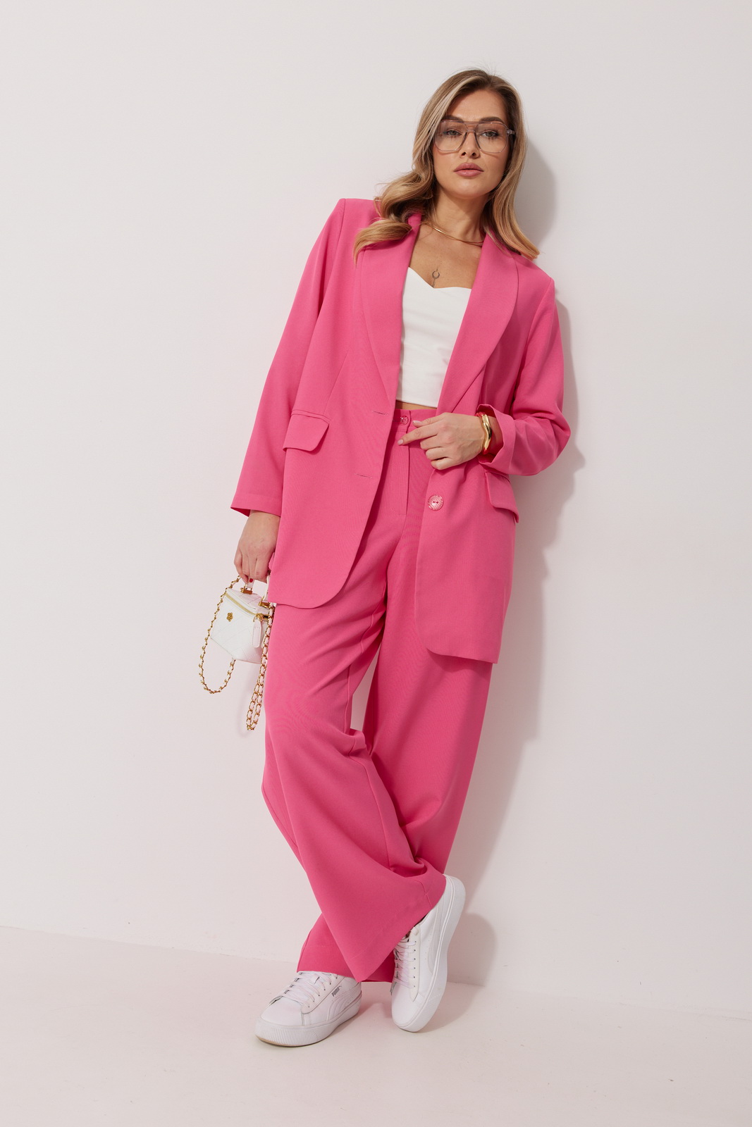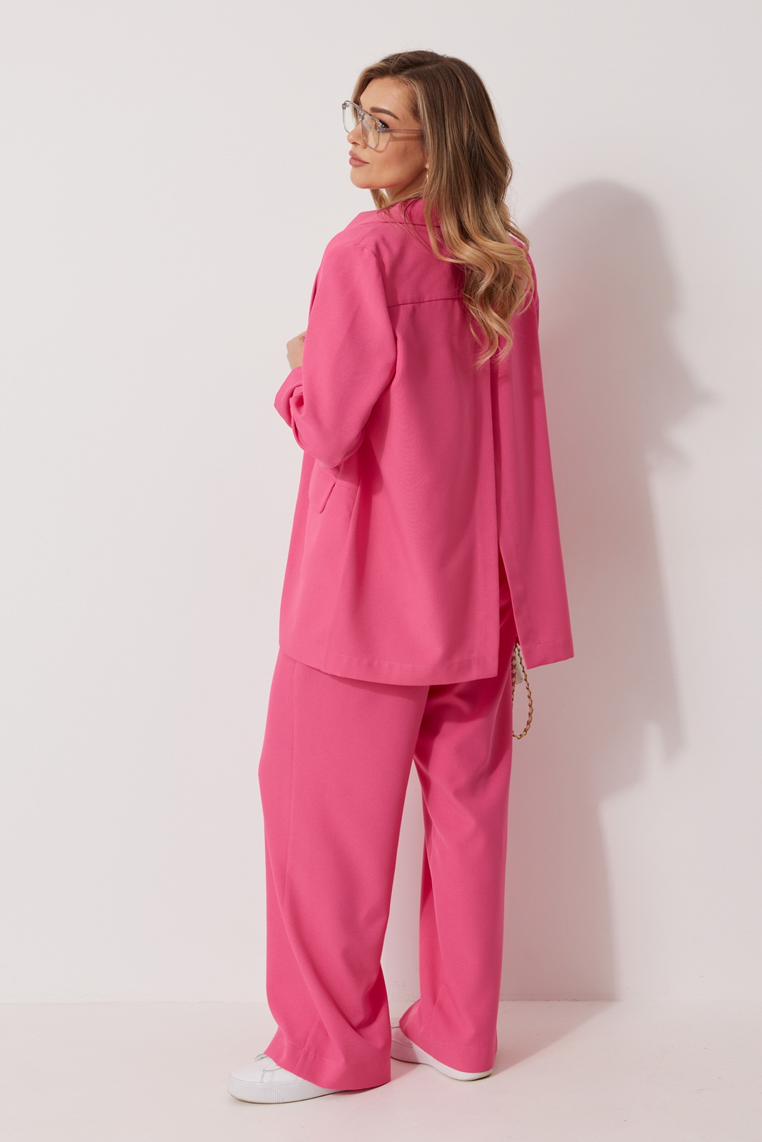 Описание: Костюм женский состоящий из жакета и брюк. Жакет прямого силуэта, на частичной подкладке длиной за линию бедра. По полочке разрезная вытачка и подрез. В подрезе обработан прорезной карман «в рамку» с клапаном. Детали спинки разрезные, по верхнему срезу заходят друг на друга. Верх спинки обработан отрезной кокеткой. Рукав полной длины, двухшовный без подкладки. Горловина жакета обработана шалевым воротником. Брюки женские, прямого силуэта. По переду заложены складки и обработана застежка на молнию. Карманы расположены в боковом шве. На задних половинках брюк застрочены вытачки. Верх обработан широким притачным поясом (частично на резинке), застегивающимся на петлю и пуговицу.