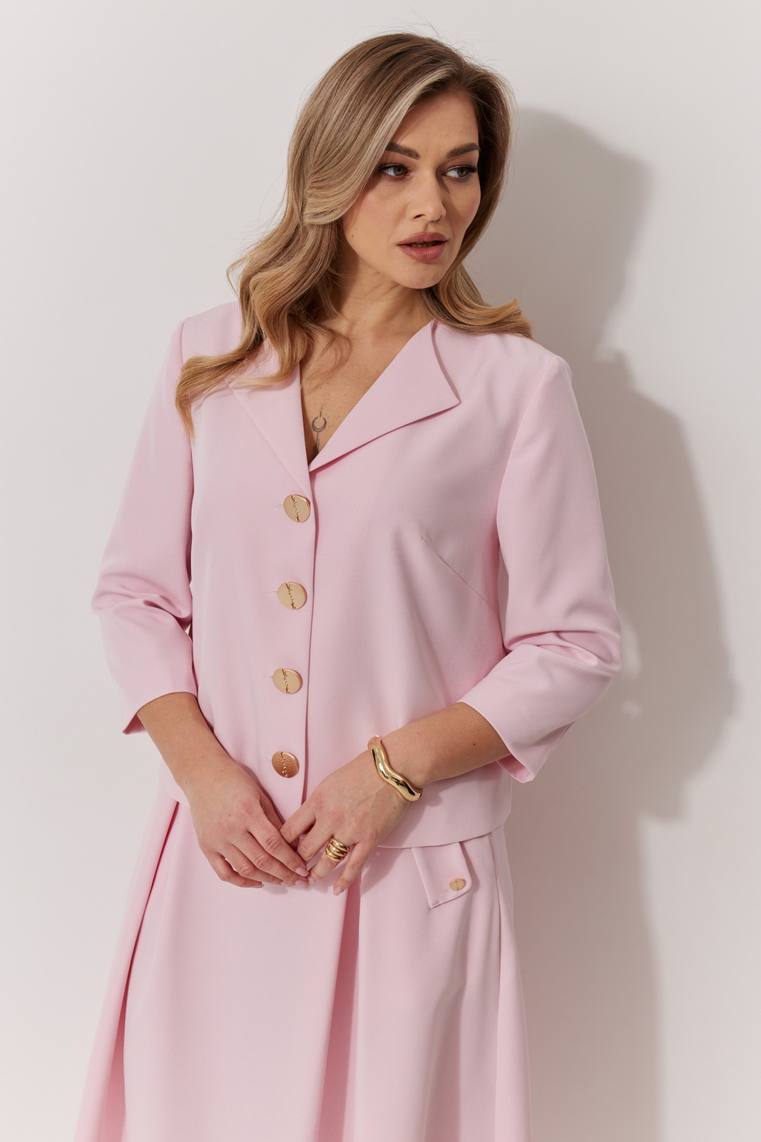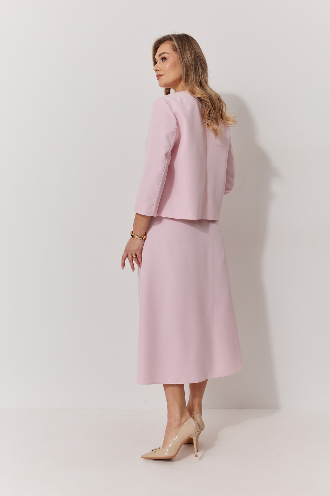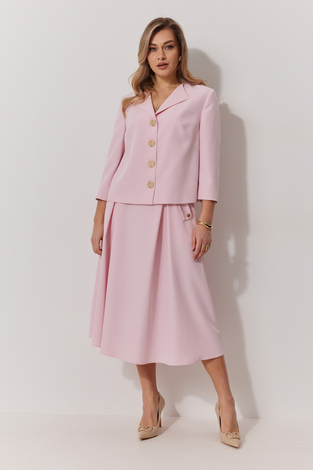 Длина спинки жакета 57 см, длина рукава 48 см, длина юбки по боковому шву 78,5 см.