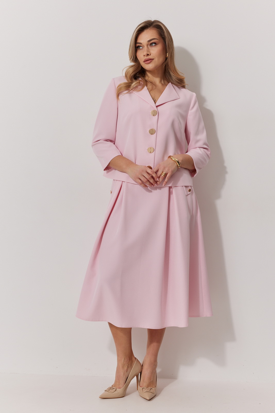 Описание: Костюм женский, состоящий из жакета и юбки. Жакет на подкладке, с рукавом и центральной однобортной застежкой на петли и декоративные пуговицы. Длина жакета до линии бедра. По переду обработаны наклонные вытачки. Спинка со средним швом. Горловина V-образной формы с отворачивающимися лацканами. Линия горловины обработана обтачкой. Рукав втачной, двухшовный ¾ длины. Юбка женская на подкладке А – силуэта длиной до середины икры. По переду юбки заложены встречные складки и нстрочены клапаны с декоративными пуговицами. Спинка юбки цельная. Карманы обработаны в боковом шве юбки. По левому боковому шву юбки находится застежка – молния. Верхний срез юбки обработан притачным поясом с резинкой по спинке.