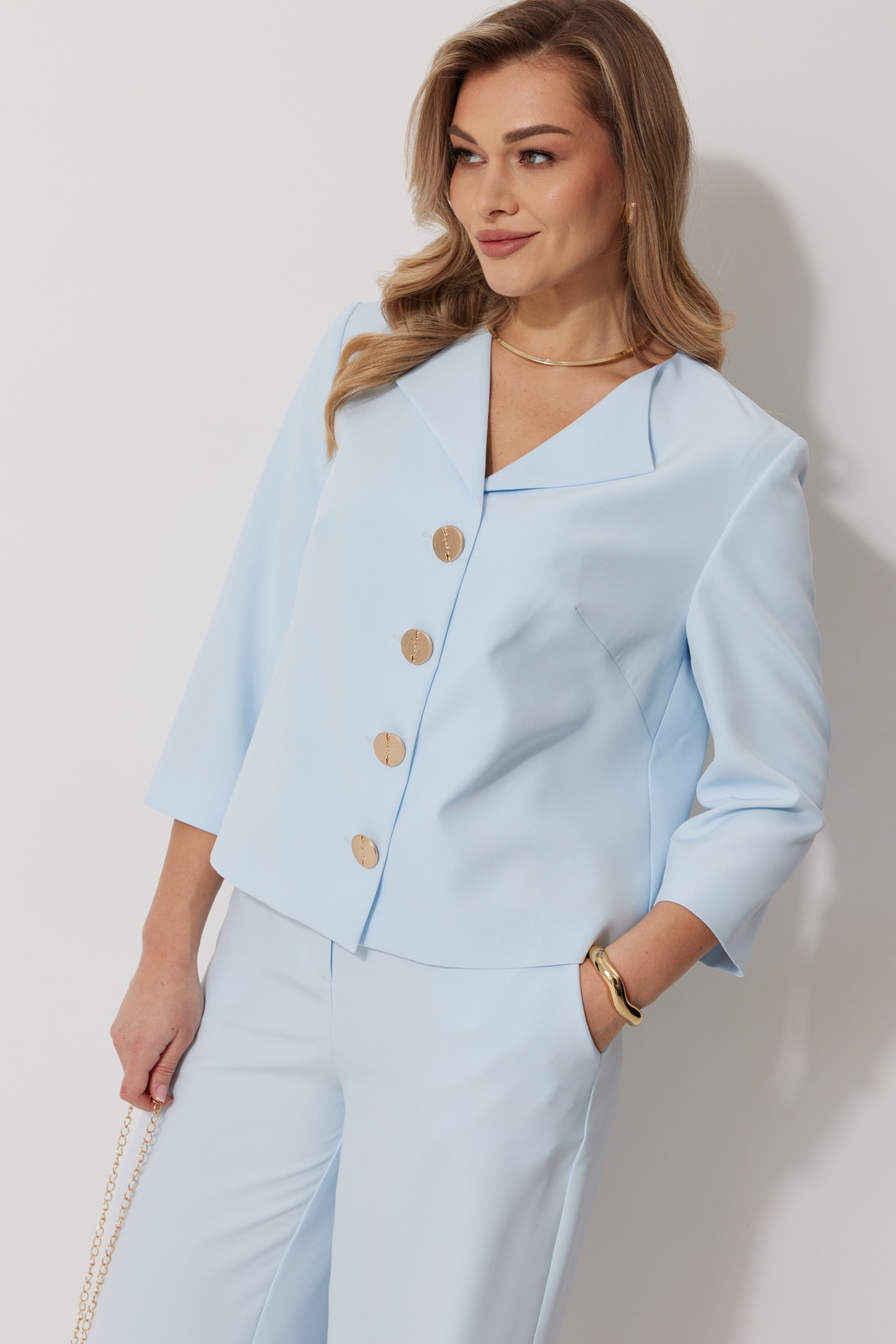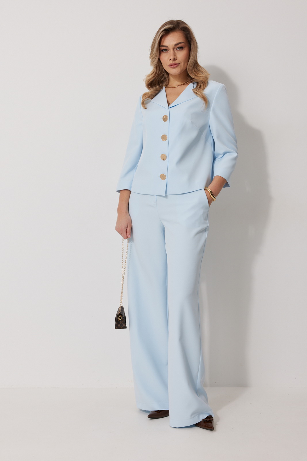Описание: Костюм женский, состоящий из жакета и брюк. Жакет на подкладке, с рукавом и центральной однобортной застежкой на петли и декоративные пуговицы. Длина жакета до линии бедра. По переду обработаны наклонные вытачки. Спинка со средним швом. Горловина V-образной формы с отворачивающимися лацканами. Линия горловины обработана обтачкой. Рукав втачной, двухшовный ¾ длины. Брюки женские, прямого силуэта. По переду обработана застежка на молнию. Карманы наклонные с отрезным бочком. На задних половинках брюк застрочены вытачки. Верх обработан широким притачным поясом (частично на резинке), застегивающимся на петлю и пуговицу.