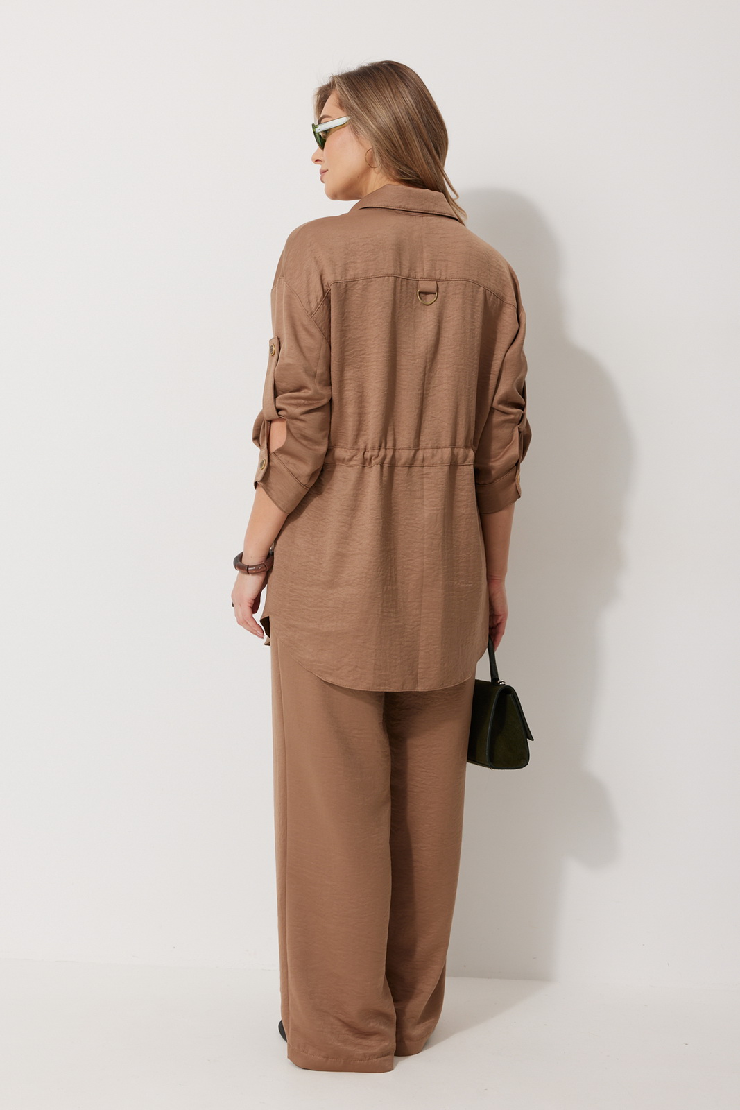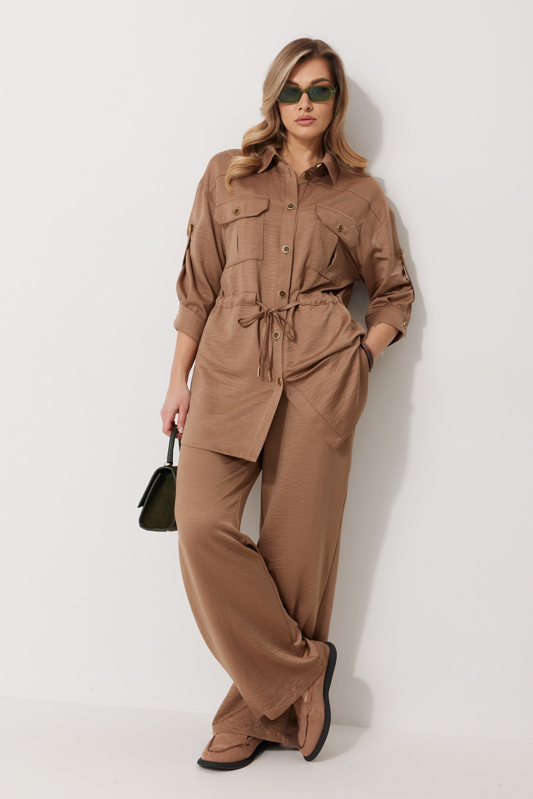 Описание: Костюм женский состоящий из блузки с брюками. Блузка прямого силуэта, по спущенной линией плеча, длиной за линию бедра. По переду блузки настрочены накладные карманы с клапаном. Клапан застегивается на петлю и пуговицу. По спинке отрезная кокетка с декоративным элементом. По переду и спинке, в районе талии располагается кулиска. Рукав втачной двухшовный ¾ длины. Низ рукава со складкой обработан притачной манжетой, застегивающейся на петлю и пуговицу. В разрезе рукава располагается пата, застегивающаяся на петлю и пуговицу. Застежка блузки центральная на отрезные планки, застегивающиеся на петли и пуговицы. Горловина блузки обработана рубашечным воротником с отрезной стойкой. Брюки женские, прямого силуэта. По переду обработана имитация застежки. Карманы расположены в боковом шве. На задних половинках брюк застрочены вытачки. Верх обработан притачным поясом (частично на резинке).