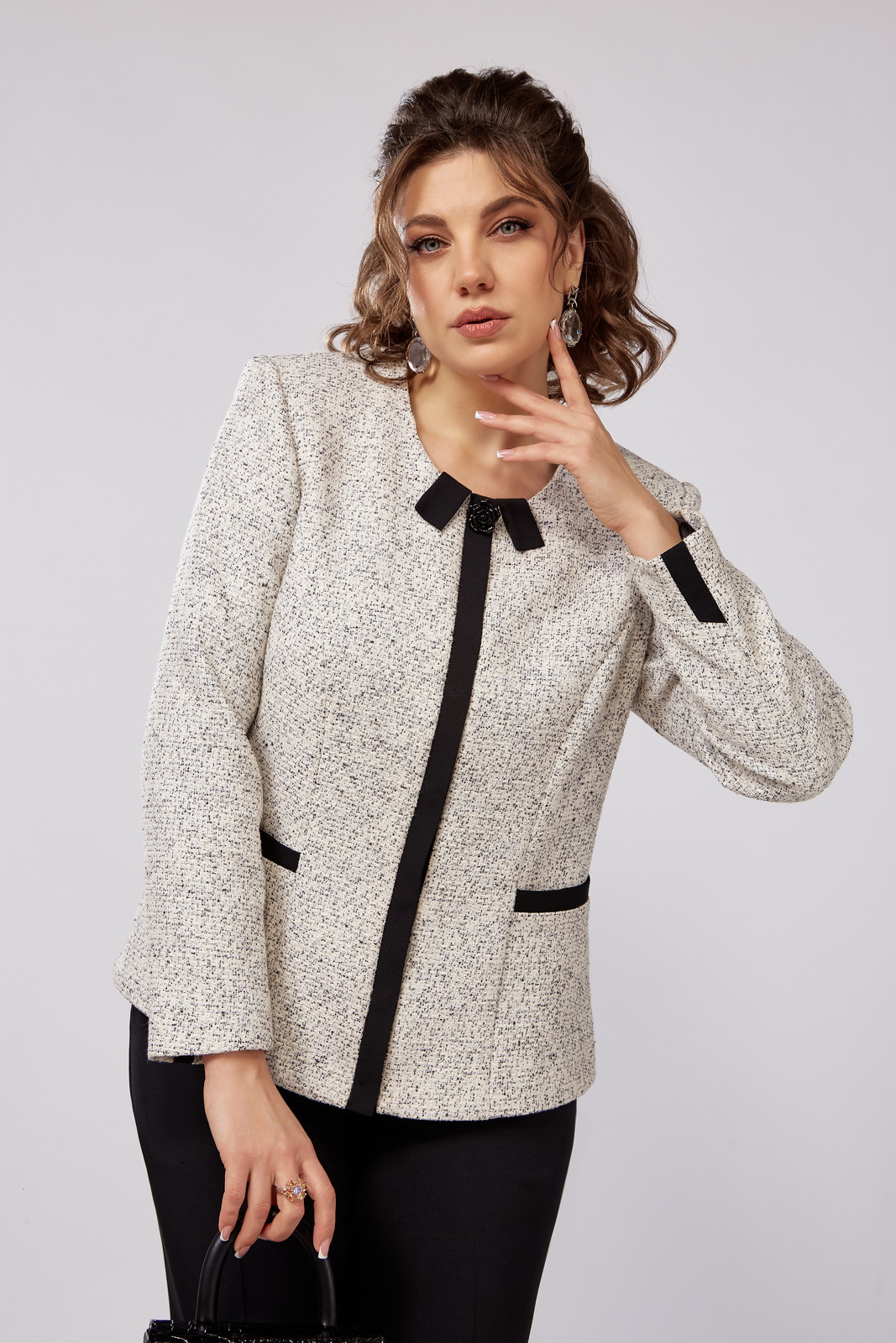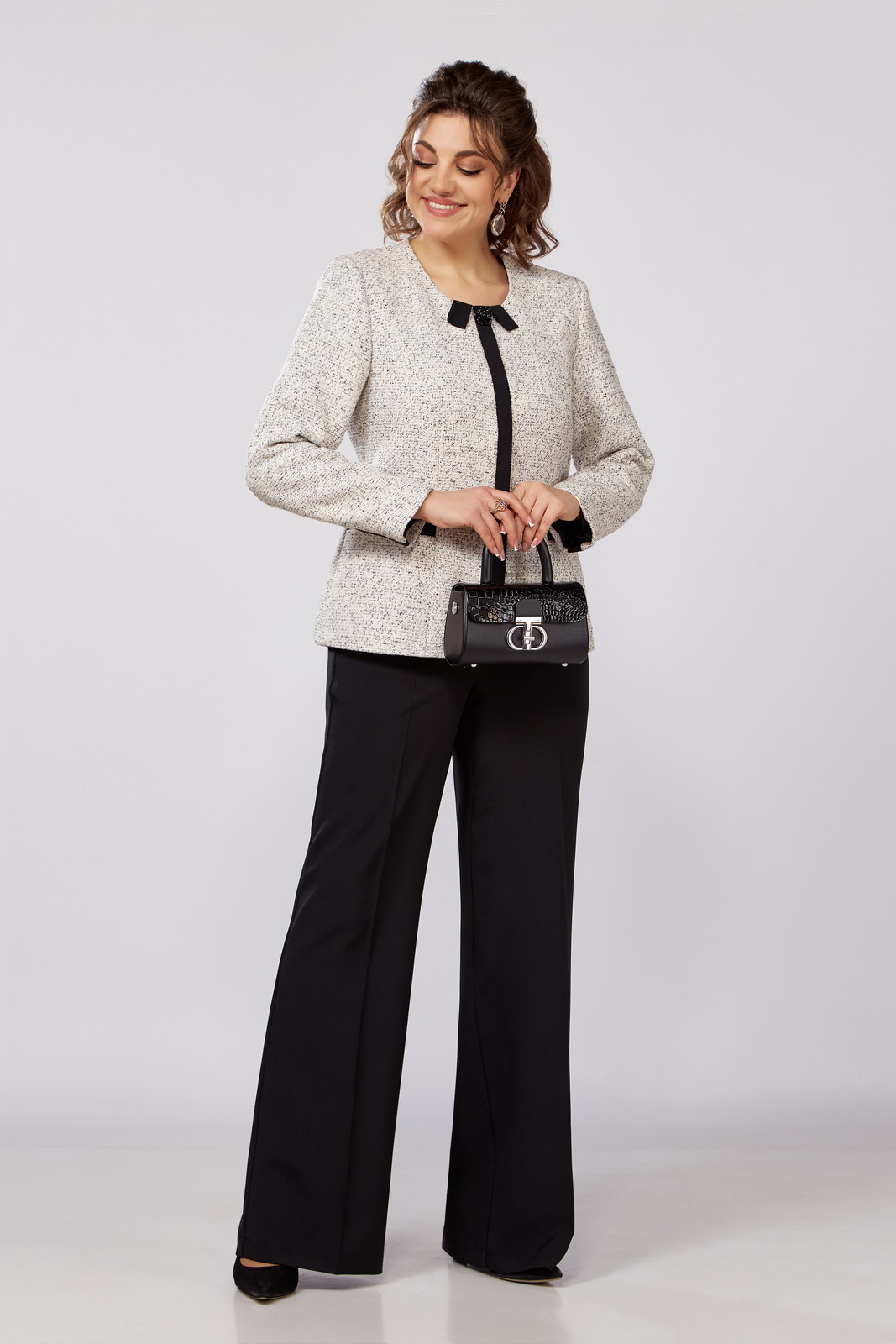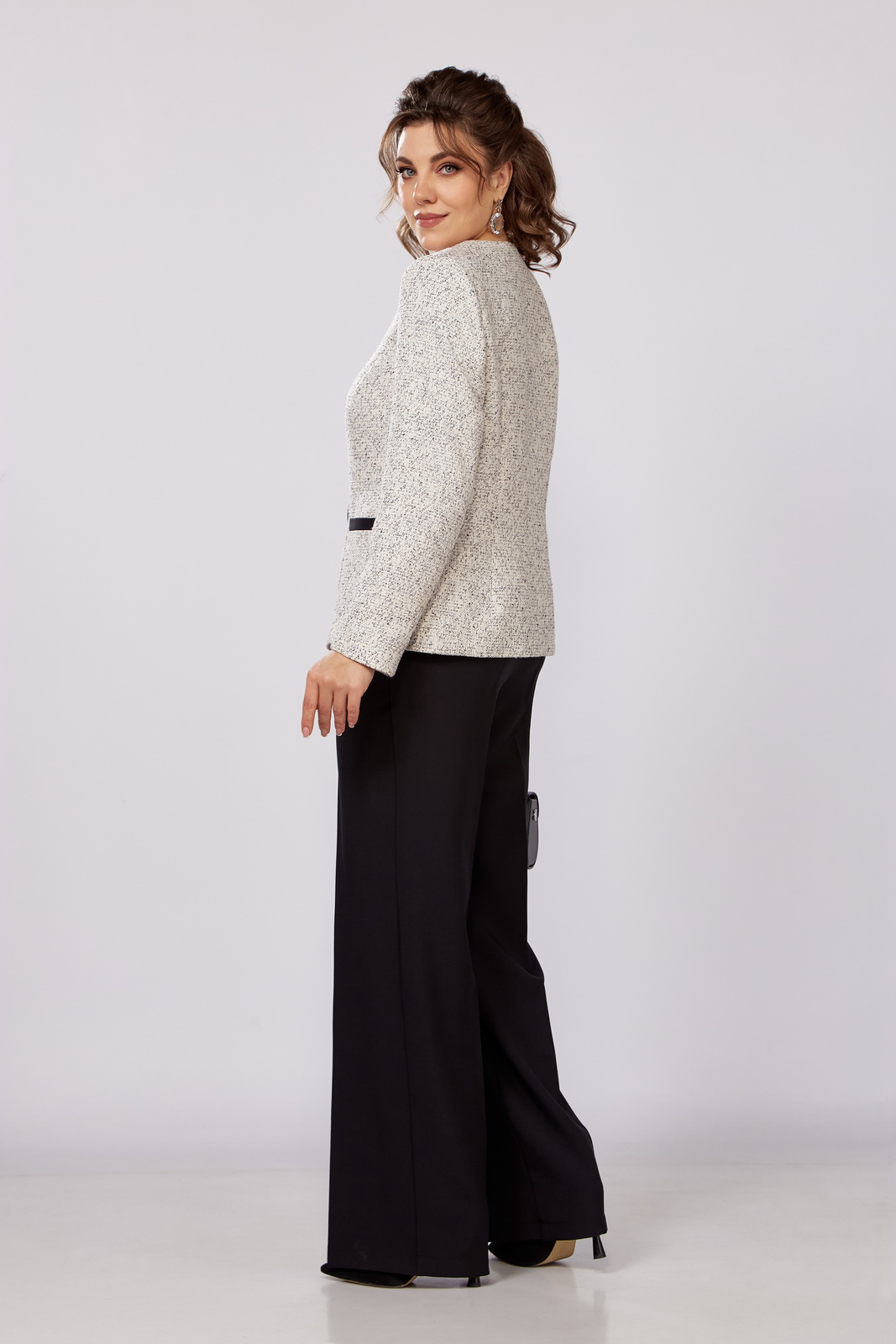 Описание : Стильный, деловой, брючный костюм из комбинирован двумя видами ткани. Жакет из твида на подкладке полуприлегающего силуэта. Застежка на потайные кнопки. По горловине декоративная отделка с пришивной брошью. По полочке функциональные, прорезные, карманы с листочкой. По спинке талевые вытачки, рукав двухшовный с отделкой.