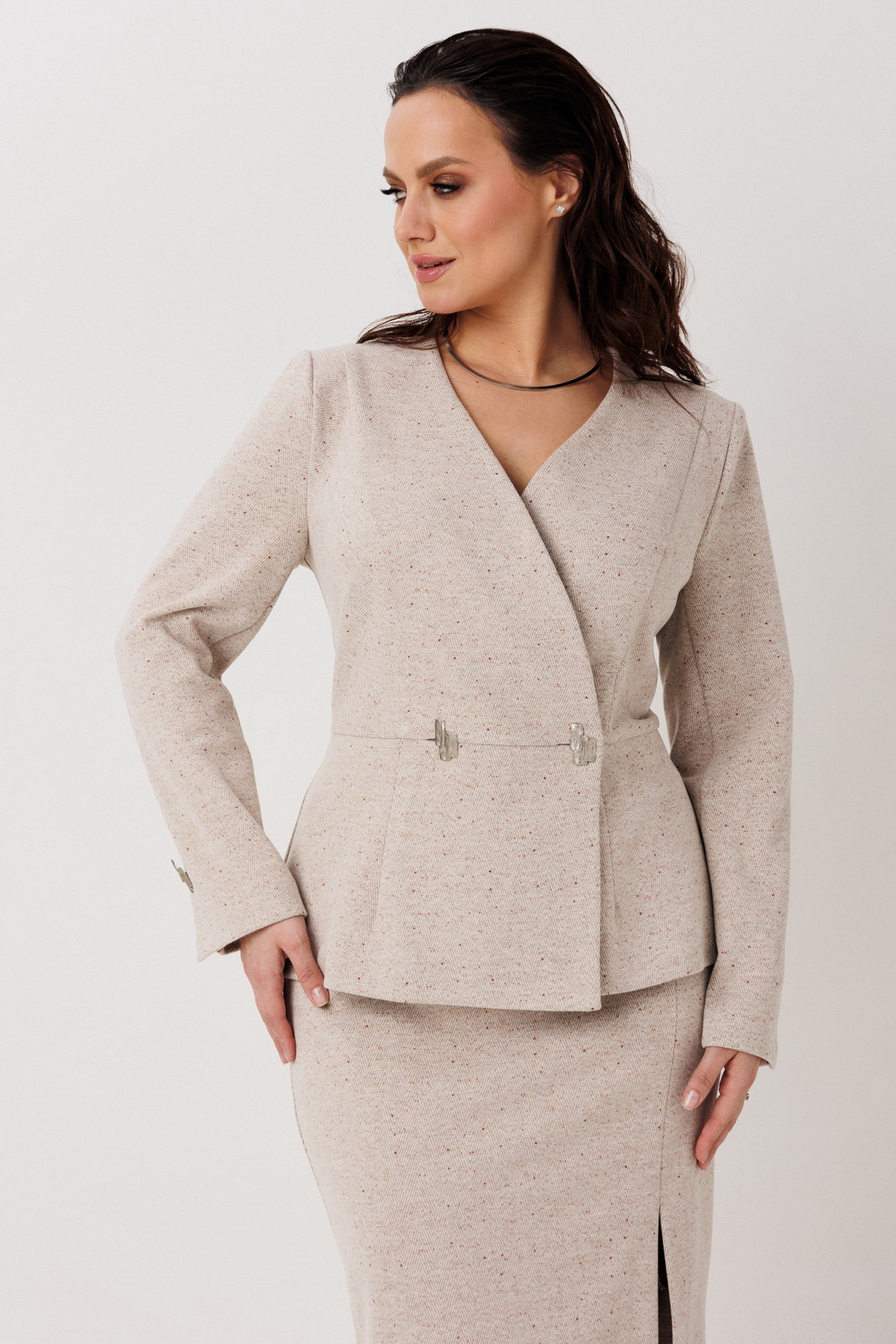 Описание: Элегантный костюм-двойка, выполненный из фактурной костюмной ткани, сочетает классику и современный крой. Двубортный жакет-запах с V-образным вырезом и запаховой конструкцией дополнен декоративной застежкой на уровне талии, создающей эффект приталенности. Жакет на подкладке.