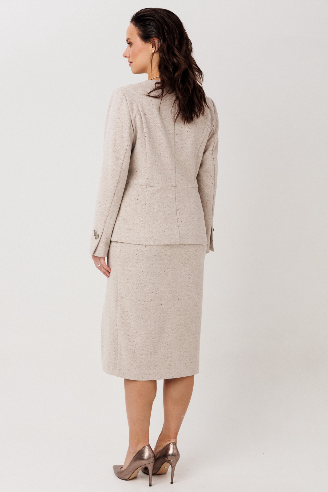 Конструктивные особенности: Костюмная ткань с добавлением эластана — сохраняет форму, устойчива к морщинам и износу. Приталенный силуэт жакета и юбка с эластичным поясом создают баланс между строгостью и комфортом.