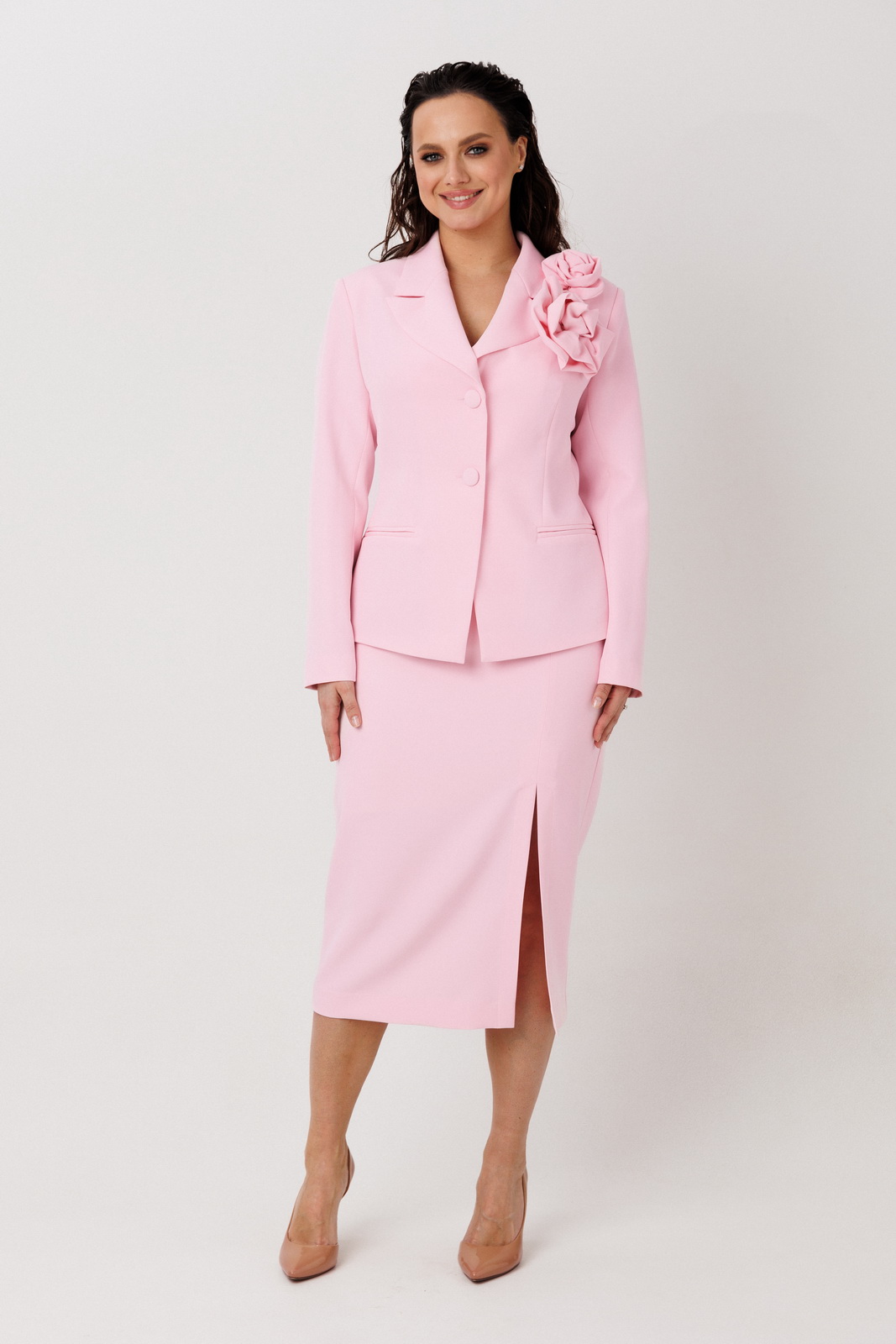 Описание: Элегантный женский костюм классического кроя. Комплект состоит из жакета и юбки-карандаш. Жакет полуприлегающего силуэта, спинка со средним швом, заканчивающимся шлицей. По конструкции предусмотрен воротник с лацканами. Застежка на две пуговицы. В передней части предусмотрены два прорезных кармана. Рукава втачные, двухшовные, со шлицей на пуговицах. Юбка длиной миди, слегка зауженная к низу. Застежка на молнию в центральном шве. В левой боковой части юбки размещен разрез от колена до низа, что обеспечивает свободу движения и добавляет элегантности. Жакет и юбка на подкладке. Жакет дополняет декоративная съемная брошь.