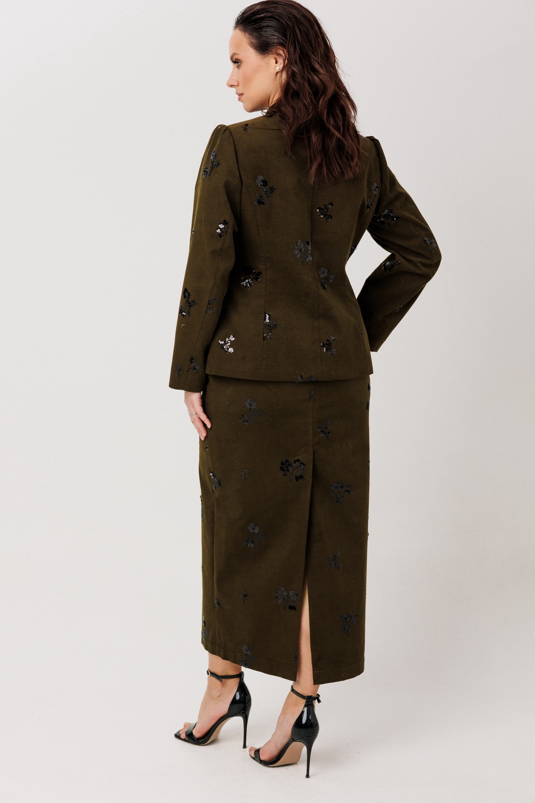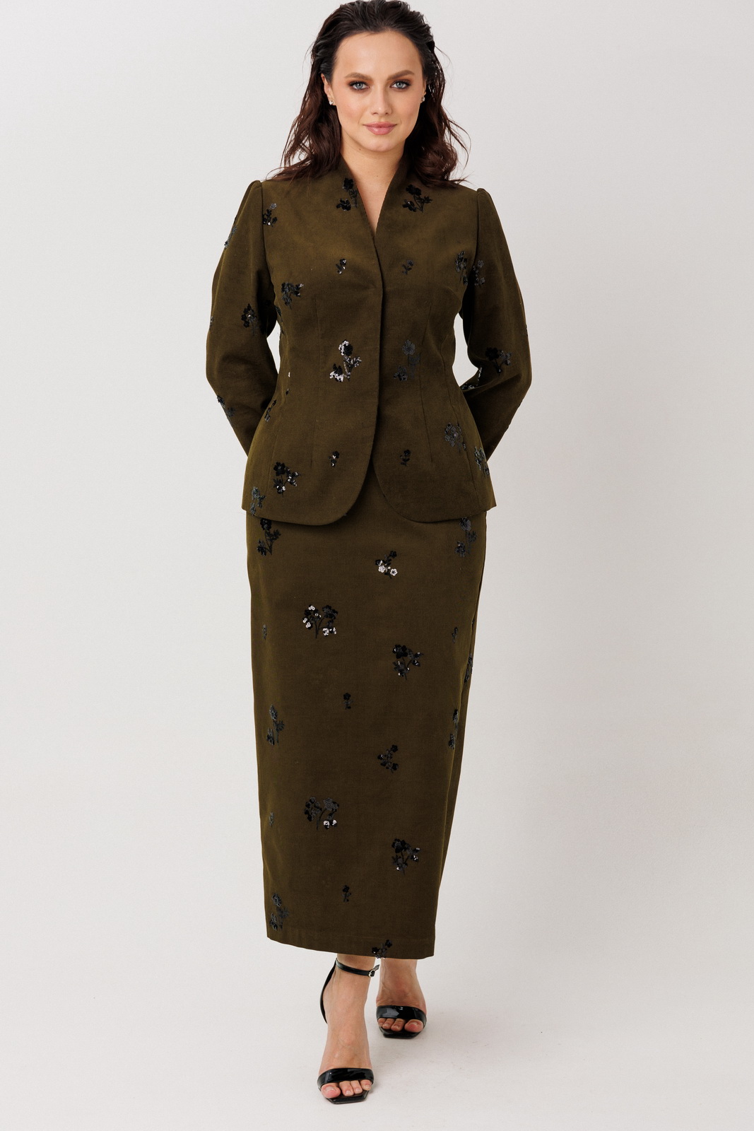 Описание: Элегантный костюм-двойка (жакет и юбка), выполненный из штруксовой ткани с декоративной вышивкой пайетками в виде цветочных мотивов, создающих эффект люминесценции при движении. Жакет на подкладке, с приталенным силуэтом застегивается на две потайные кнопки, обеспечивающие аккуратный внешний вид и скрытую застежку. Юбка-карандаш с задней шлицей гарантирует свободу движений и подчеркивает строгий крой. Пояс юбки на обтачке, застежка на молнию, частичная резинка по талии. Задняя шлица юбки — функциональный элемент, обеспечивающий удобство при ходьбе и соответствующий стандартам костюмного кроя. Юба на подкладке.