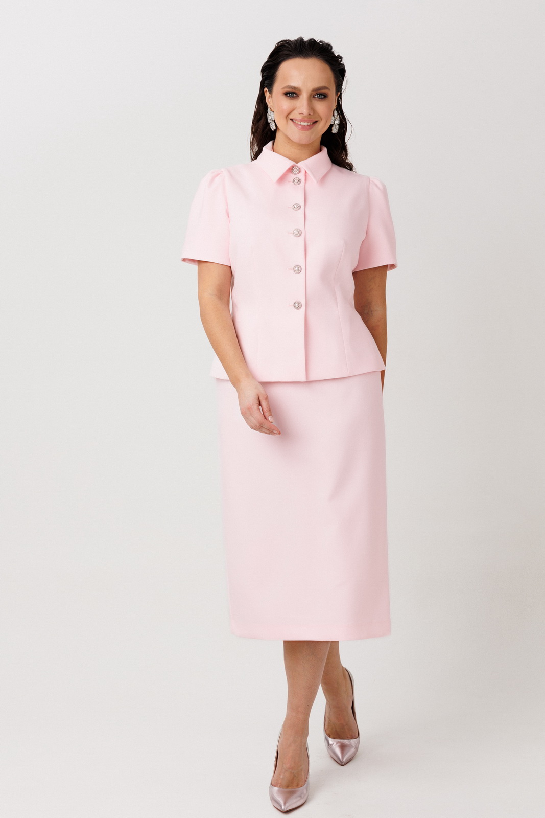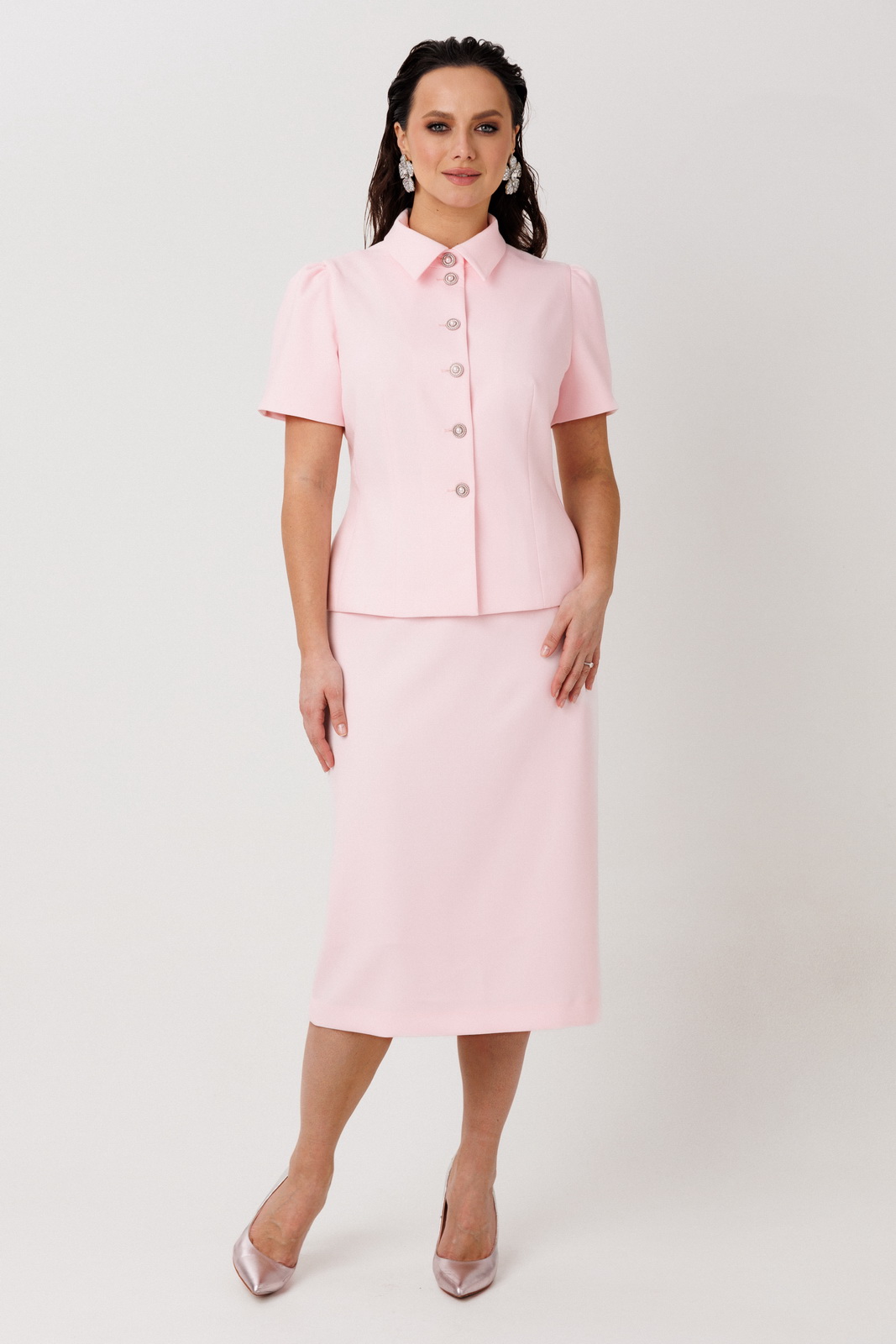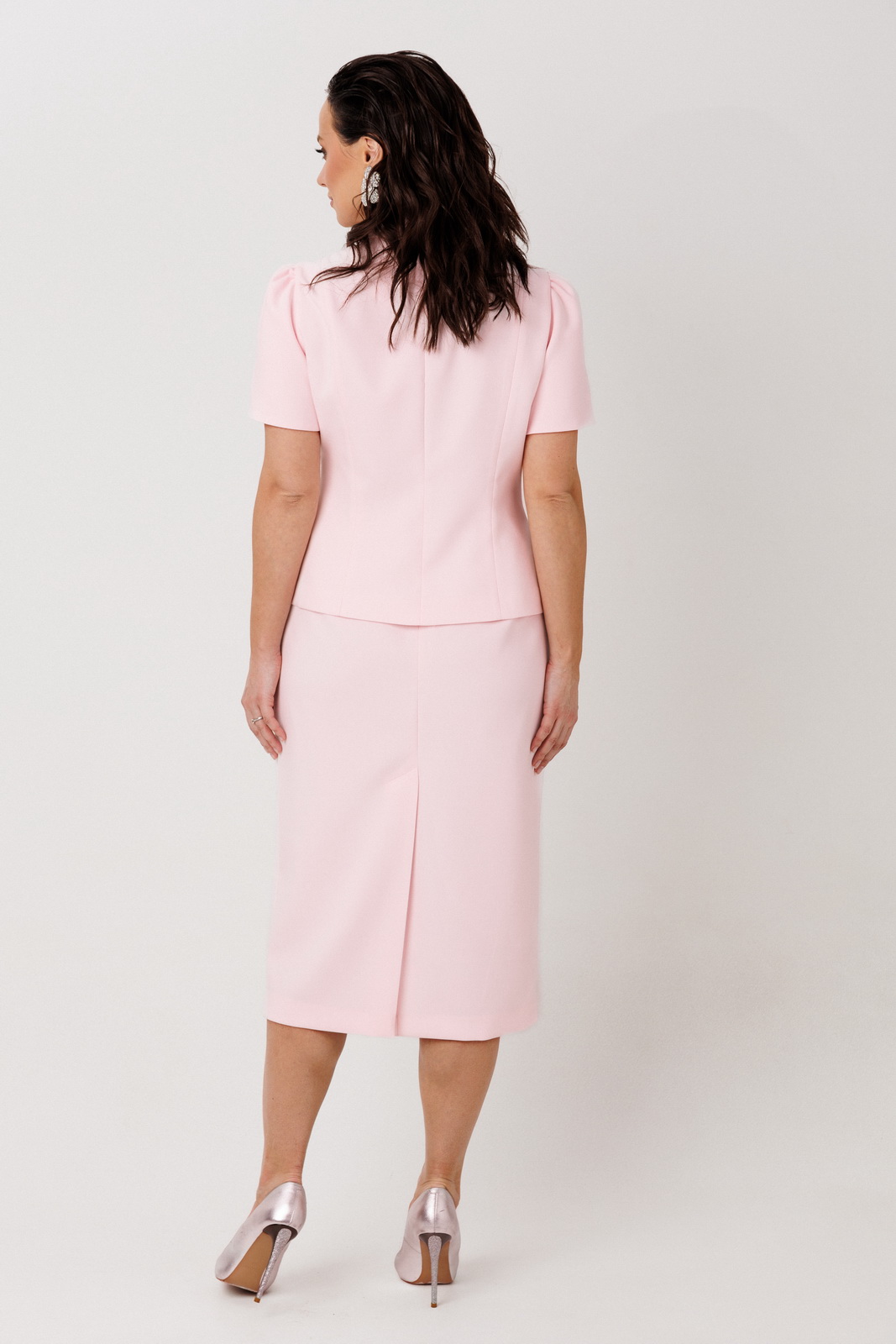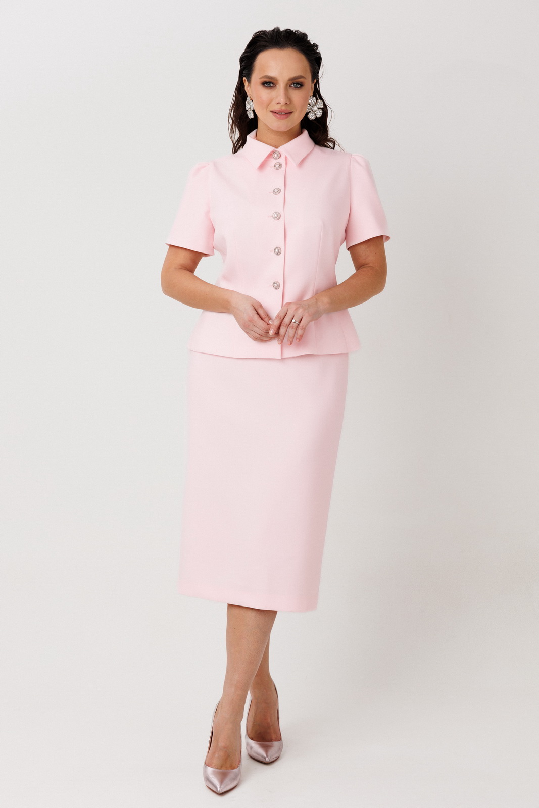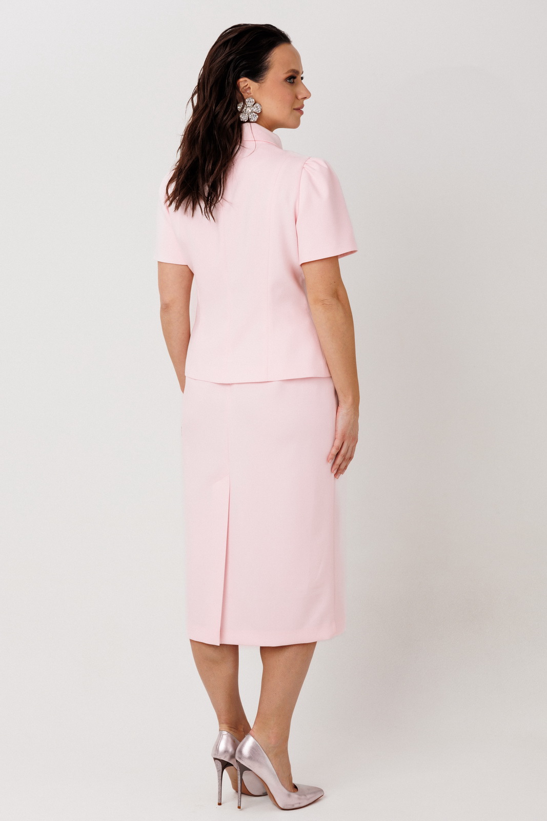 Описание: Элегантный женский костюм классического кроя. Комплект состоит из жакета и юбки-карандаш. Жакет полуприлегающего силуэта, спинка со средним швом. По конструкции предусмотрена центральная застежка на 8 пугович. воротник стоячий отложной. Рукава втачные, со сборкой по окату. Юбка длиной миди, слегка зауженная к низу со шлицей. Пояс юбки на обтачке, застежка на тесьму-молнию, пояс частично на резинке по бокам. Жакет и юбка на подкладке.