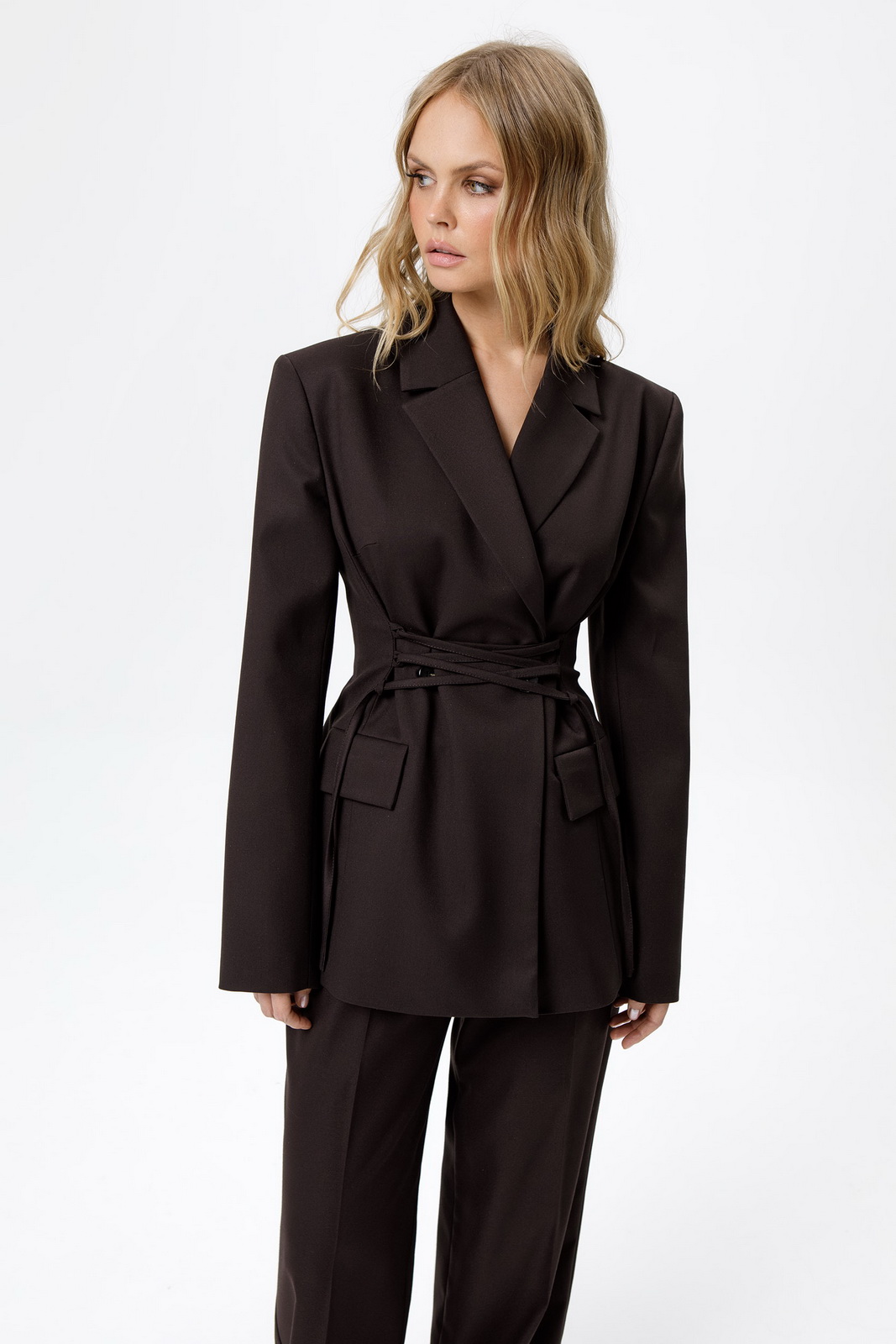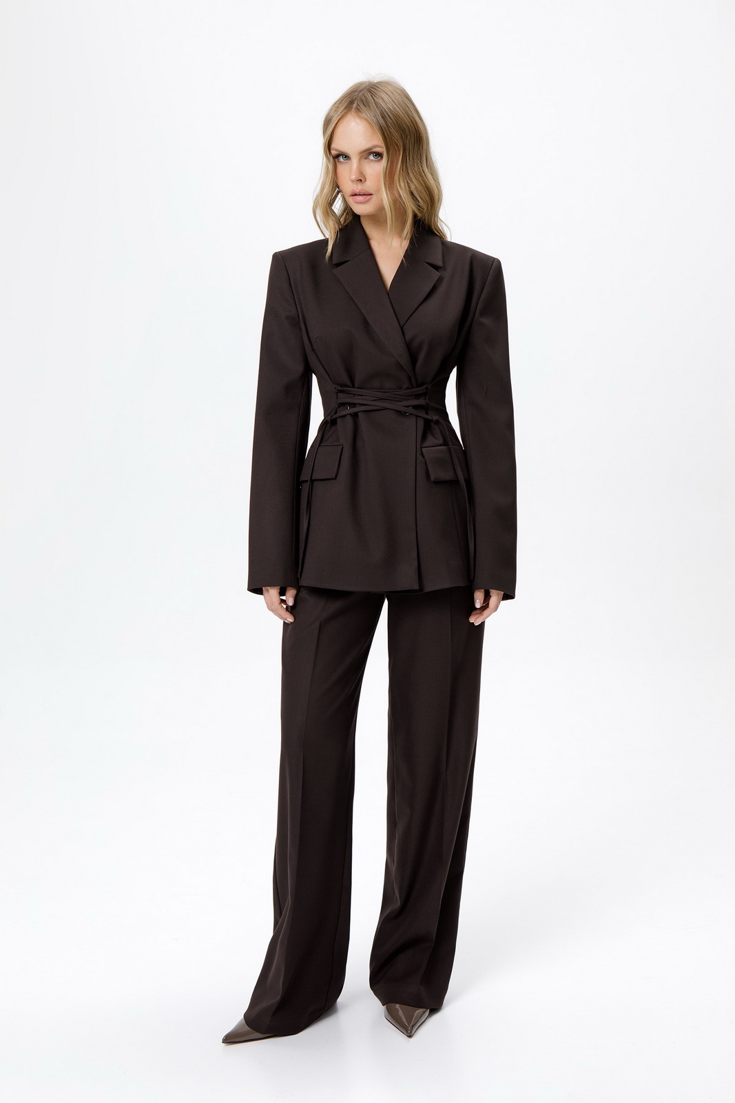 Описание: Костюм-двойка из жакета со шнуровкой и широких прямых брюк.