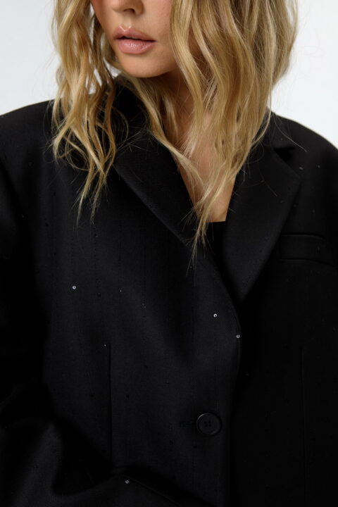 Описание: Костюм-двойка из оверсайз жакета и мини-юбки из костюмной тканис пайетками.