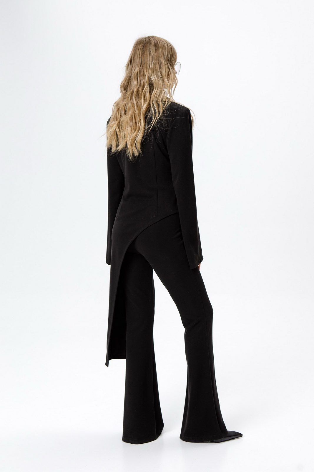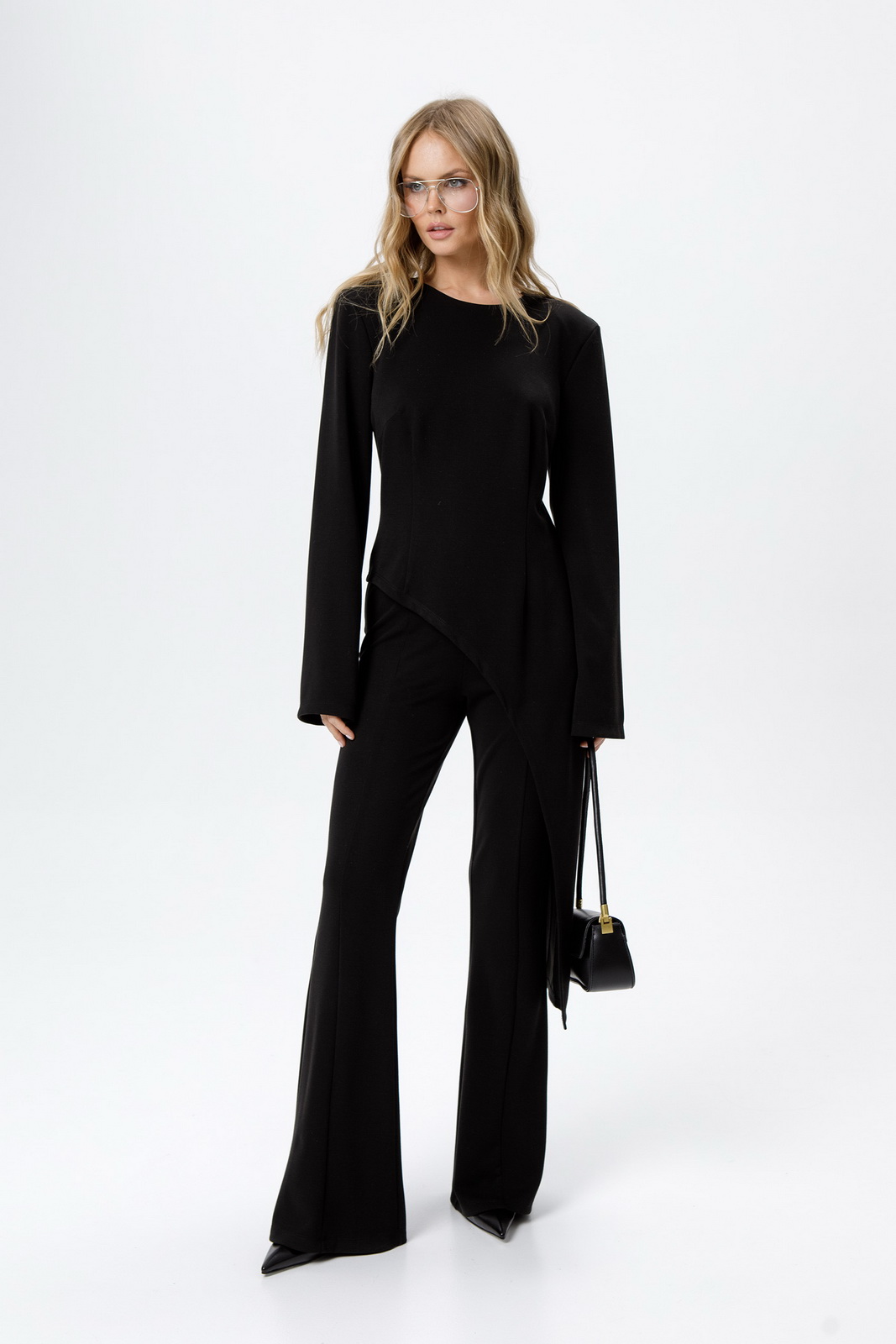 Описание: Трикотажный костюм-двойка из асимметричнойтуники и облегающих брюк-клеш.