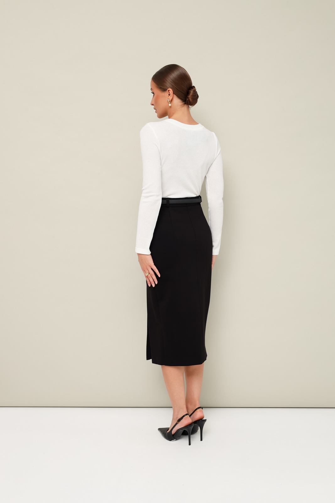 Описание: Комфортный трикотажный комплект, состоящий из джемпера и юбки. Джемпер прилегающего силуэта, с округлым вырезом горловины. Длинные втачные рукава. Юбка-карандаш, с притачным поясом со шлевками. По переду высокий разрез, который обработан планкой из экокожи. Застежка сзади, в среднем шве на потайную молнию.