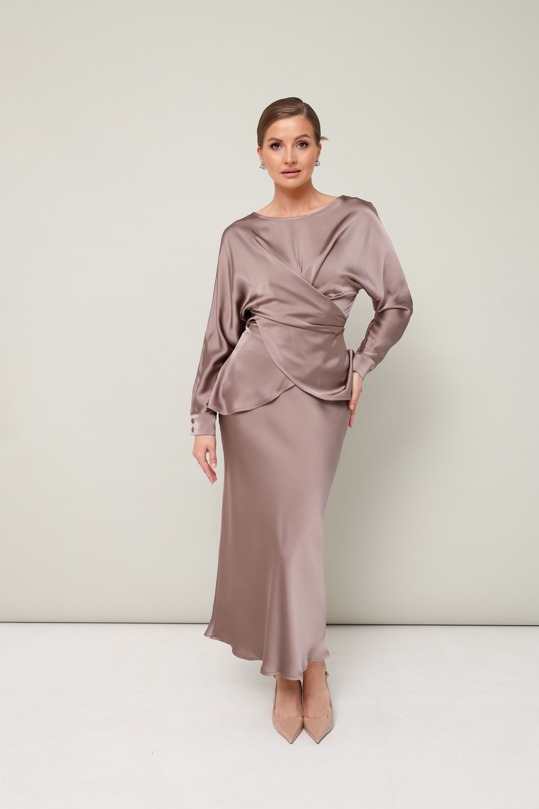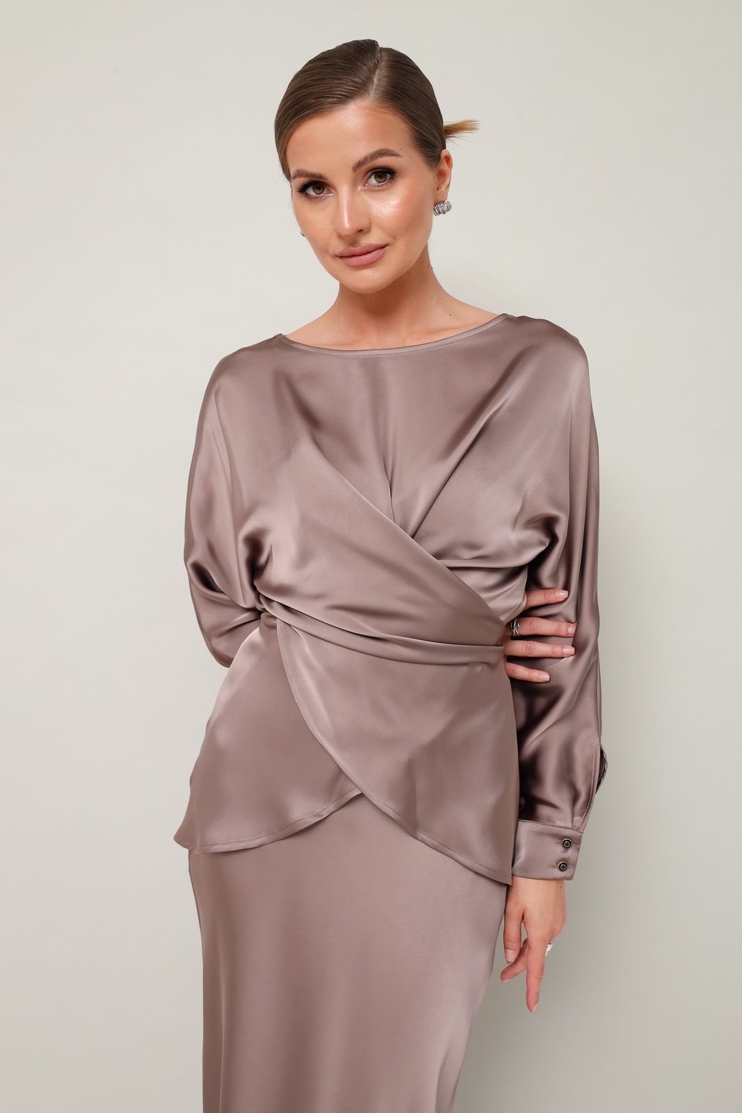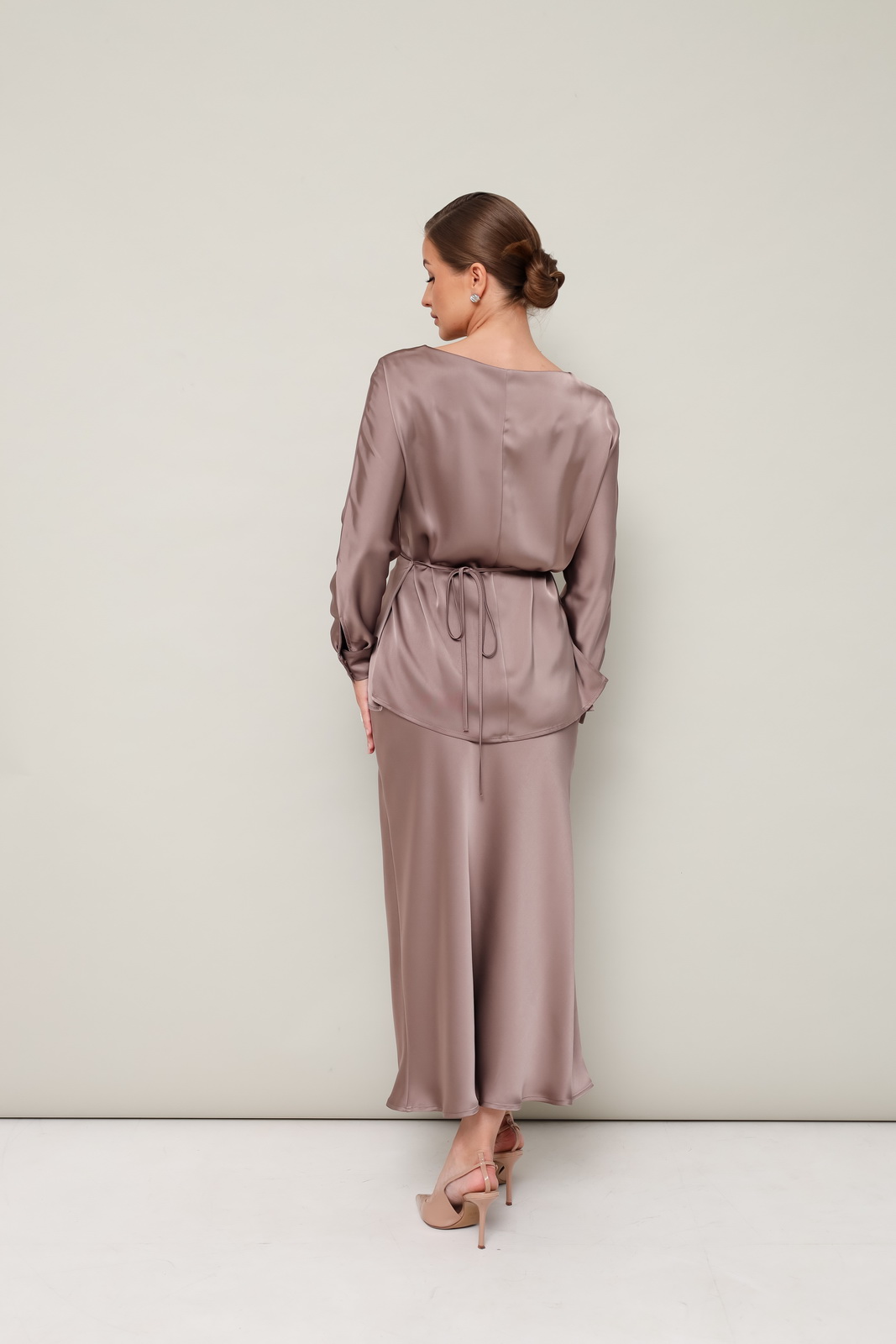 Описание: Элегантный 2-предментный комплект, состоящий из блузки и юбки, выполненный из струящейся ткани с деликатным блеском. Блузка прямого кроя с акцентом на талии. Вырез горловины-лодочка. Рукава цельновыкроеные с манжетами с застежкой на петли и пуговицы. По переду обработан разрез с завязками для фиксации половинок переда на спинке. Низ переда фигурный, спинка со средним швом и прямым низом, в боковых швах высокие разрезы. Юбка с кроем «по косой» в длине миди, пояс на обтачке, застежка в боковом шве на потайную тесьму молнию.