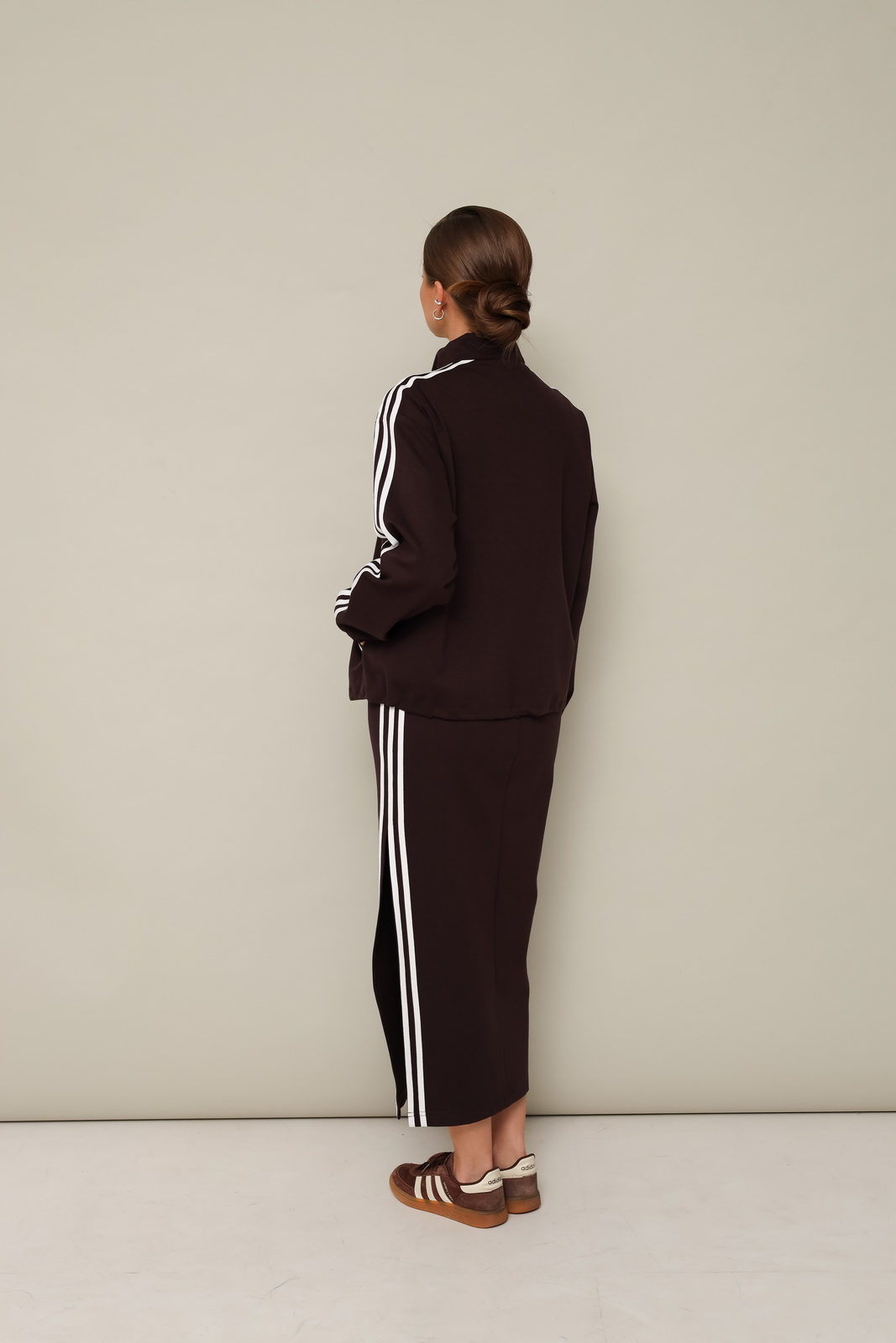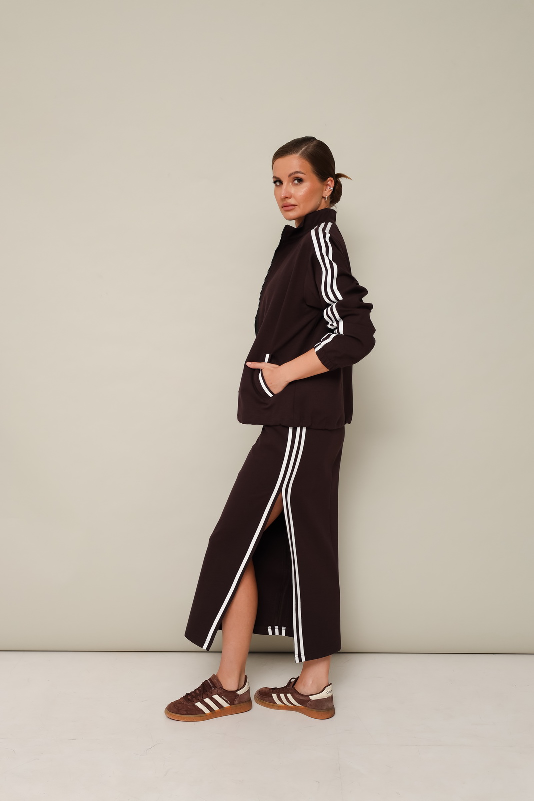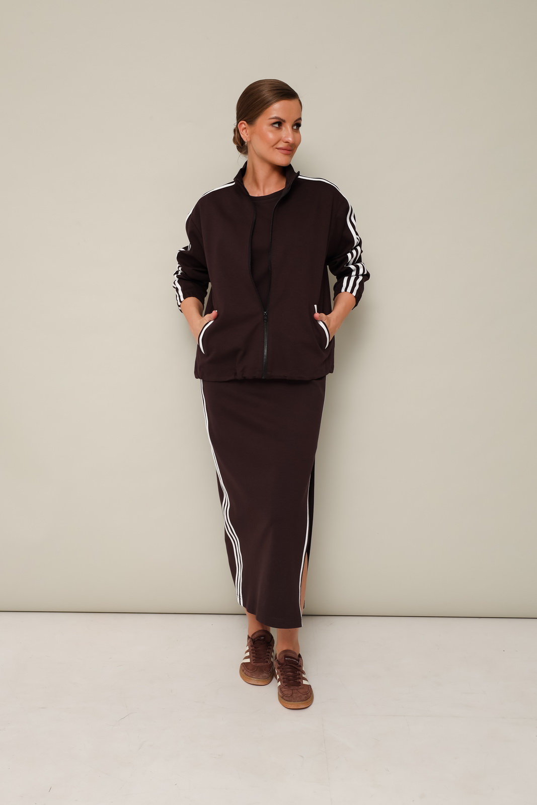 Описание: Костюм в стиле спорт-шик, выполнен из качественного трикотажого нейлона. Бомбер свободного кроя. Горловина с воротником-стойкой. Центральная застежка на тесьму-молнию. Спереди обработаны наклонные карманы-листочки. Рукава длинные, со спущенной линией втачивания плеча с манжетой на резинке. Низ бомбера собирается на эластичную тесьму с регулятором для формирования силуэта. Платье полуприлегающего силуэта в длине миди. Округлый вырез горловины. В боковом шве обработан высокий разрез. По плечевому шву, рукавам, карманам бомбера и боковым швам платья настрочен декоративный элемент в виде хлопковой тесьмы контрастного цвета.