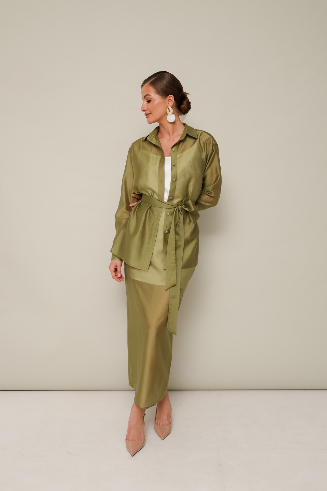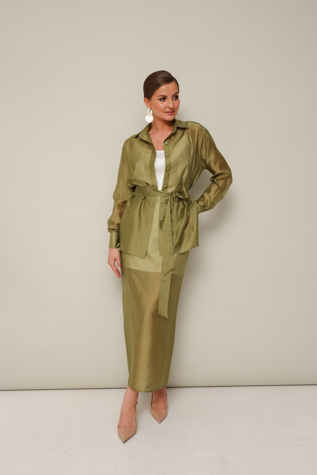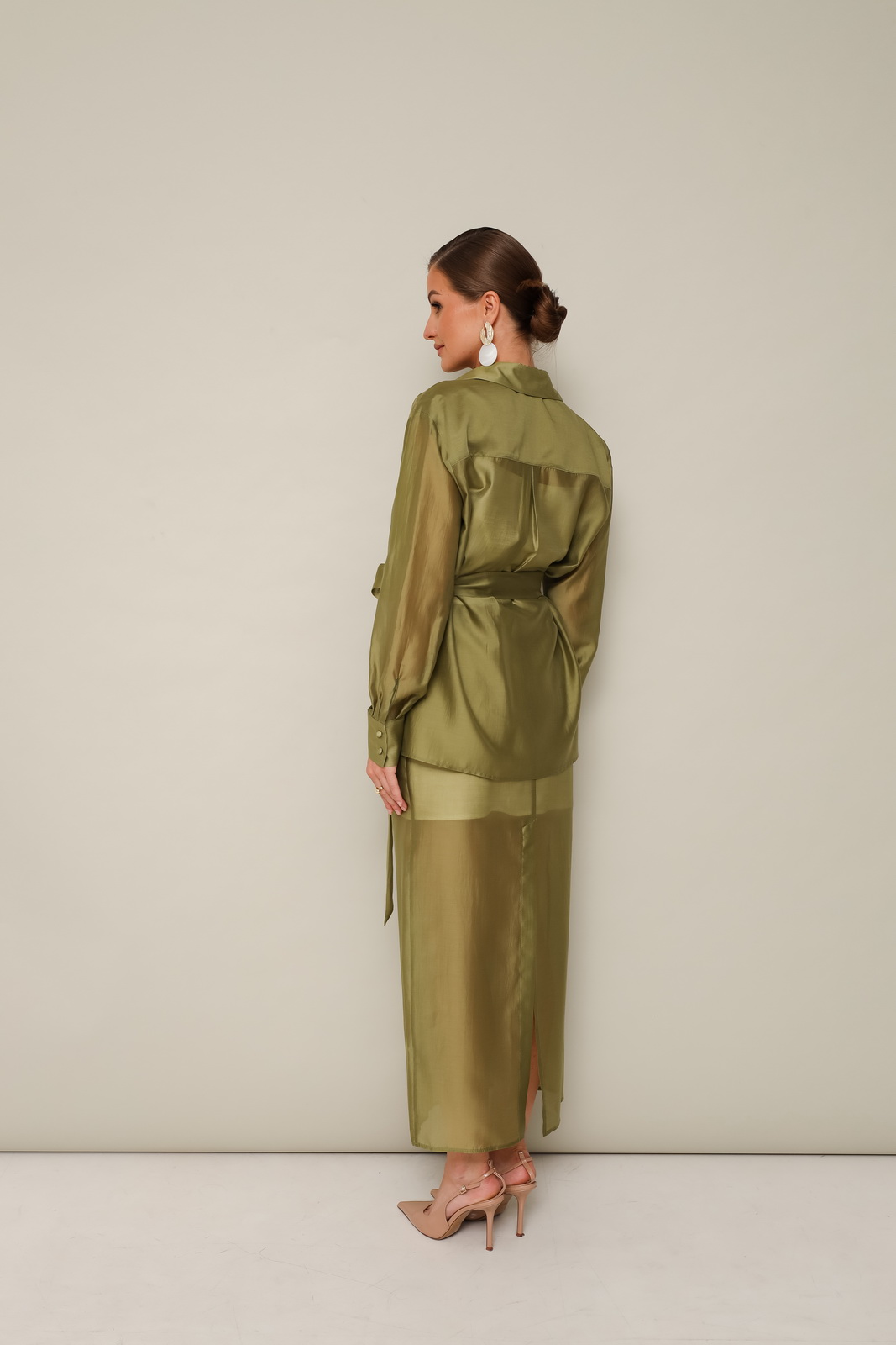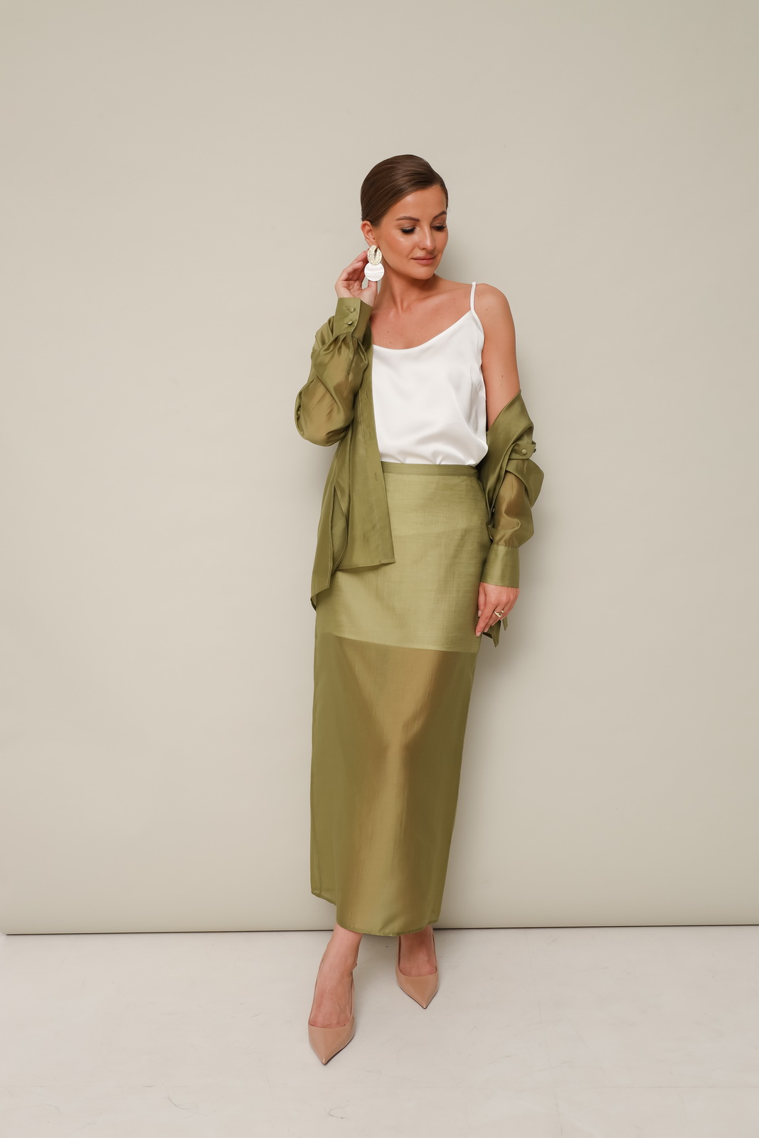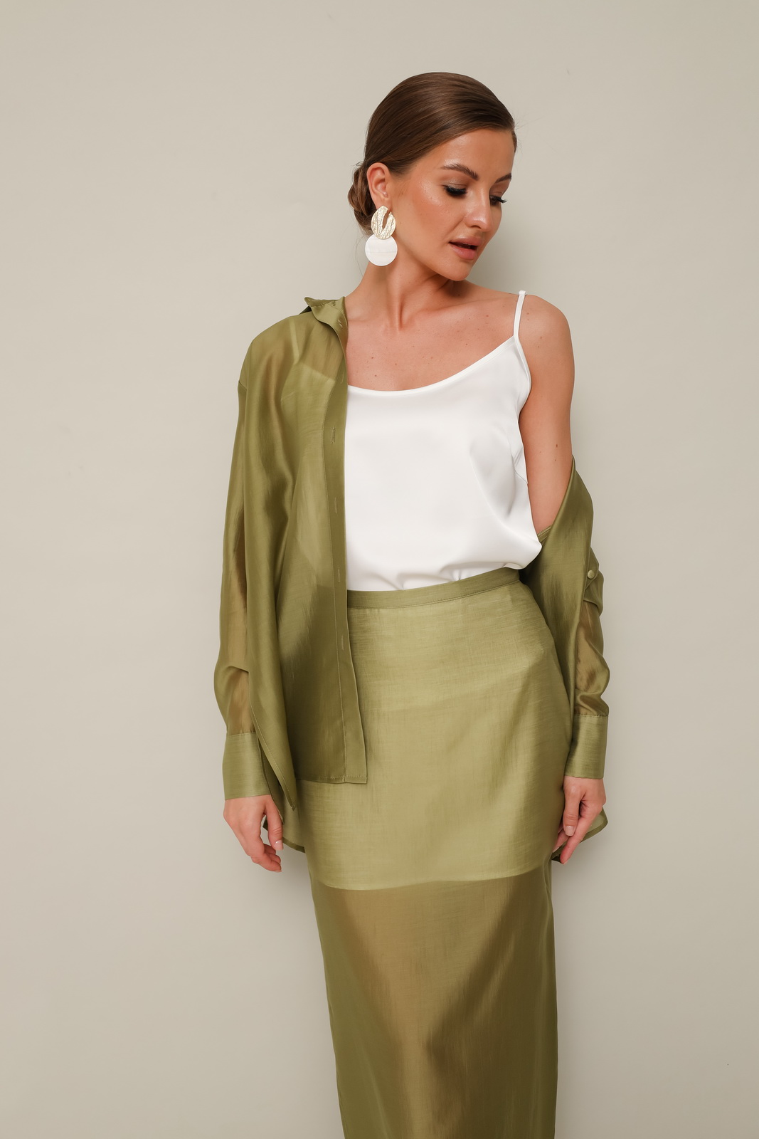 Описание: Элегантный 3-предментный комплект, состоящий из топа, блузки и юбки. Топ полуприлегающего силуэта, выполнен из струящейся ткани с матовым блеском. Бретели регулируются по длине. Блузка и юбка, выполнены из вискозного полотна. Блузка прямого кроя, горловина с рубашечным воротником на отрезной стойке, центральная застежка на петли и обтяжные пуговицы. Рукава втачные с манжетами с застежкой на пуговицы. В боковых швах обработаны разрезы. Спинка с отрезной кокеткой и встречной складкой. Юбка на подкладке в длине миди. Притачной пояс с частичной резинкой для регуляции по талии. Застежка в среднем шве по спинке на пуговицу и потайную молнию. Для удобства движения сзади обработана шлица. В комплекте прилагается пояс основной ткани.