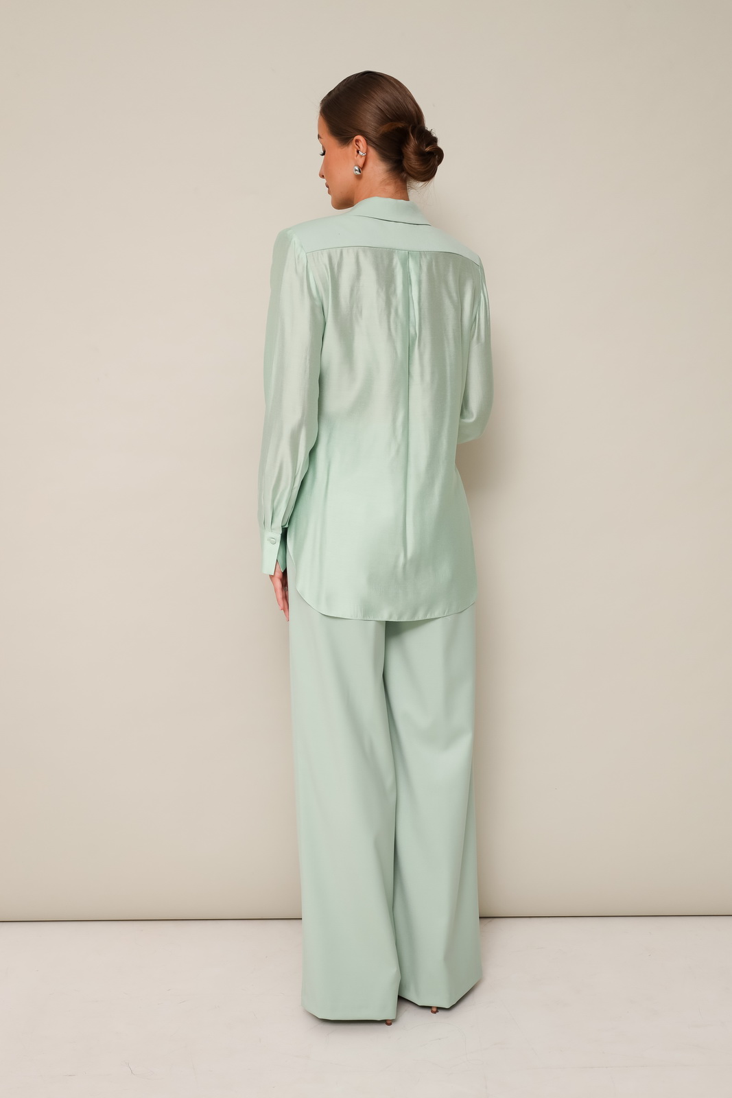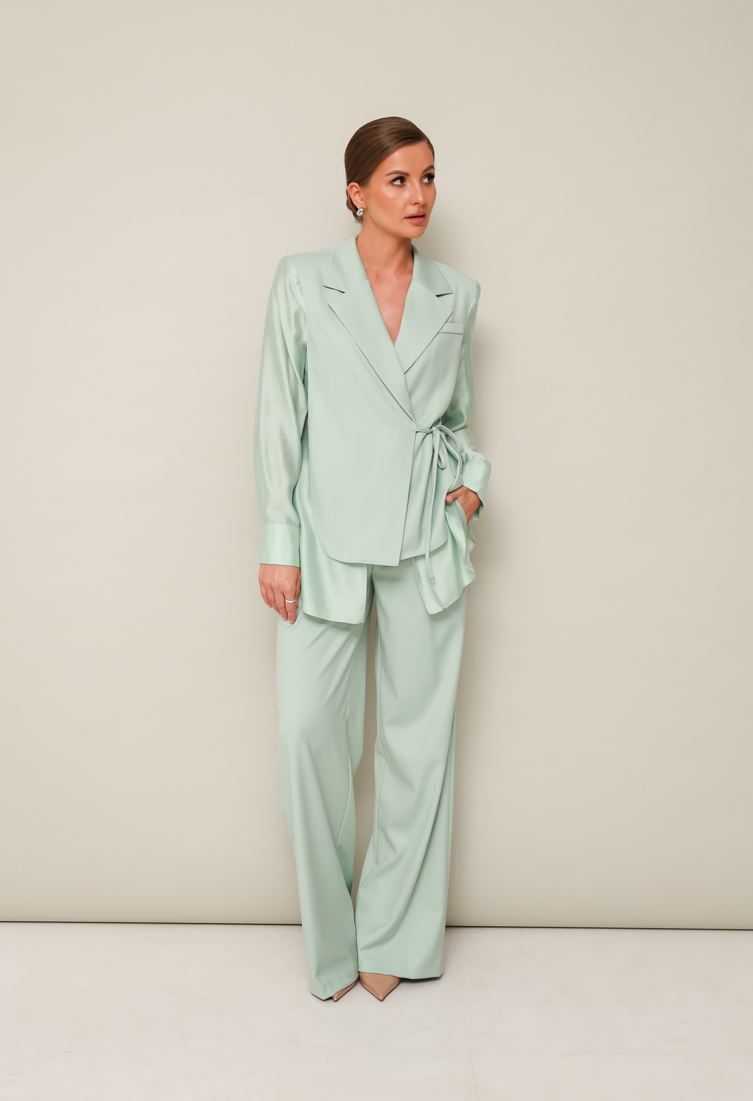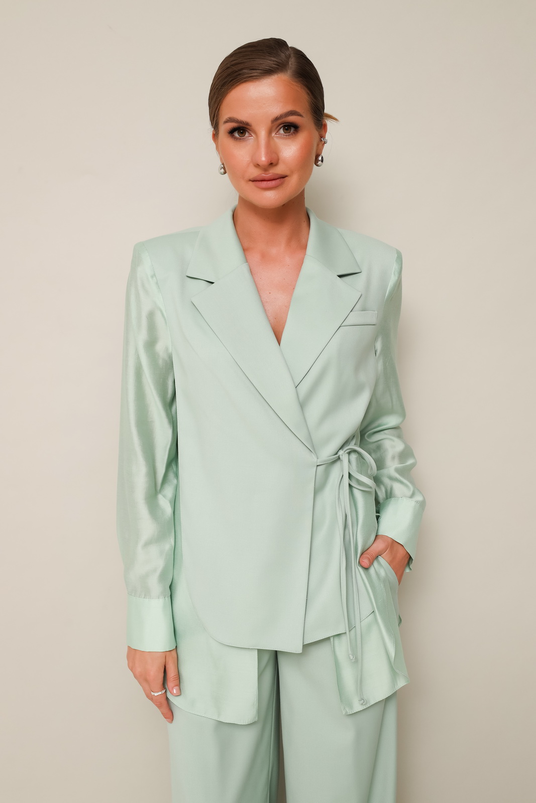 Описание: Элегантный 2-предметный комплект, состоящий из жакета и брюк, выполненный из костюмной и вискозной блузочной ткани. Жакет актуального прямого силуэта, с центральной застежкой на потайную пуговицу и завязками от бокового шва. Воротник пиджачного типа с отложными лацканами. Рукава втачные, с манжетами с застежкой на петли и пуговицы. Спинка с отрезной кокеткой. Рукава, спинка и частично перед, выполнены из легкой блузочной ткани. Брюки с посадкой на талии и защипами от пояса, с заутюженными стрелками и с боковыми наклонными карманами. Пояс притачной с застежкой на пуговицу и тесьму-молнию, по спинке пояс на резинке для регуляции размера.