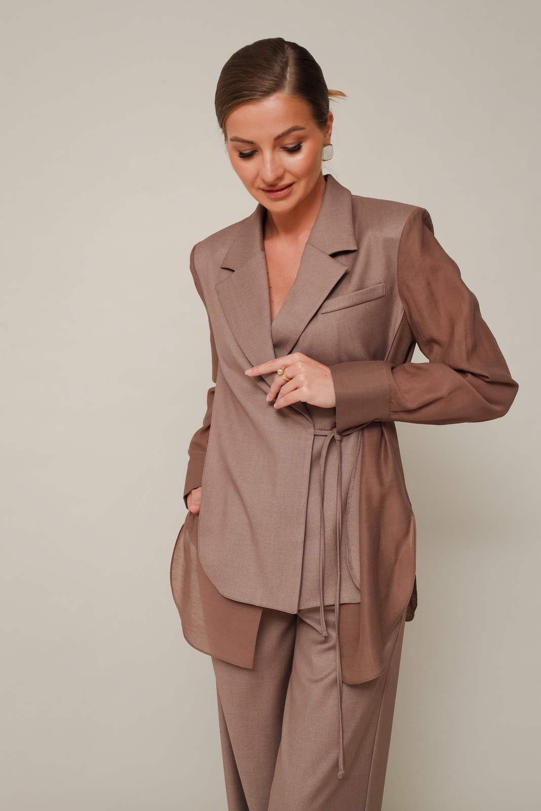Описание: Элегантный 2-предметный комплект, состоящий из жакета и брюк, выполненный из костюмной и вискозной блузочной ткани. Жакет актуального прямого силуэта, с центральной застежкой на потайную пуговицу и завязками от бокового шва. Воротник пиджачного типа с отложными лацканами. Рукава втачные, с манжетами с застежкой на петли и пуговицы. Спинка с отрезной кокеткой. Рукава, спинка и частично перед, выполнены из легкой блузочной ткани. Брюки с посадкой на талии и защипами от пояса, с заутюженными стрелками и с боковыми наклонными карманами. Пояс притачной с застежкой на пуговицу и тесьму-молнию, по спинке пояс на резинке для регуляции размера.