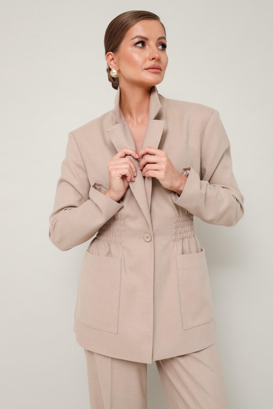 Жакет полуприлегающего силуэта, с центральной застежкой на петлю и пуговицу. Воротник пиджачного типа с отложными лацканами. По линии талии обработана широкая резинка. Спереди – накладные карманы. Рукава втачные двухшовные. Средний шов по спинке. Изделие на подкладке.