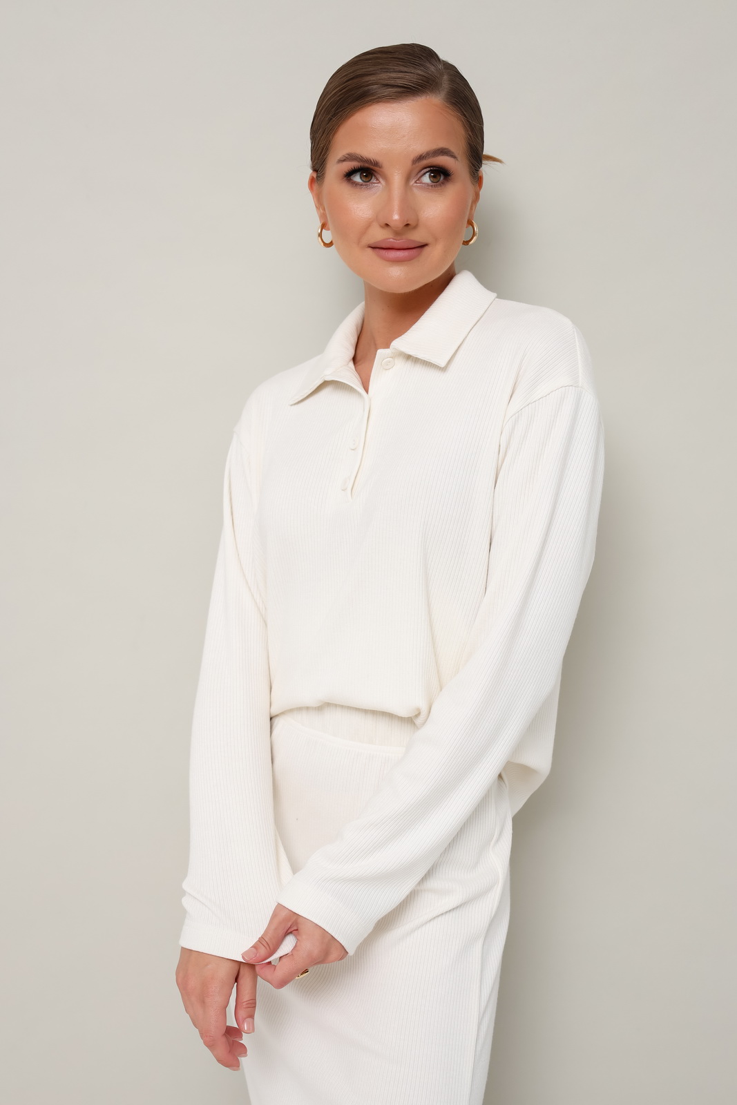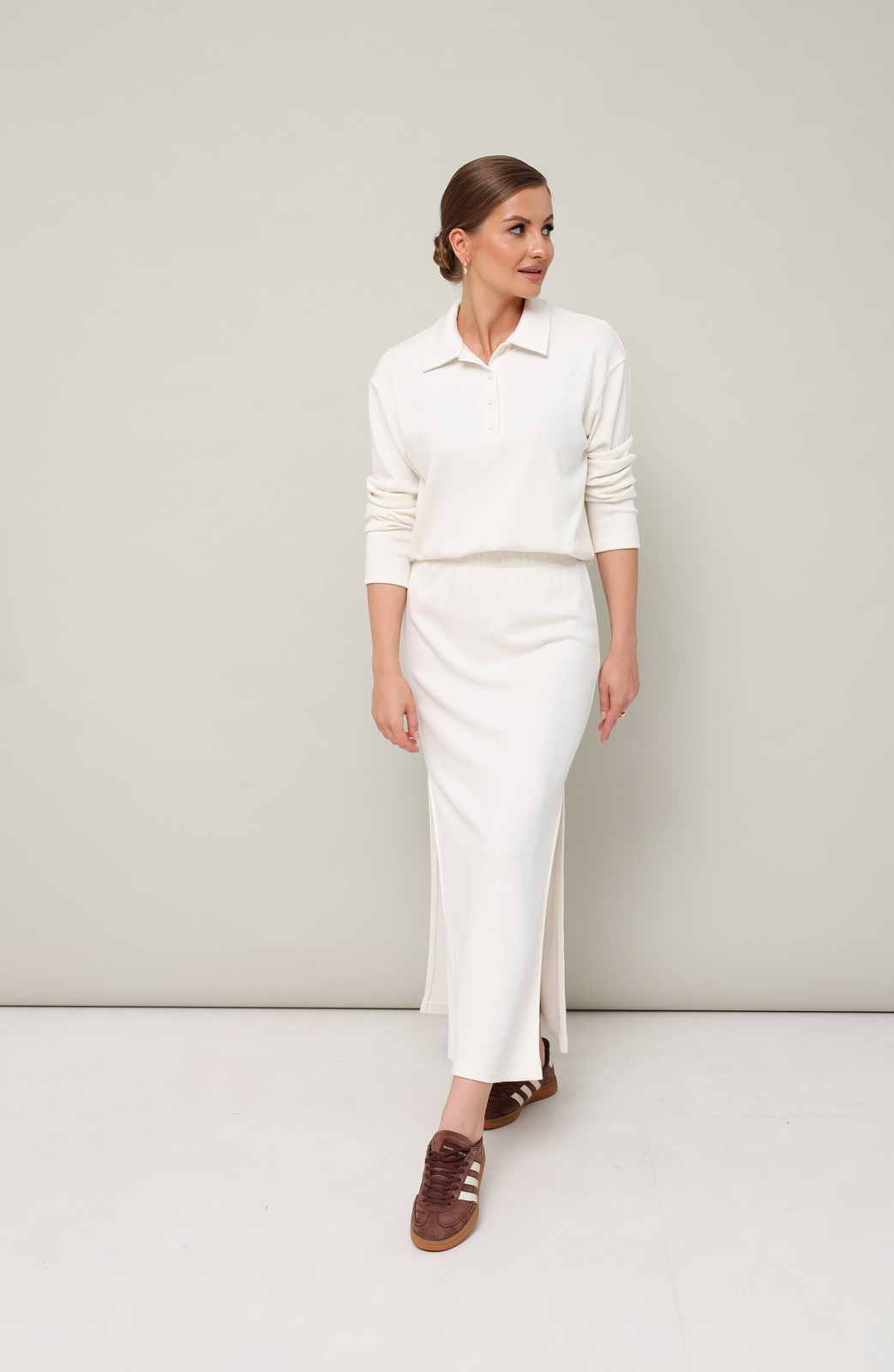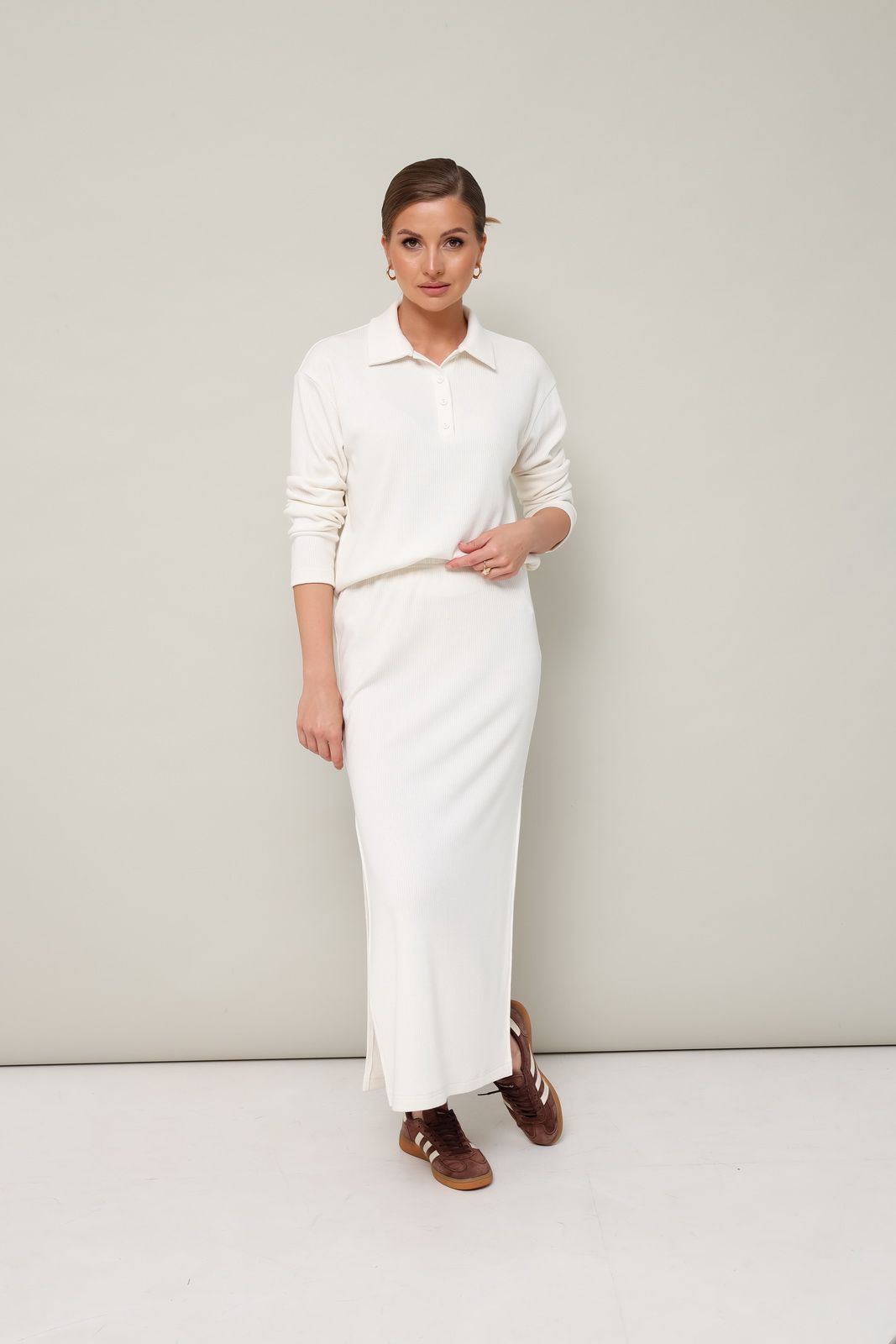 Описание: Комфортный трикотажный комплект, состоящий из поло и юбки. Поло с отложным воротником с цельнокроеной стойкой. Вырез горловины обработан притачными планками с застежкой на петли и пуговицы. Спущенная линия втачивания рукава. Юбка прямого кроя, пояс на резинке, в боковых швах обработаны высокие разрезы.