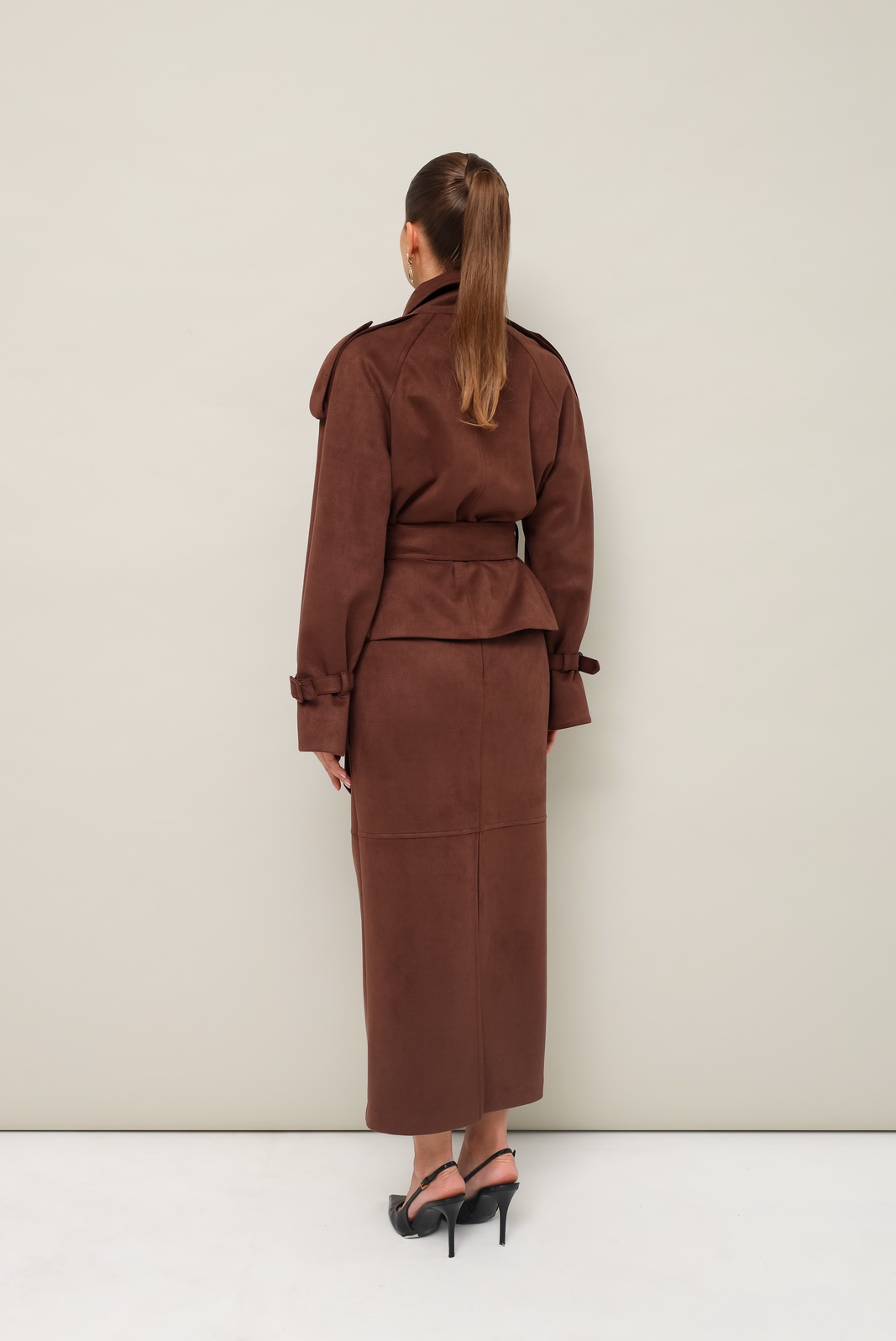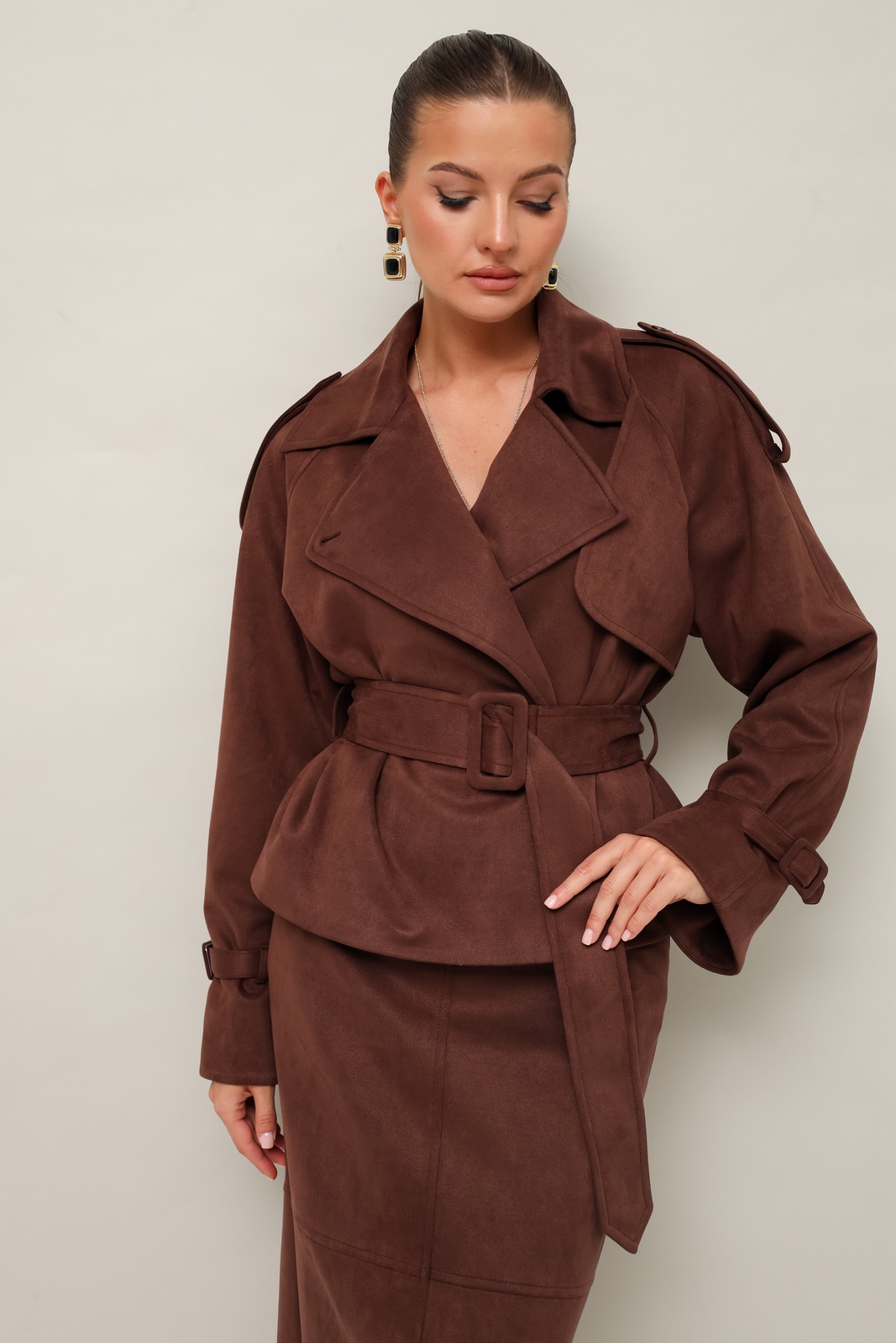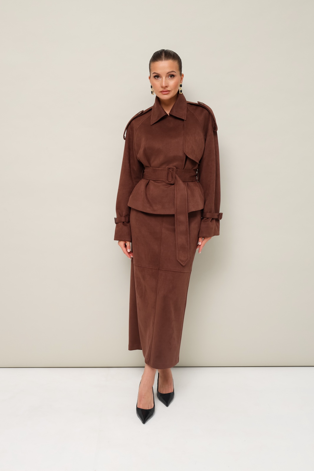 Описание: Стильный 2-предметный комплект, состоящий из жакета и юбки, выполненный из экозамши.