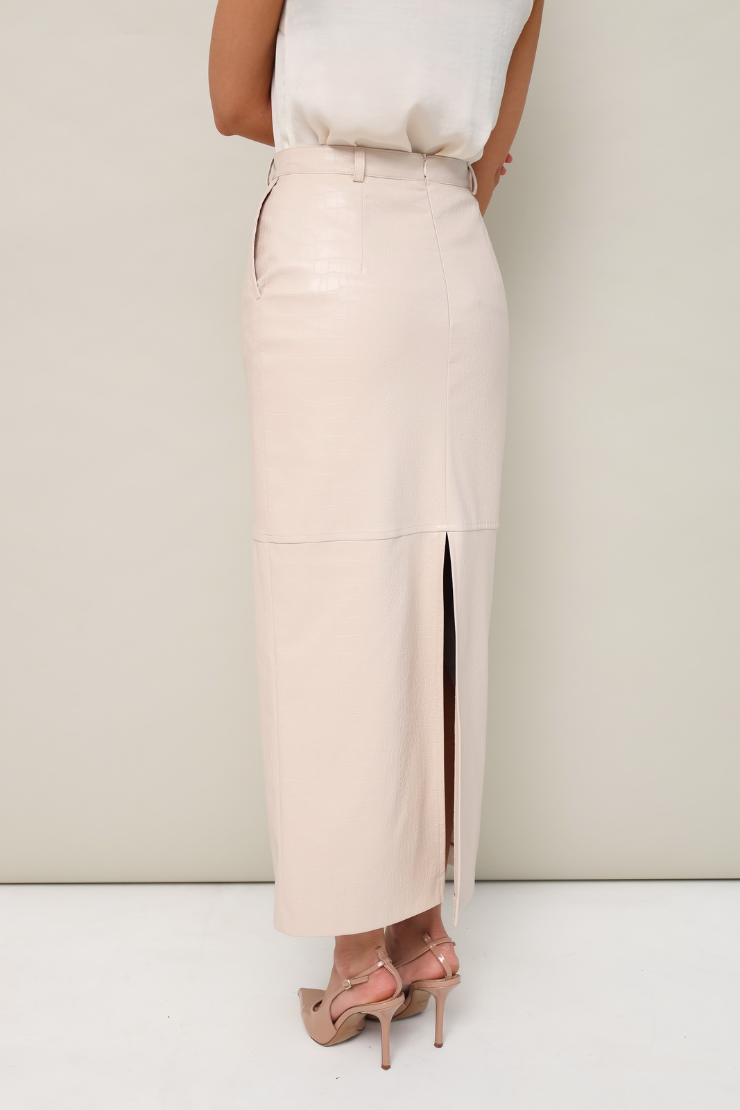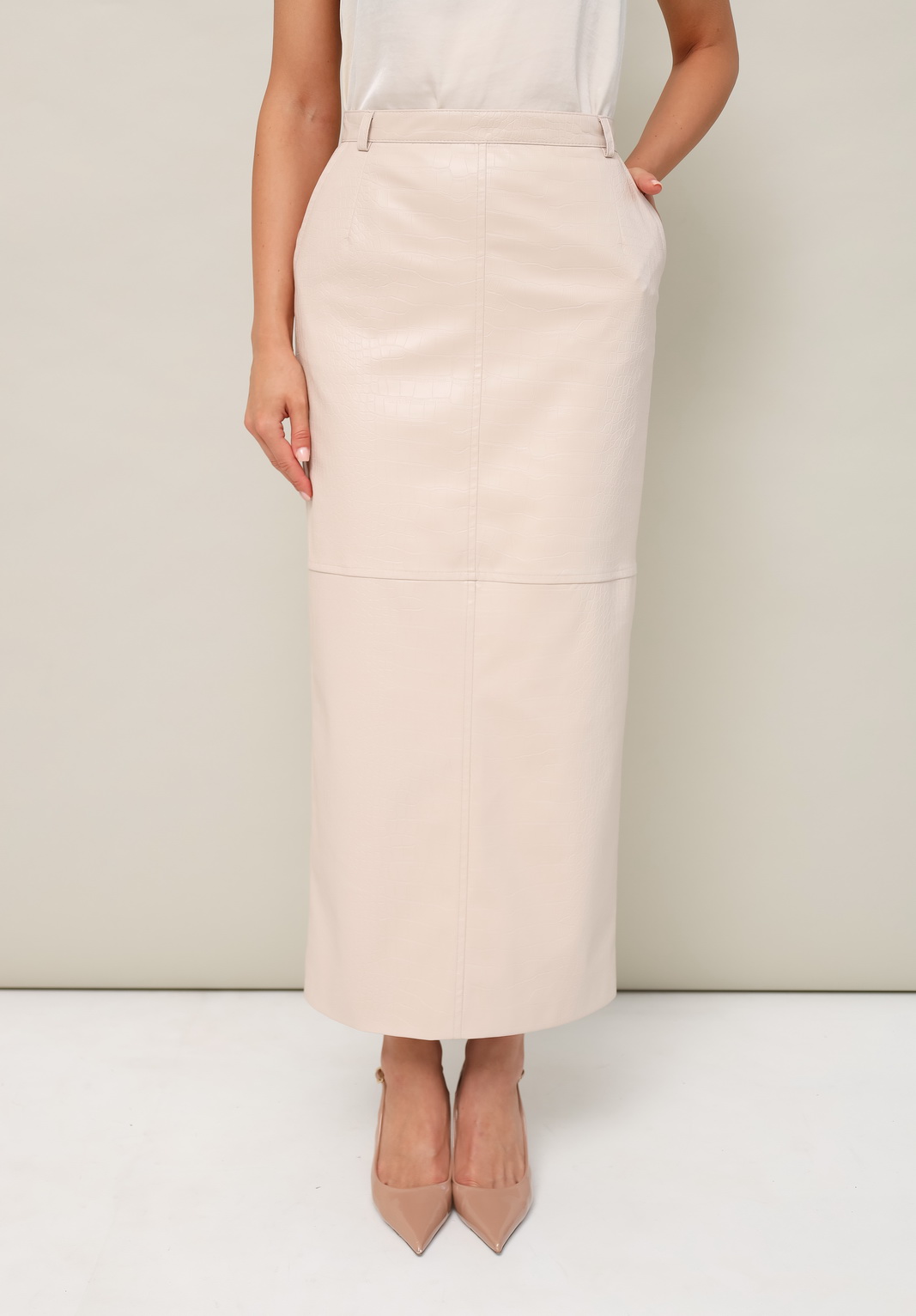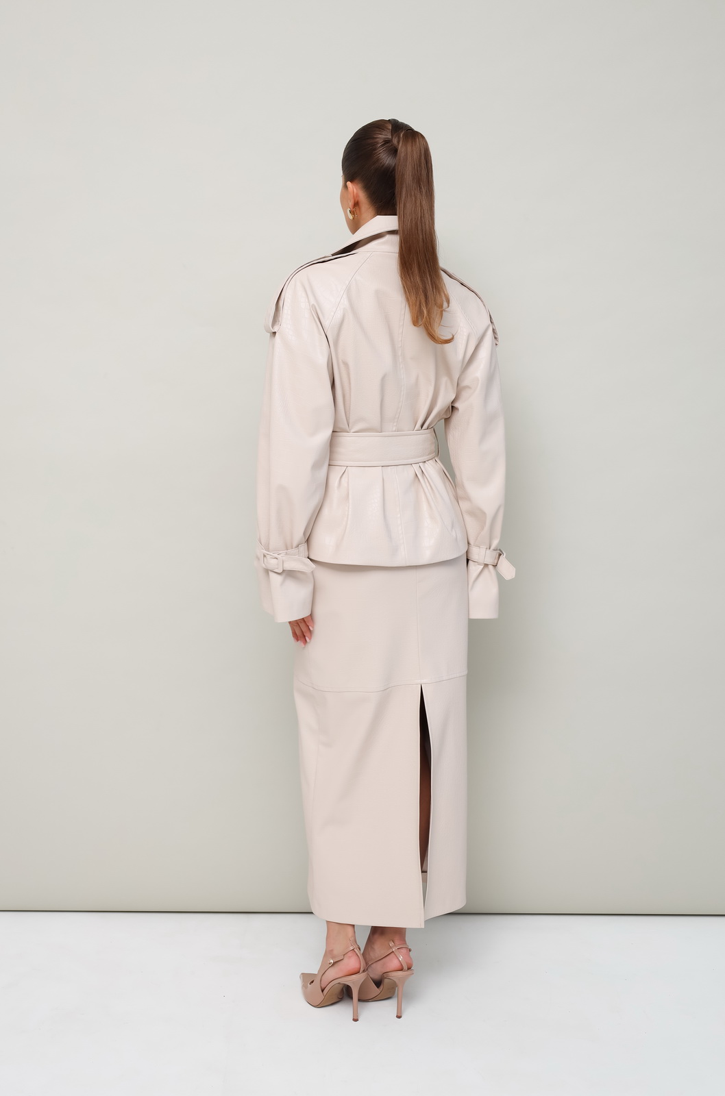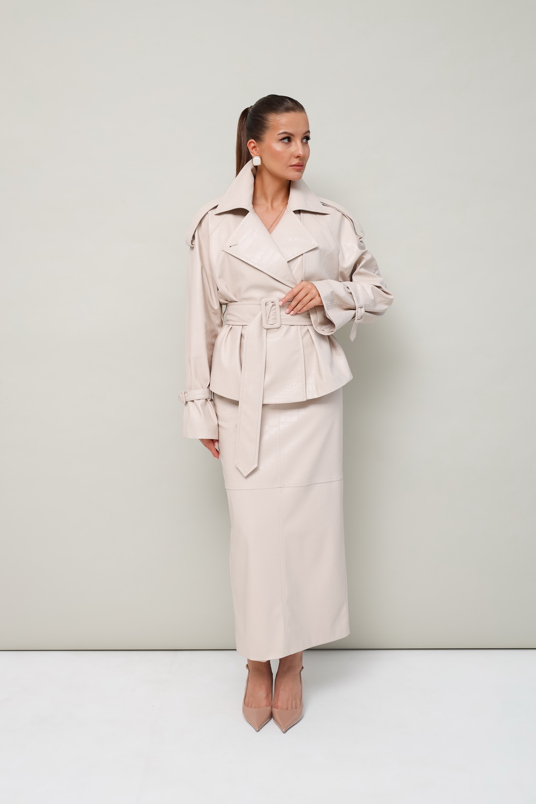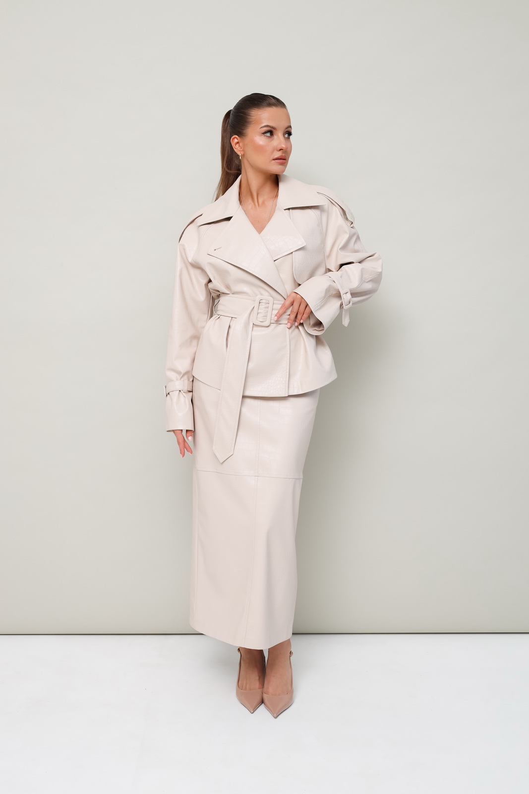 Описание: Стильный 2-предметный комплект, состоящий из жакета и юбки, выполненный из экокожи.