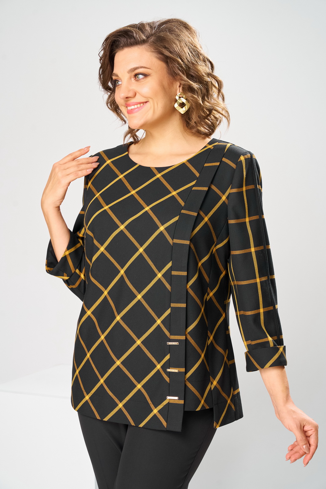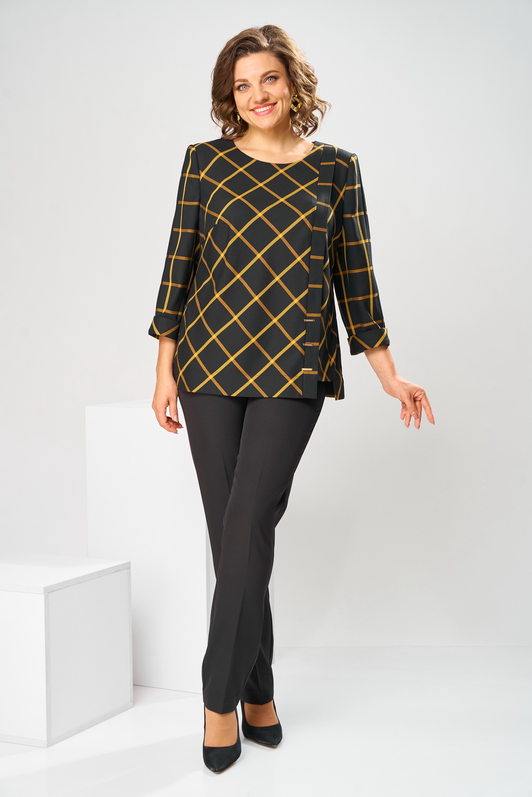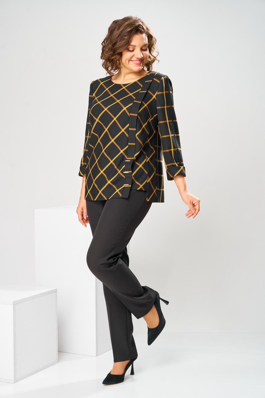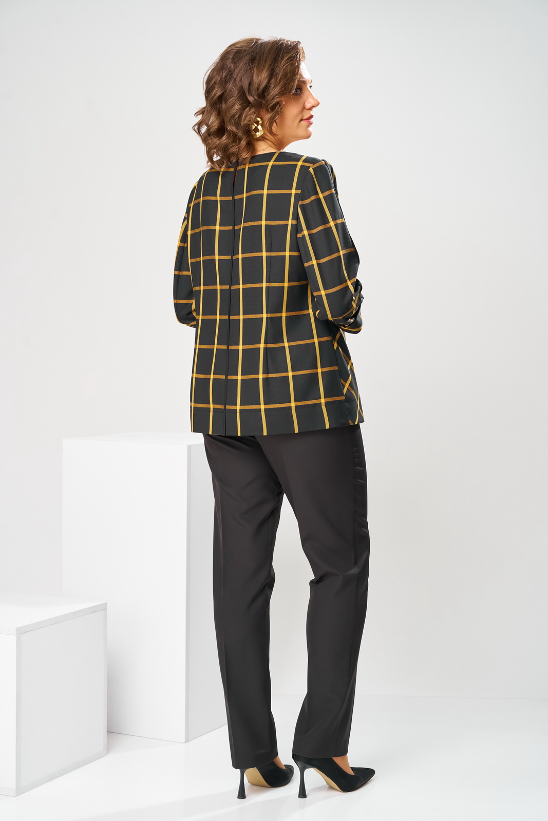 Описание: Костюм женский двухпредметный: блузон и брюки. Предназначен для повседневной носки. Блузон полуприлегающего силуэта, диной до линии бедер, с фигурным низом. Перед с одной нагрудной вытачкой, с отрезным рельефом, выходящим из плечевого шва, проходящим через центр груди и до низа, с отрезным бочком. Между центральной частью и рельефом вертикальная обтачная планка. Спинка с двумя талиевыми вытачками, средним швом, левая часть спинки окантована и закреплена на правой. Застежка на одну навесную петлю и одну пришивную пуговицу по горловине спинки. Горловина круглая, обтачная, без воротника. Рукав длиной 7/8. Верхний срез обработан и окантован. Рукав с притачной манжетой. Блузон с плечевыми накладками. Планка переда с тремя пришивными металлическими пластинами. Брюки длинные, слегка заужены к низу, со стрелками. Передние и задние половинки с двумя талиевыми вытачками. Застежка на потайную тесьму-молнию в среднем шве брюк на передних половинках. Верхний срез брюк с притачным поясом с эластичной тесьмой между боковыми швами и вытачками на задних половинок, застегивающийся на одну обметанную петлю и одну пришивную пуговицу. Длина спинки 65 см. Длина рукава 50 см. Длина брюк 103 см