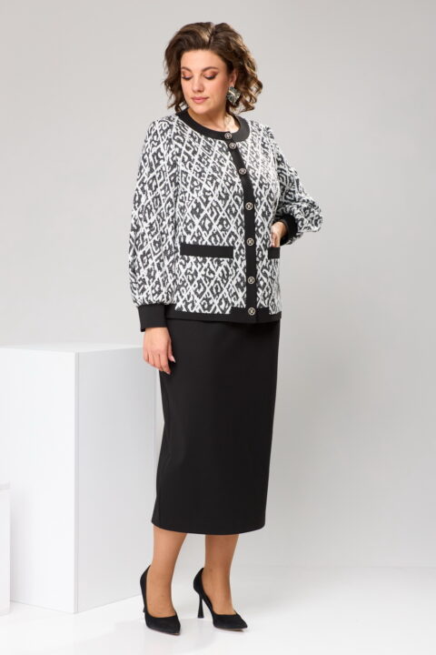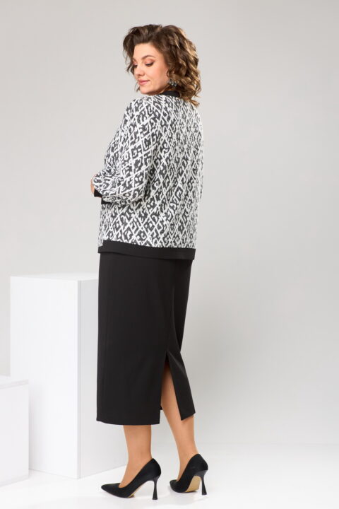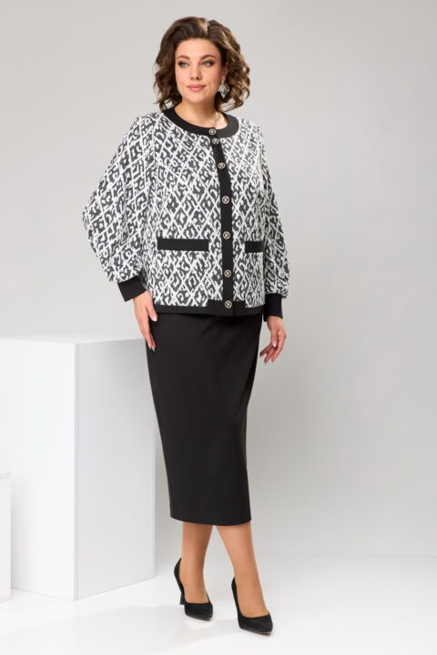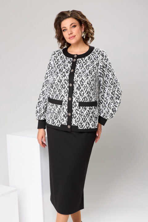 Описание: Костюм женский, предназначен для повседневной носки. Костюм женский 2-х предметный жакет и юбка. Жакет прямого силуэта, длиной до линии бёдер. Перед с 2-мя нагрудными вытачками, с 2-мя накладными прямоугольными карманами с притачной обточкой из отделочной ткани вверху; с приточными планками по горловине и краю борта из отделочной ткани. Спинка цельнокроеная. Жакет с притачной планкой по низу из отделочной ткани. Горловина круглая обточная, без воротника. Застёжка центральная, бортовая на 7-мь обмётанных петель и 7-мь пришивных пуговиц. Рукав втачной, одно шовный, длинный, внизу со встречной складкой и лёгкой сборкой, с притачной манжетой из отделочной ткани. Перед и спинка жакета на подкладке. Жакет с плечевыми накладками. Юбка женская карандаш, длиной до нижней части икры. Переднее полотнище цельнокроеное. Заднее полотнище с 2-мя таллиевыми вытачками и средним швом, заканчивающимся разрезом. Юбка с притачным поясом, собранным на эластичную тесьму. Юбка на подкладке. Длина спинки жакета 62 см, длина рукава 61,5 см. Длина юбки по боковому срезу 83 см.