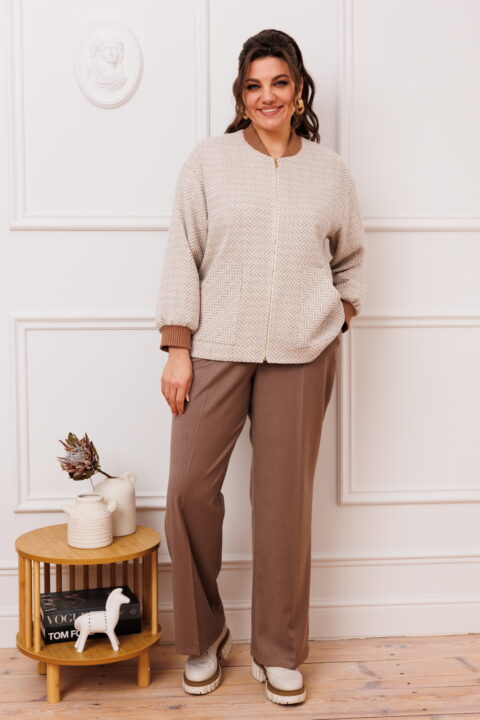 Состав ткани: Жакет: 65,5% ПЭ, 21,5 % хлопок, 9% вискоза, 4% полиамид. Брюки: 65% ПЭ, 33% вискоза, 2% спандекс