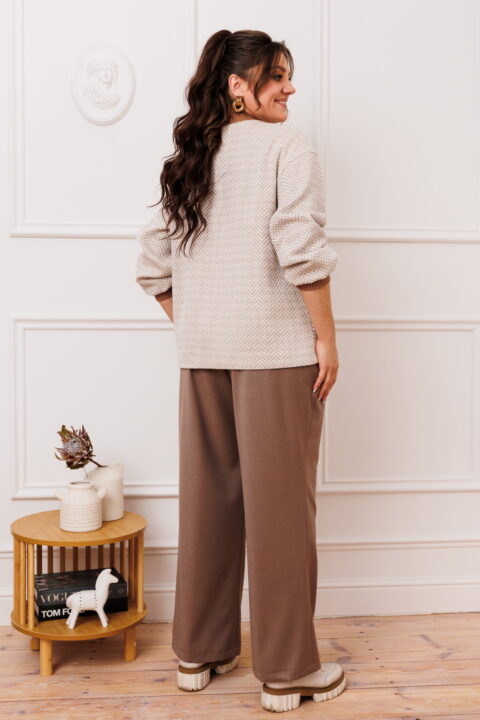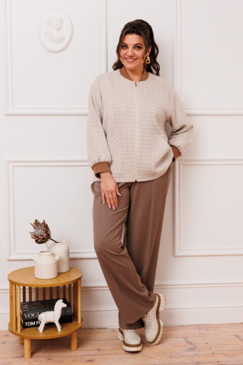 Описание: Костюм женский предназначен для повседневной носки. Костюм женский 2-х предметный жакет и брюки. Жакет женский прямого силуэта, длиной ниже линии бёдер. Перед с 2-мя нагрудными вытачками, с 2-мя накладными фигурными карманами. Спинка без конструктивных особенностей. Горловина круглая с втачной стойкой из отделочной ткани. Застёжка центральная бортовая на разъёмную тесьму-молнию. Жакет со спущенным плечом. Рукав втачной одно шовный, длинный с притачной манжетой из отделочной ткани. Жакет на притачной подкладке. Жакет без плечевых накладок. Брюки женские прямые длинные. Передние половинки с карманами в боковых швах с отрезным бочком. Задние половинки с таллиевыми вытачками. Брюки с притачным поясом, частично собранным на эластичную тесьму, закреплённую 2-мя отделочными строчками. Длина спинки жакета 65 см. Длина брюк по боковому срезу 103 см
