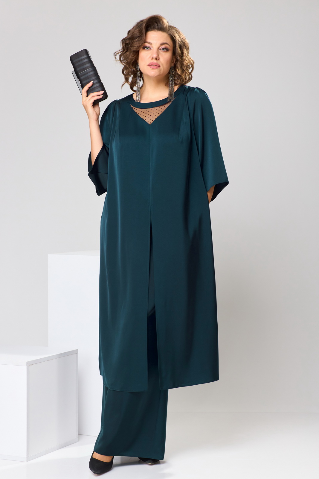 Описание: Комплект женский, относится к торжественной одежде. Комплект женский 2-х предметный туника и брюки. Туника женская, прямого силуэта, длиной до середины икры. Перед с 2-мя нагрудными вытачками, выходящими из плечевых швов, со средним швом, заканчивающимся разрезом, с отрезной планкой по горловине, с V-образной вставкой из отделочной ткани. Спинка со средним швом, заканчивающимся разрезом. Боковые швы с разрезами. Горловина круглая, обточная без воротника. Рукав втачной, одно шовной длиной 3/4 с фигурным низом и встречной складкой по центру оката. Туника без плечевых накладок. Брюки женские прямые, длинные. Передние половинки с карманами в боковых швах. Задние половинки с таллиевыми вытачками. Брюки с притачным поясом, собранным на эластичную тесьму, закреплённую 2-мя отделочными строчками. Длина спинки туники 119см, длина рукава 41 см. Длина брюк по боковому срезу 103 см.