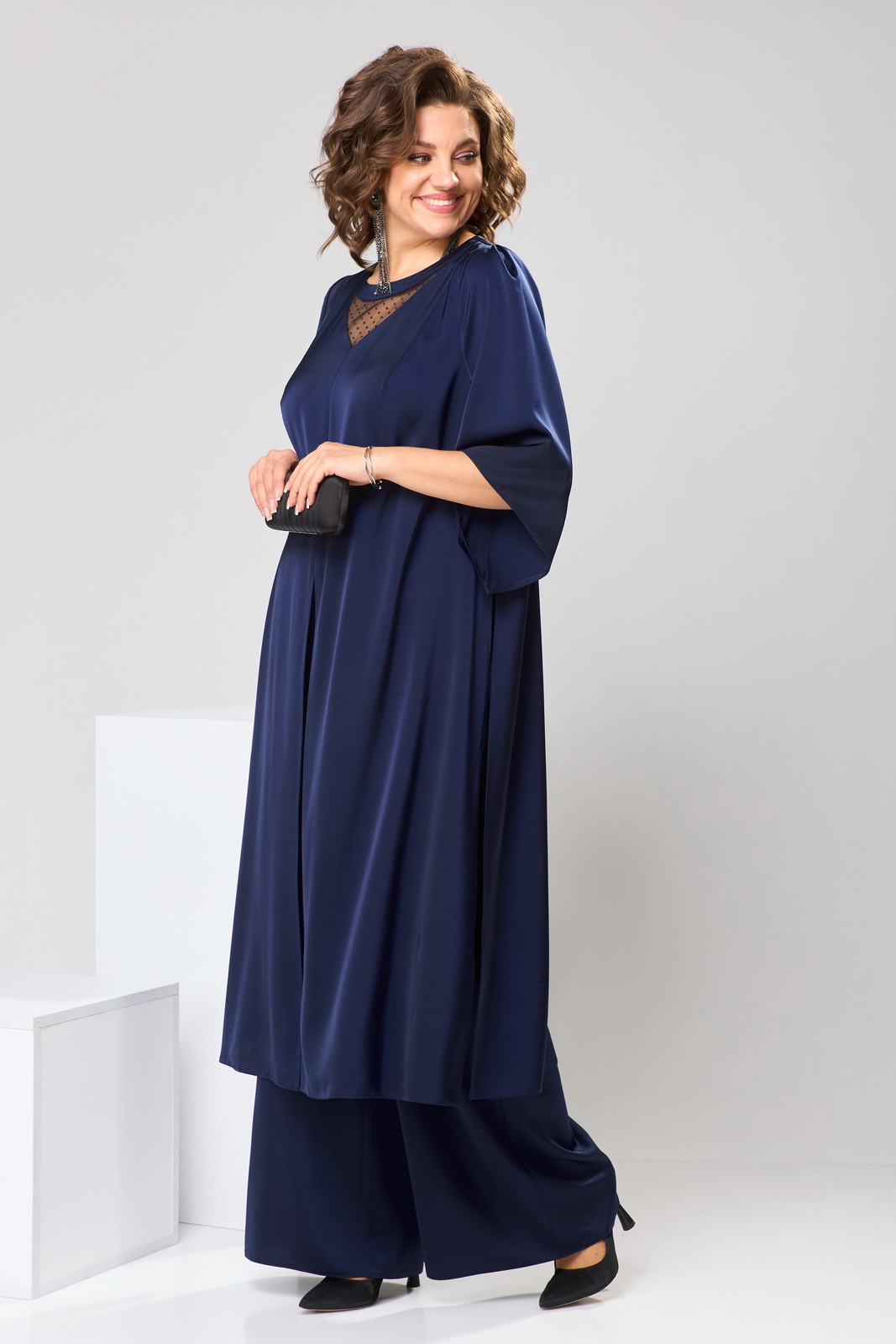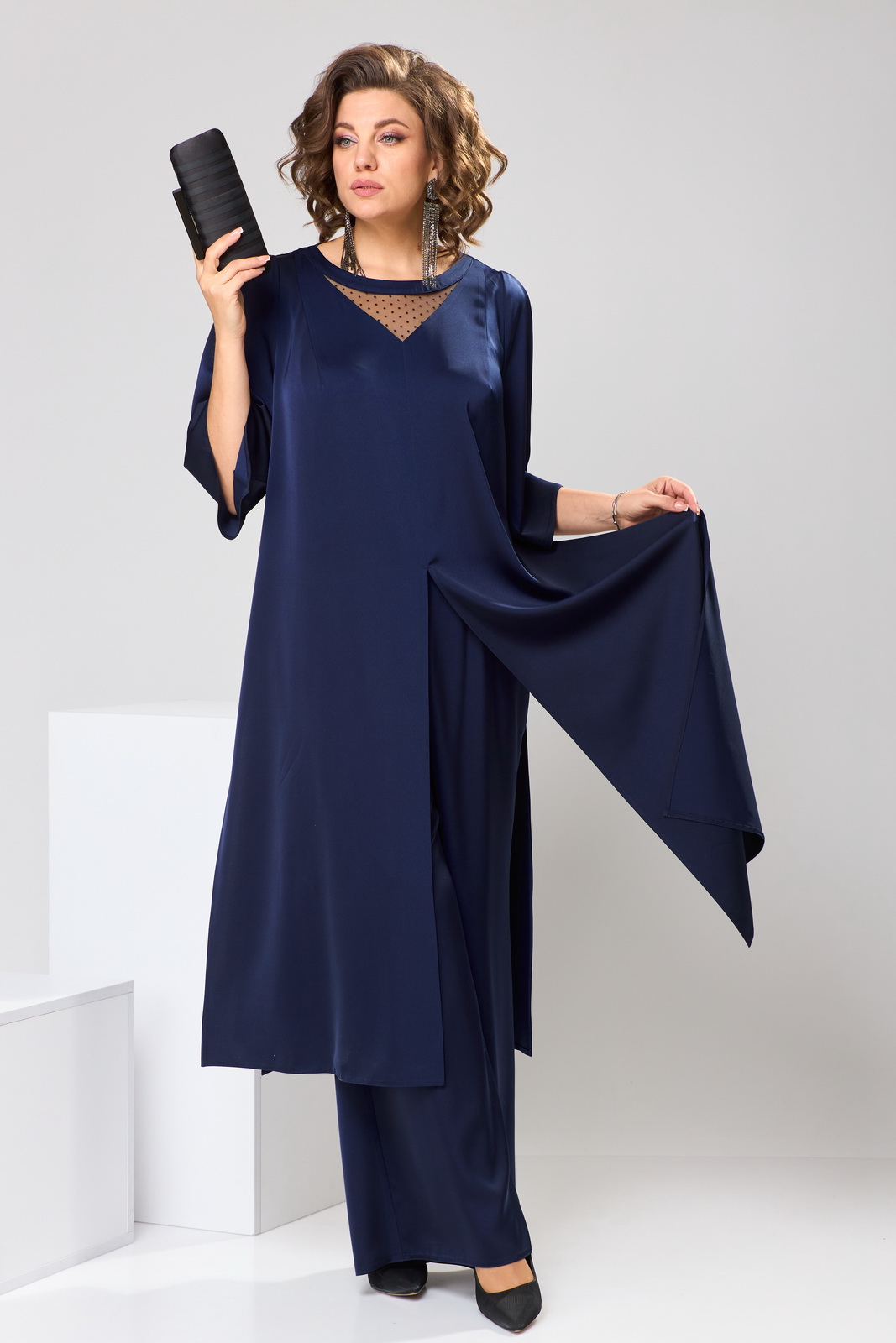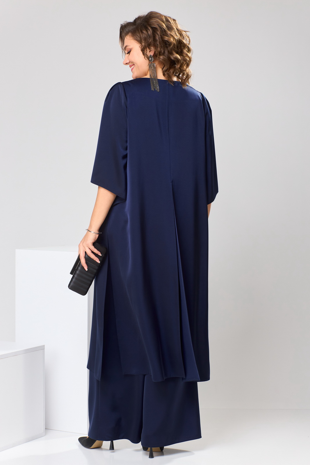 Описание: Комплект женский, относится к торжественной одежде. Комплект женский 2-х предметный туника и брюки. Туника женская, прямого силуэта, длиной до середины икры. Перед с 2-мя нагрудными вытачками, выходящими из плечевых швов, со средним швом, заканчивающимся разрезом, с отрезной планкой по горловине, с V-образной вставкой из отделочной ткани. Спинка со средним швом, заканчивающимся разрезом. Боковые швы с разрезами. Горловина круглая, обточная без воротника. Рукав втачной, одно шовной длиной 3/4 с фигурным низом и встречной складкой по центру оката. Туника без плечевых накладок. Брюки женские прямые, длинные. Передние половинки с карманами в боковых швах. Задние половинки с таллиевыми вытачками. Брюки с притачным поясом, собранным на эластичную тесьму, закреплённую 2-мя отделочными строчками. Длина спинки туники 119см, длина рукава 41 см. Длина брюк по боковому срезу 103 см.