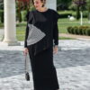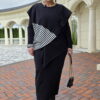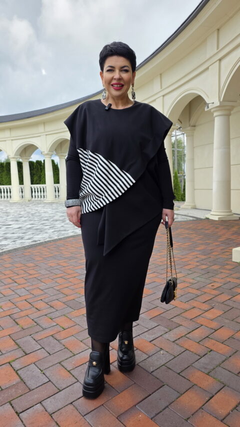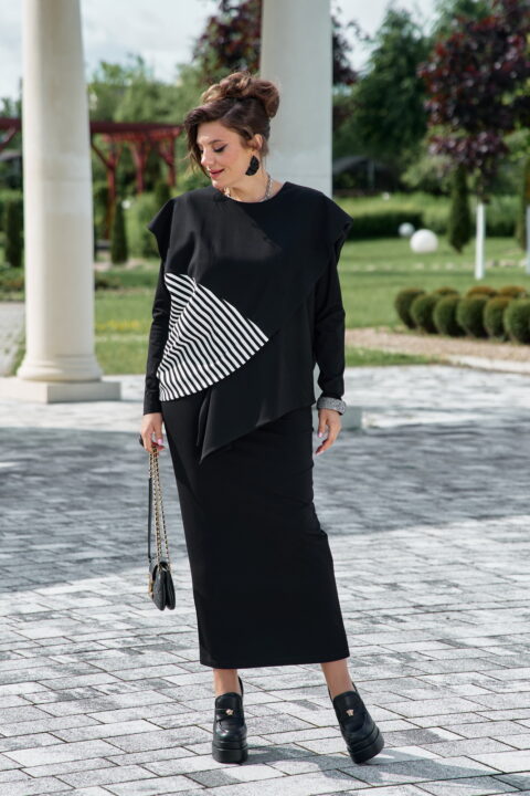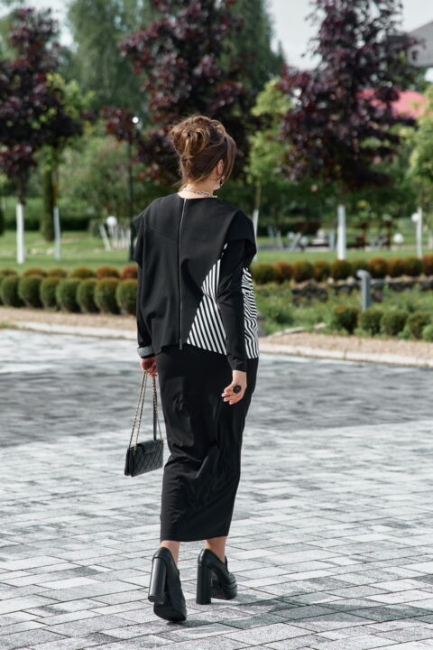 Описание: Комплект женский, состоящий из джемпера и платья. Асимметричный джемпер, объемный, его оверсайз-силуэт делает образ дерзким и одновременно изысканным. Горловина округлой формы, линия плеча спущена, линия проймы углублённая. По переду джемпера декоративная отлетная складка, фигурный подрез со вставкой из отделочной ткани в полоску преходящая на спинку. Низ завершает отлетная деталь — неструктурированный волан, который живет своей жизнью, колышется при каждом шаге, добавляя динамики и легкости массивному верху. Он не пришит намертво, он «отлетает», создавая ощущение незавершенности и художественного хаоса. Спинка в джемпере с застёжкой на декоративную тесьму молнию в среднем шве, декоративным подрезом. Низ спинки джемпера фигурной формы. прилегающего силуэта, длины миди. Горловина округлой формы. Рукав в платье втачной. Спинка без особенностей. Длина миди и длинные рукава платья создают изящный и лаконичный силуэт.Длина платья 121 см (р.50-54), 121,5 см (р.56-60), длина рукава платья 64 см. Длина джемпера 55 см,