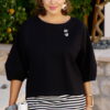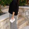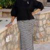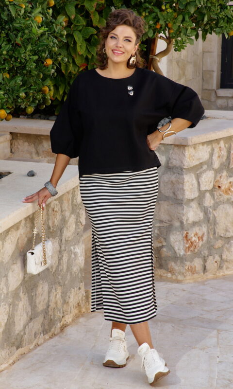 Описание: Стильный и универсальный комплект идеально подойдёт для тёплых осенних дней. Благодаря своему удобству и универсальности, этот комплект станет отличным выбором для повседневной носки, а так же для создания разнообразных образов в зависимости от настроения и ситуации. Комплект состоит из однотонной блузки чёрного цвета и юбки в полоску длины «миди».Блузка свободного силуэта, с фигурной линией горловины по форме «лодочка», низ в блузке ассиметричный, линия плеча спущенная. Спинка с декоративными вытачками от низа блузки. Рукав втачной с вытачками от низа, которые придают рукаву декоративную форму «фонарика». В качестве отделки данной модели- по переду блузки украшение в виде декоративных брошек в форме сердечек. Юбка прямого силуэта, длины «миди» с разрезами в боковых швах. Пояс в юбке цельнокроеный на резинке, что обеспечивает максимально удобную посадку на любой тип фигуры. Длина блузки от высшей точки плечевого шва до низа 66 см (р.50-54), 68 см (р.56-60). Длина рукава 28 см (р.50-54), 26,5 см (р.56-60). Длина юбки по боковому с поясом 88 см.