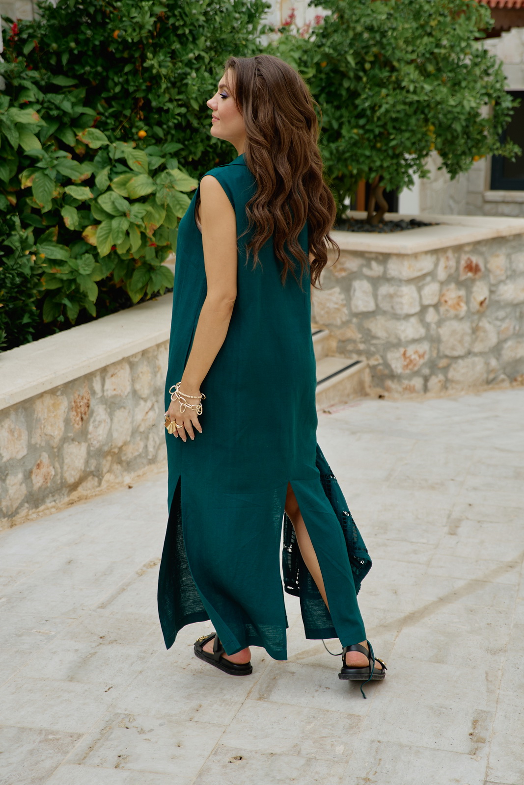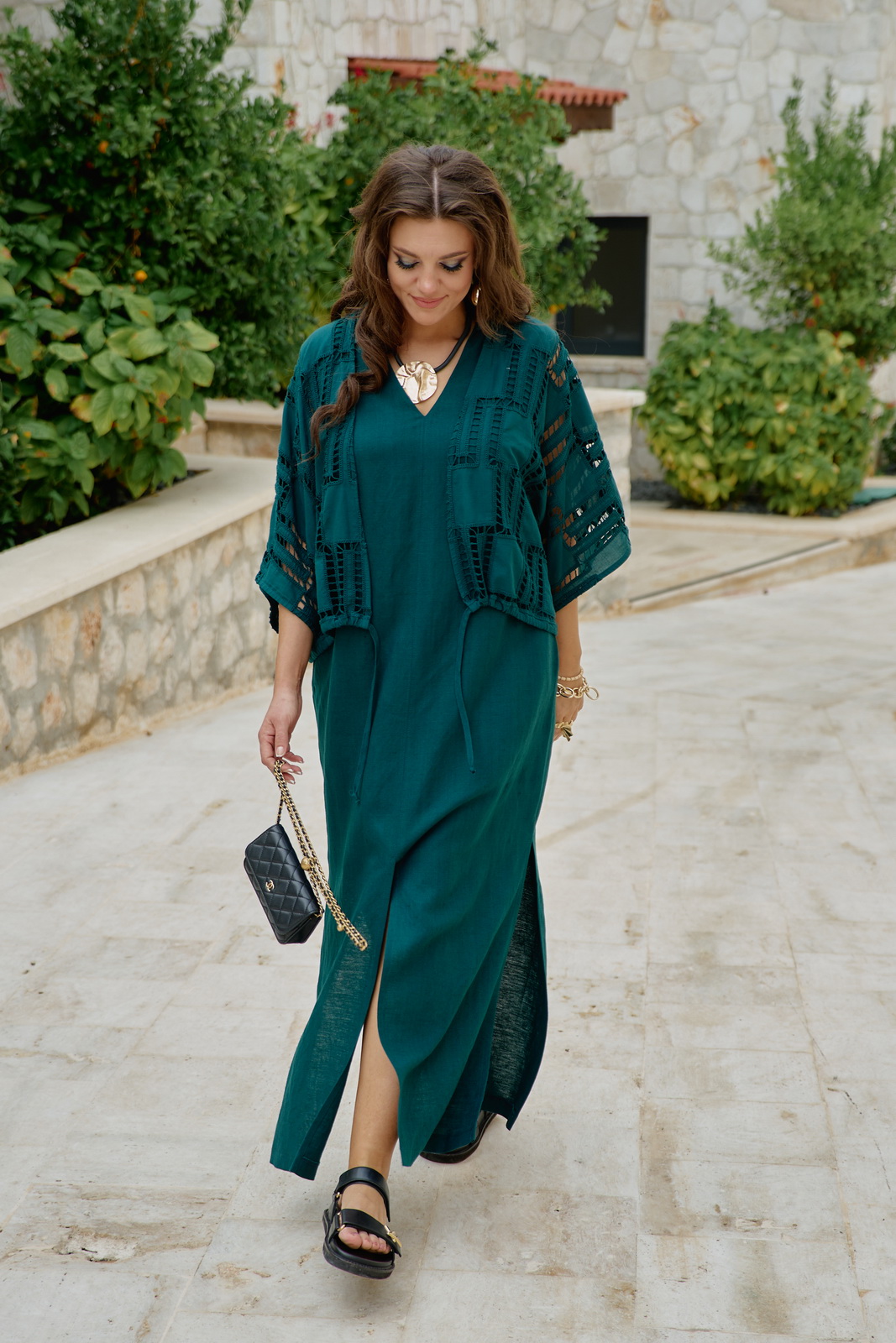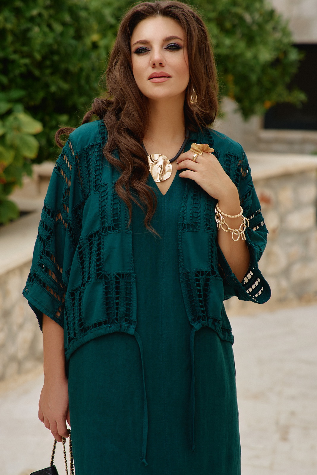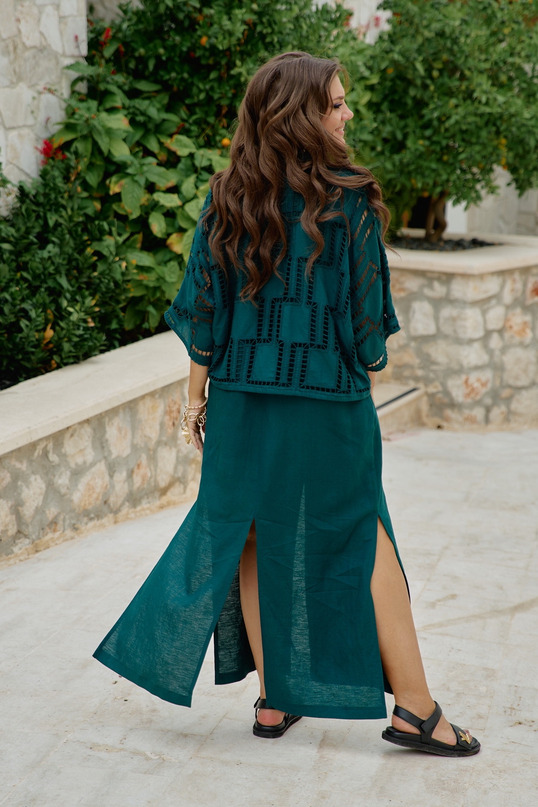 Описание: Комплект женский, состоящий из блузки и платья. Этот комплект — диалог двух противоположностей, которые находят совершенное единство. С одной стороны — вышивка ришелье, сотканная из тончайших нитей и ажурных прорезей. С другой — плотный лён. Вместе они создают образ одновременно утончённый и основательный, лёгкий и монументальный. Несмотря на контраст, обе ткани объединены общей философией. Этот комплект — для женщины, которая любит качественные материалы — ценит тактильные ощущения и долговечность. Состав: платье 53% лён, 47% вискоза, блузка 100% хлопок. Блузка свободного силуэта, без застёжки. Рукав в блузке цельнокроеный. По низу функциональная кулиса со шнуром, которая помогает подчеркнуть силуэт, при желании. Блузка выполнена из ажурной ткани ришелье, которая задаёт акцент комплекту. Платье свободного, А-силуэта, длины «в пол», на широких бретелях. Горловина в платье имеет плавный V-образный вырез. По переду и спинке, а также в боковых швах платья высокие разрезы, которые придают образу лёгкости. В боковых швах платя карманы. Идеален для жаркого лета. В жару лён дышит, а ришелье даёт необходимую лёгкость. В прохладный день комплект согревает своим благородным видом.