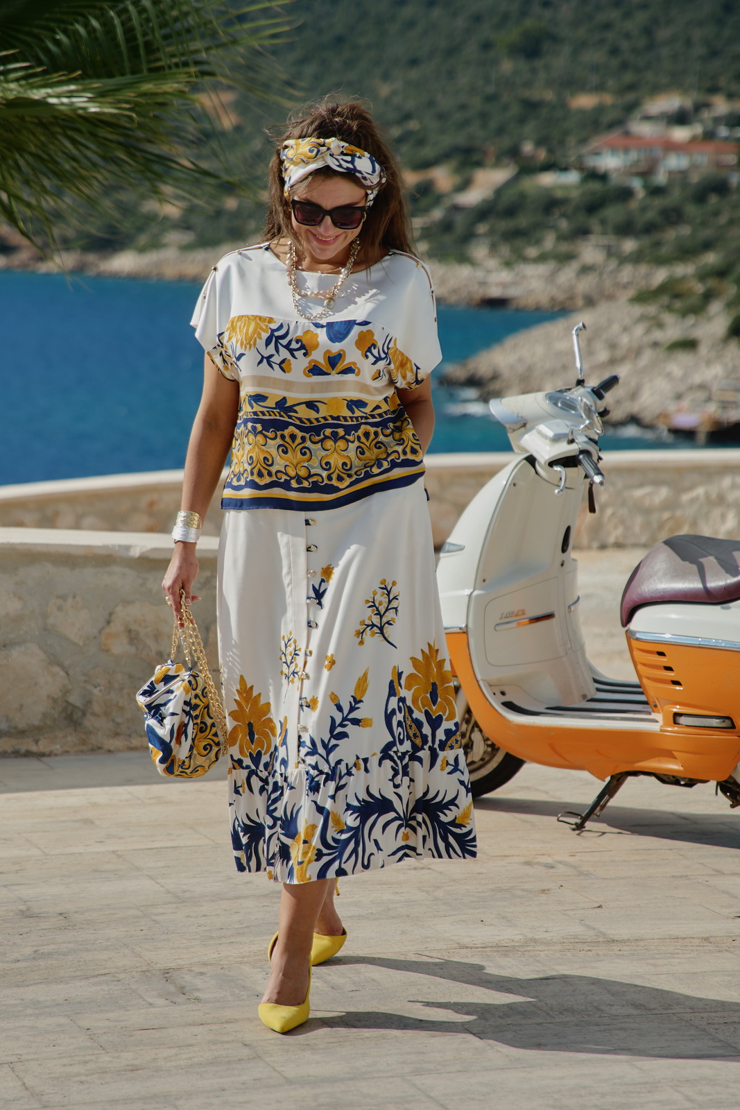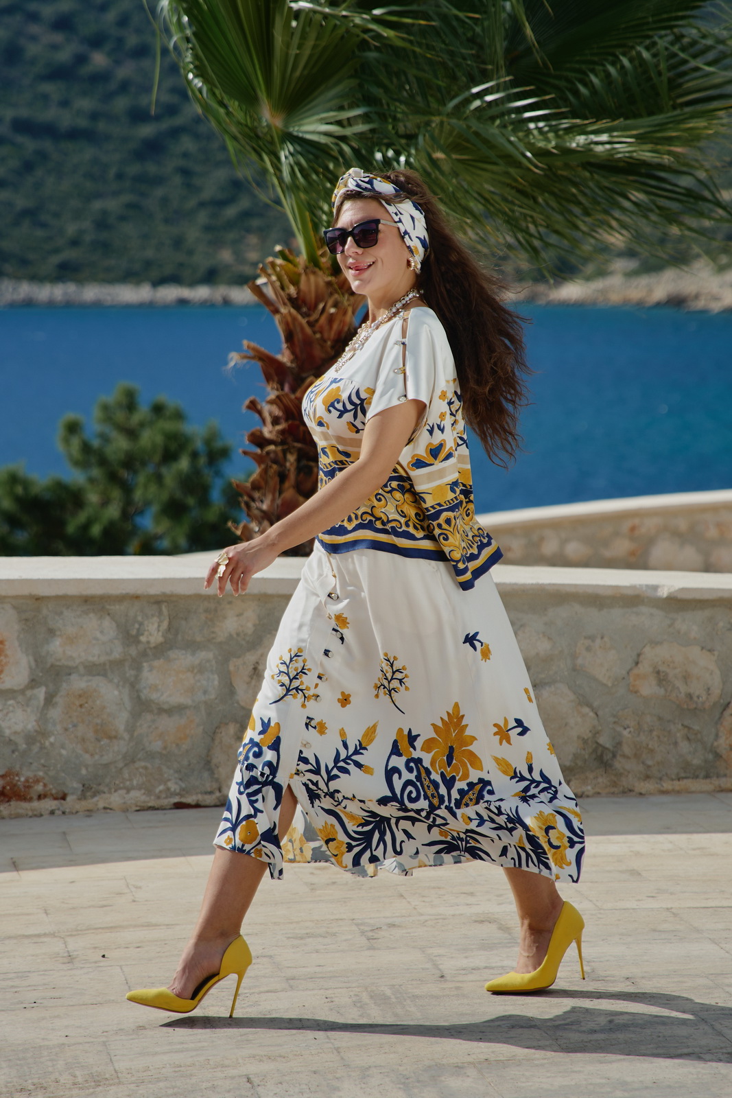 Описание: Костю женский состоящий из блузы и юбки. Этот костюм — не просто одежда, а перенесённый на ткань кусочек итальянского лета. Яркий цветочный принт на светлой основе напоминает о залитых солнцем тосканских холмах, о внутренних двориках с терракотовыми горшками, о рынках, где горами лежат спелые овощи и фрукты. Это гимн средиземноморской радости жизни, воплощённый в блузе и юбке. Принт — это не случайный узор, а тщательно составленная композиция, вдохновлённая итальянской флорой и искусством. Блуза сконструирована так, чтобы быть одновременно удобной и изысканной. Крой — свободный, горловина округлой форм, линия плеча спущенная. По плечу декоративная застёжка в виде «навесных» петель и пуговиц, которая придаёт блузе лёгкости. По переду и спинке отрезная кокетка из однотона. В боковых швах от низа разрезы. Юбка — это продолжение блузы. Форма — трапециевидная, расширяющаяся от талии. Объём достаточный для свободы движения, но не переходящий в пышность. Длина «миди» создаёт более романтичный образ. Пояс в юбке притачной, на обтачке, по переду имитация застёжки на «навесные» петли и пуговицы. По низу юбки притачной волан со сборкой от подреза. Этот костюм для женщины, которая: любит жизнь — во всей её полноте и яркости. Ценит искусство — понимает, что одежда может быть произведением искусства. Обладает темпераментом — не боится быть заметной, но делает это со вкусом.