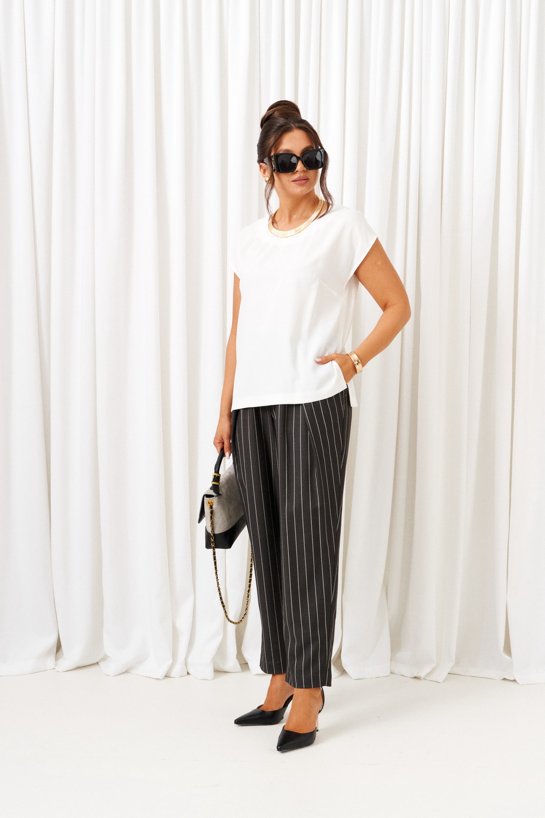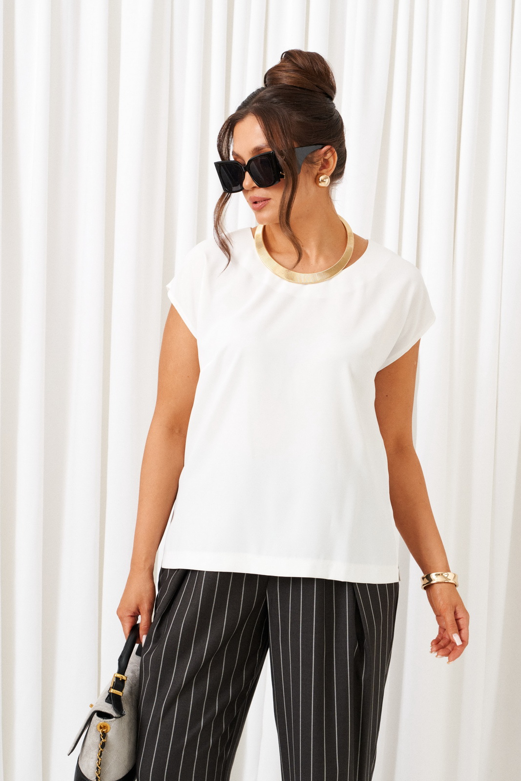 Брюки напоясе, в задней части которого для удобного прилегания по талиивставлена резинка. Блузкаполуприлегающего силуэта.